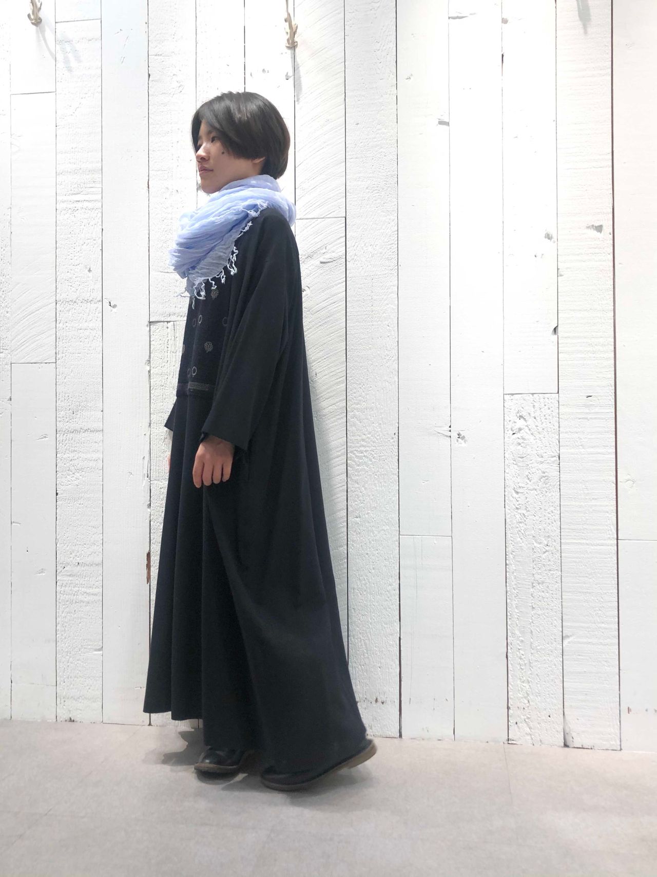 ネイビーのワンピースに、淡いマリンブルーのストールが映えますね。