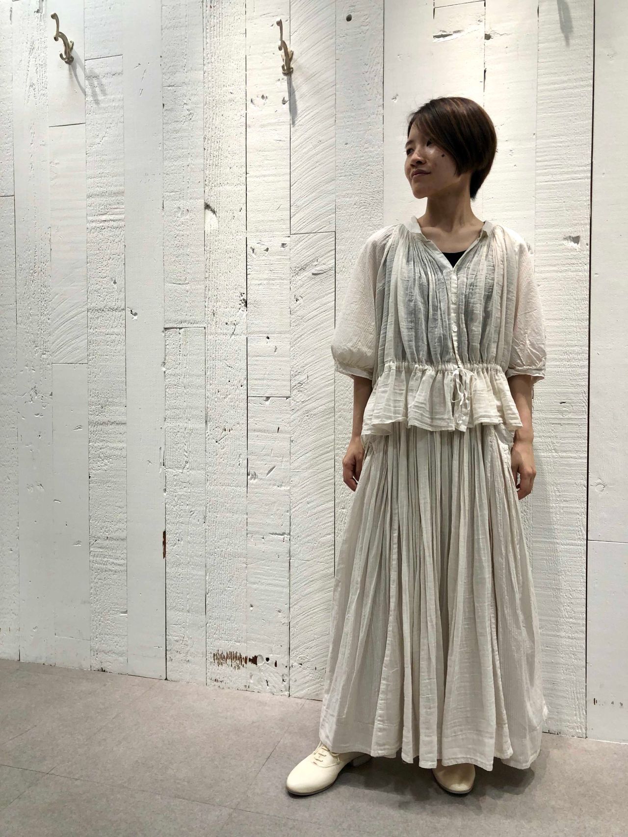 ブラウスもスカートも、ギャザーがたっぷりと入っているためフェミニンな雰囲気に。
