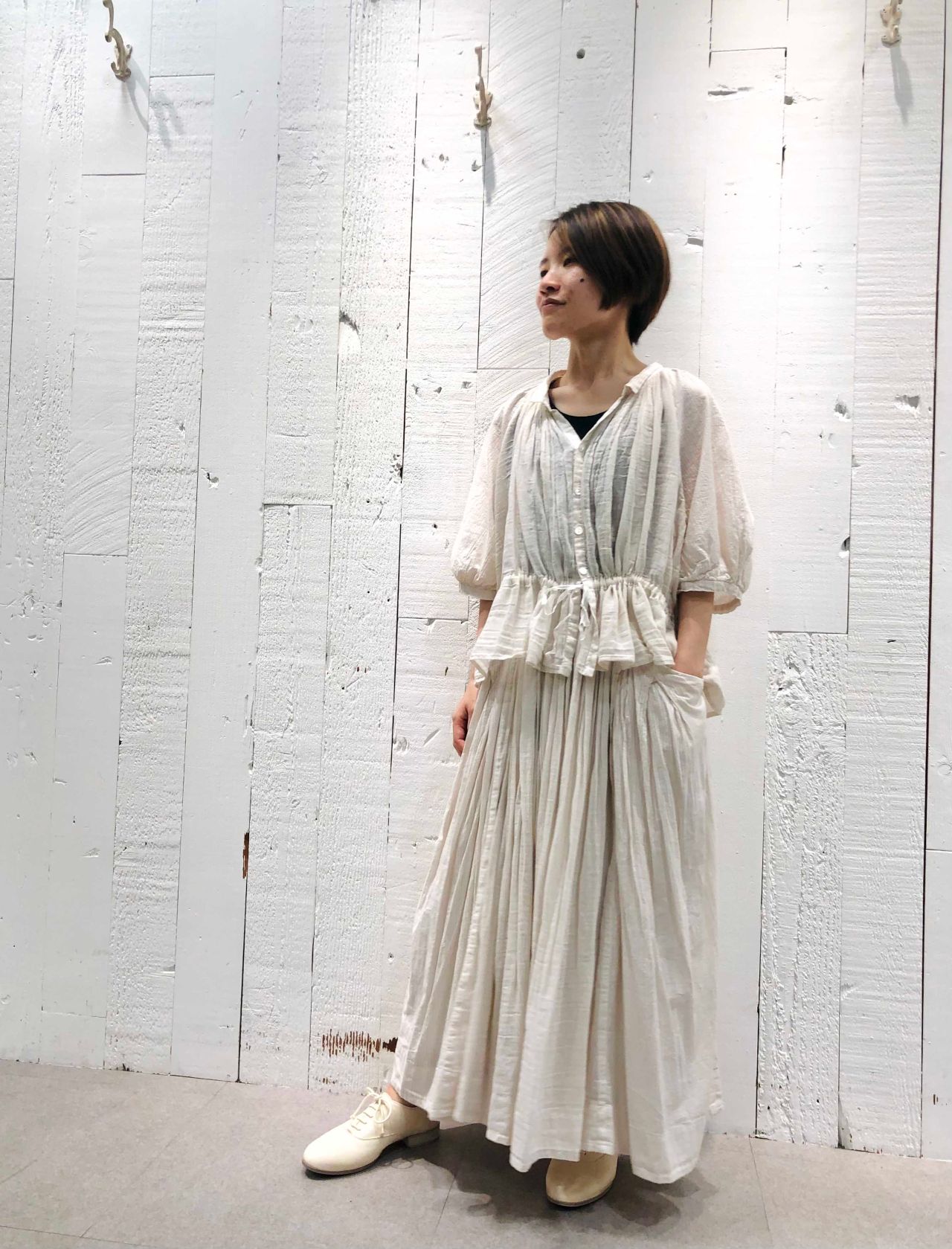 ウエストの紐を絞ると前身頃にギャザーが寄るのでお好みの絞り具合を探してみてくださいね。