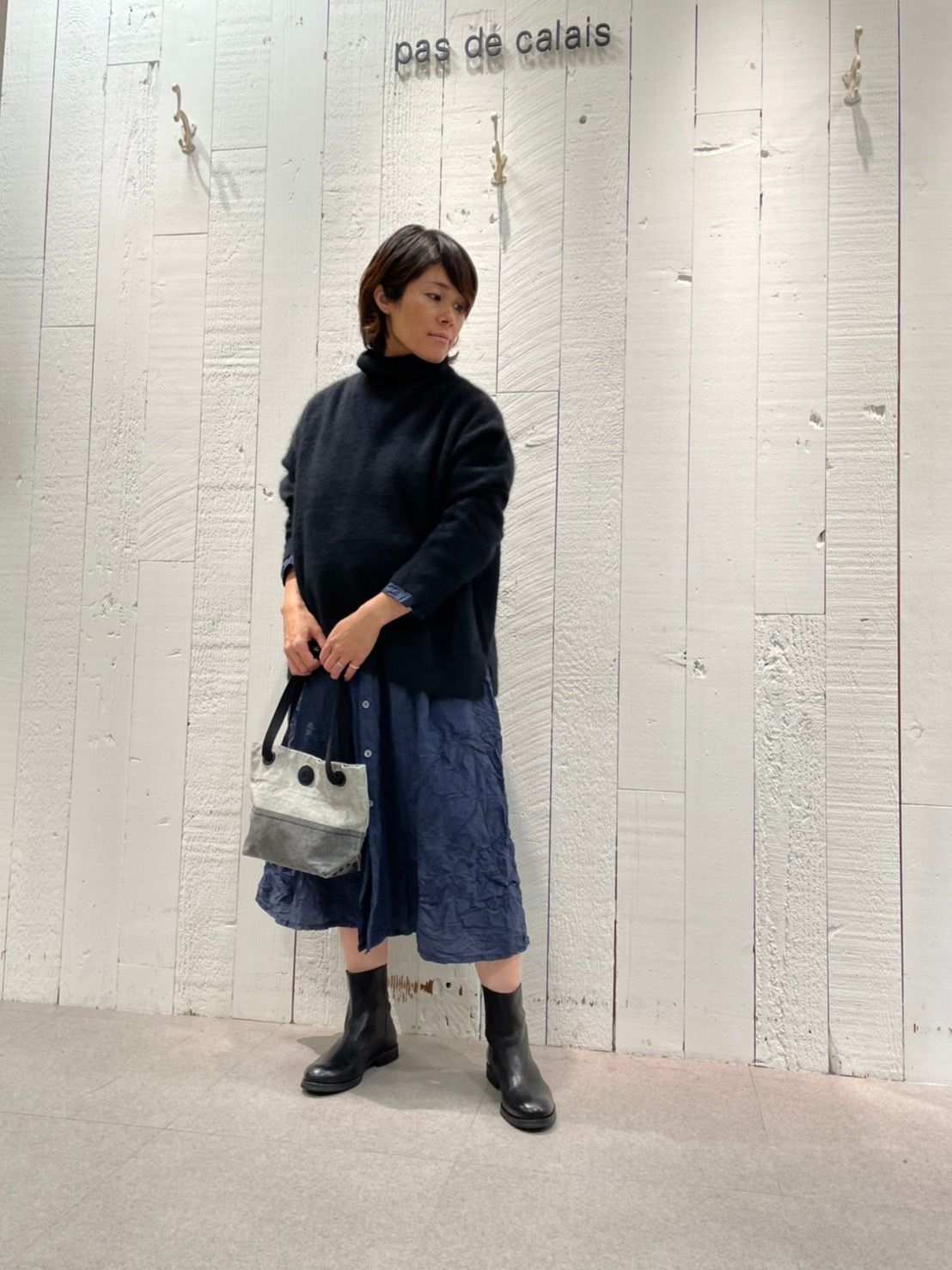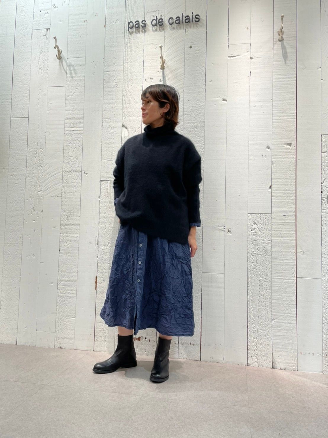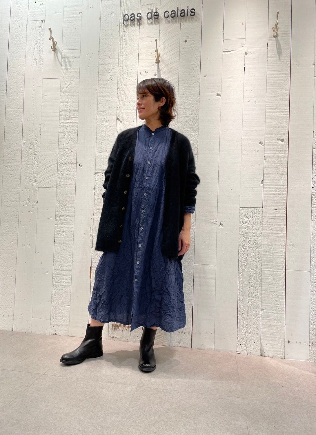 立体的なシワが魅力的なワンピースは織物の産地浜松で織られたとても軽い着心地の1枚。さらにステッチを入れてから染める事で生地に表情のある縮みも生まれ風合いが増したパドカレのこだわり。