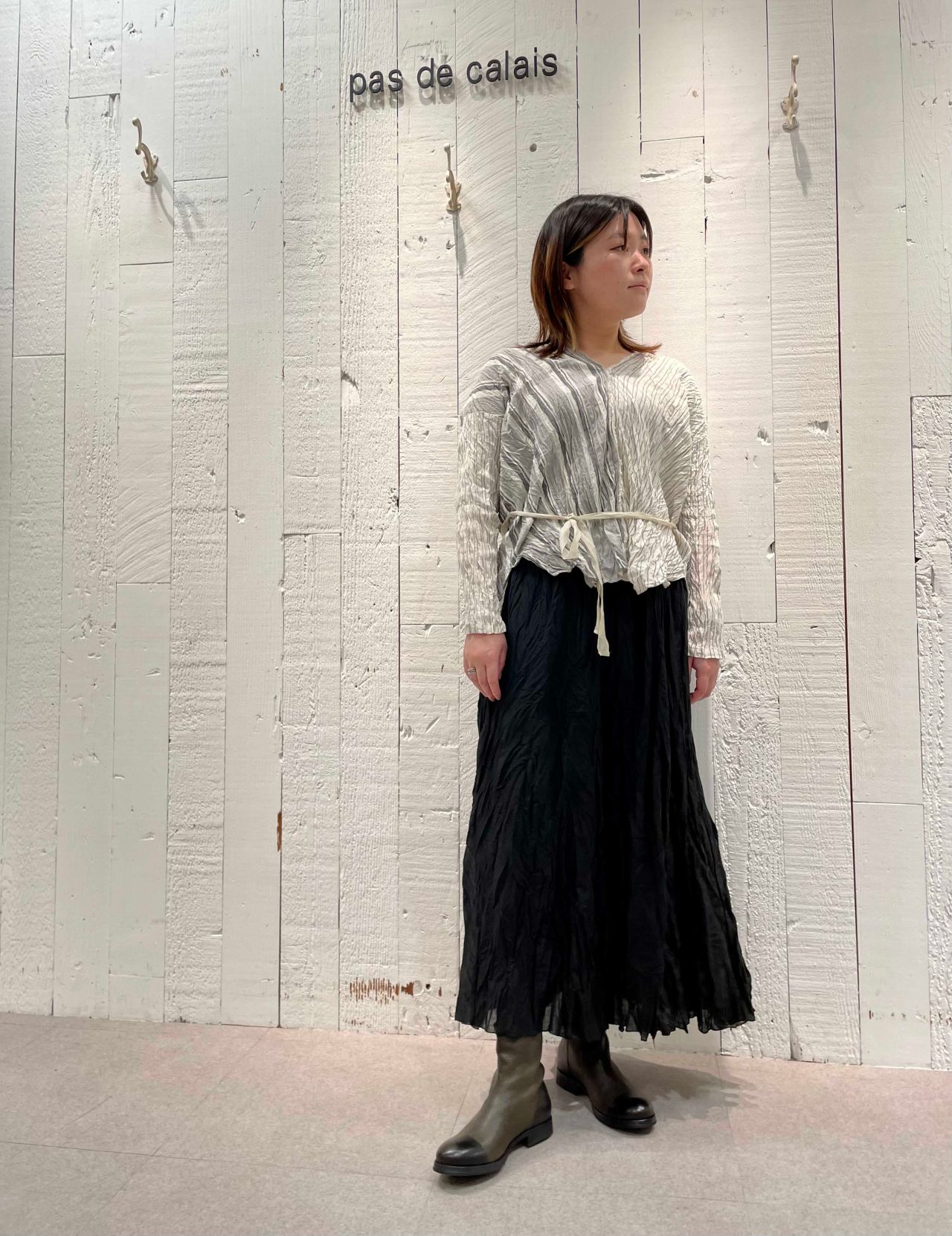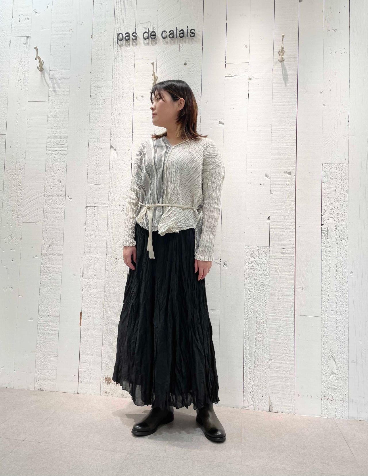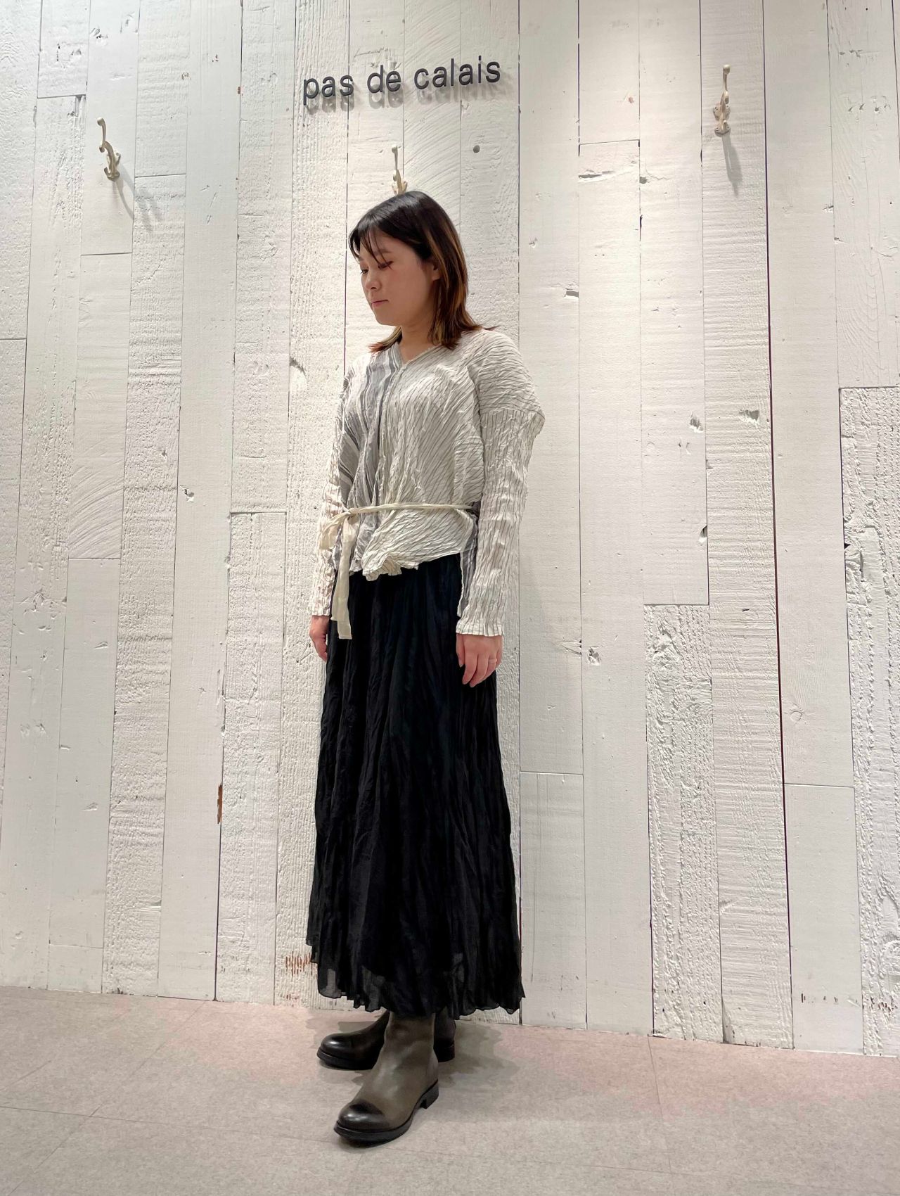 かっちりとした雰囲気でも、着やすさも感じられる所がパドカレのお洋服らしいポイント。
