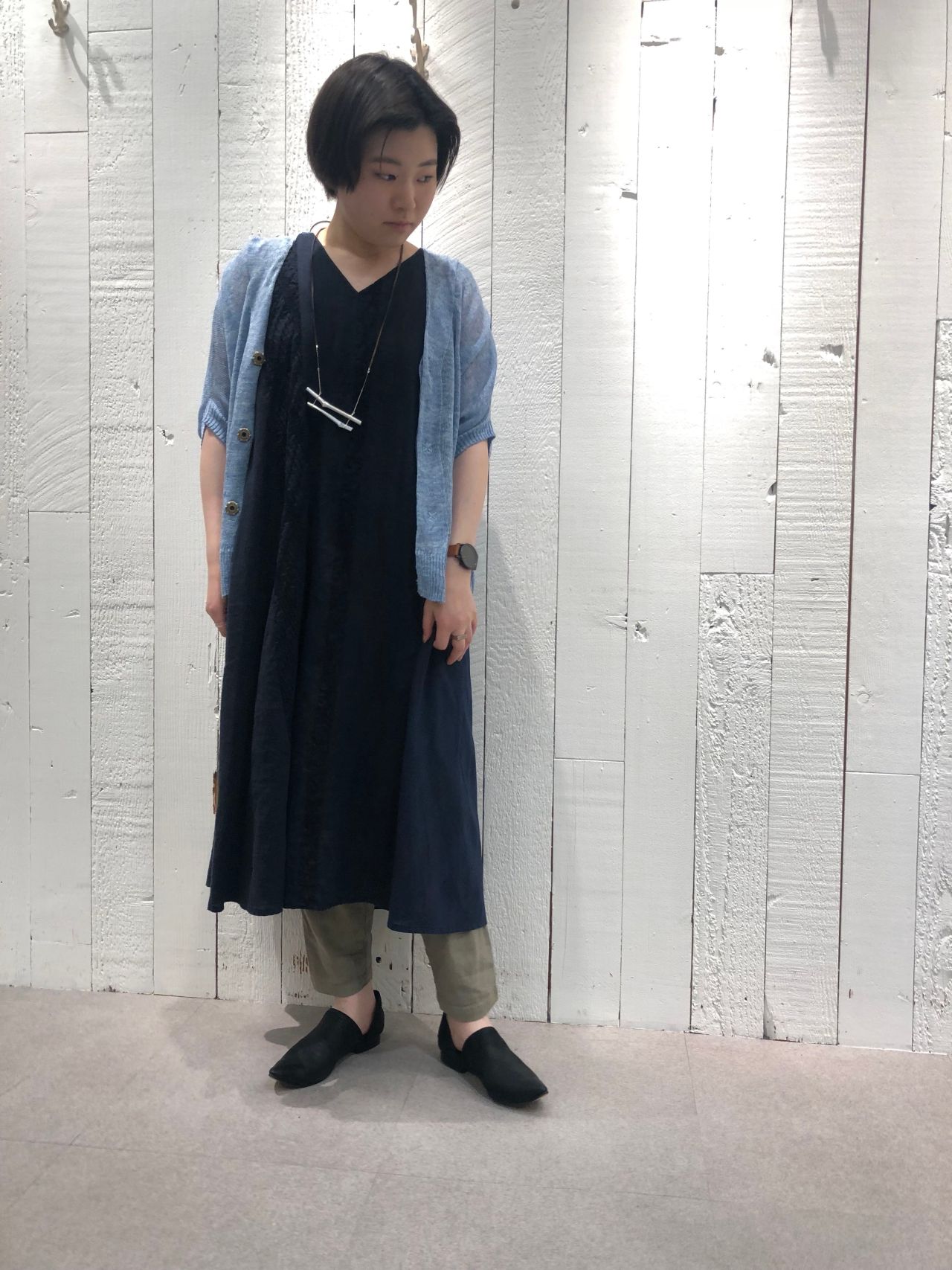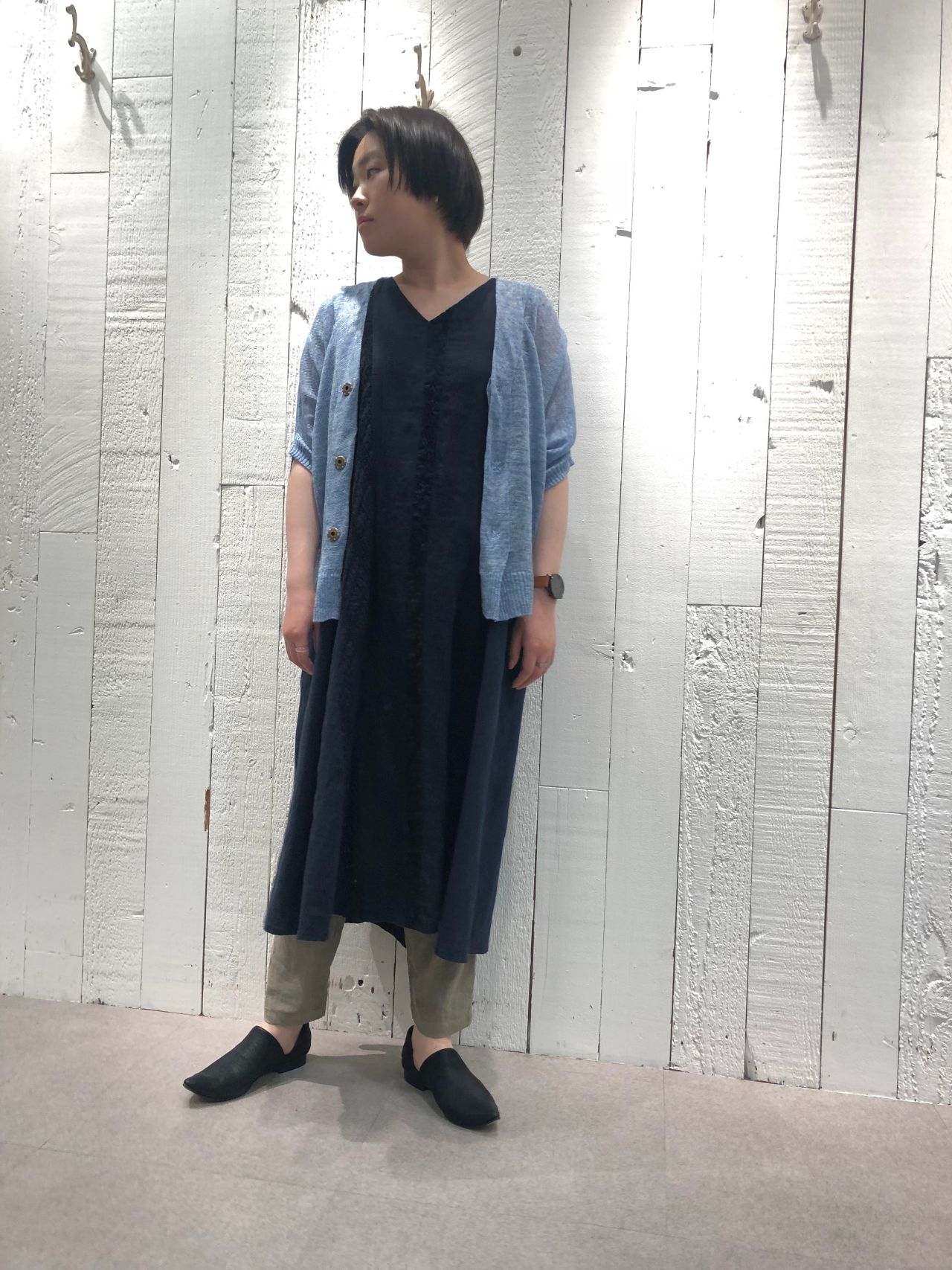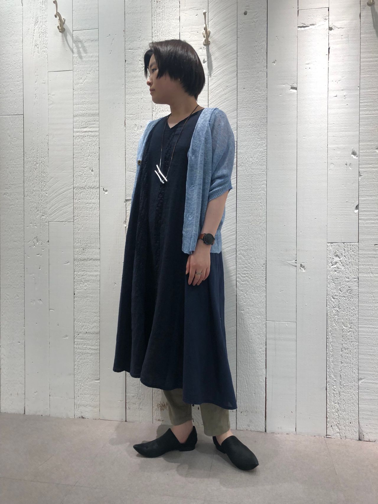 ワンピースは、同じ36サイズを身長の異なるスタッフがカラー違いで着用しております。