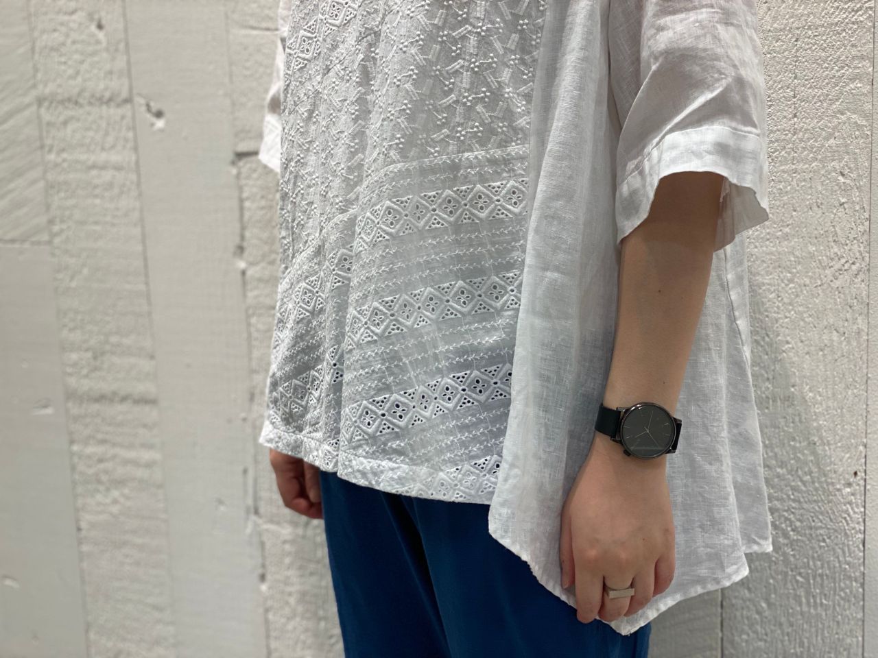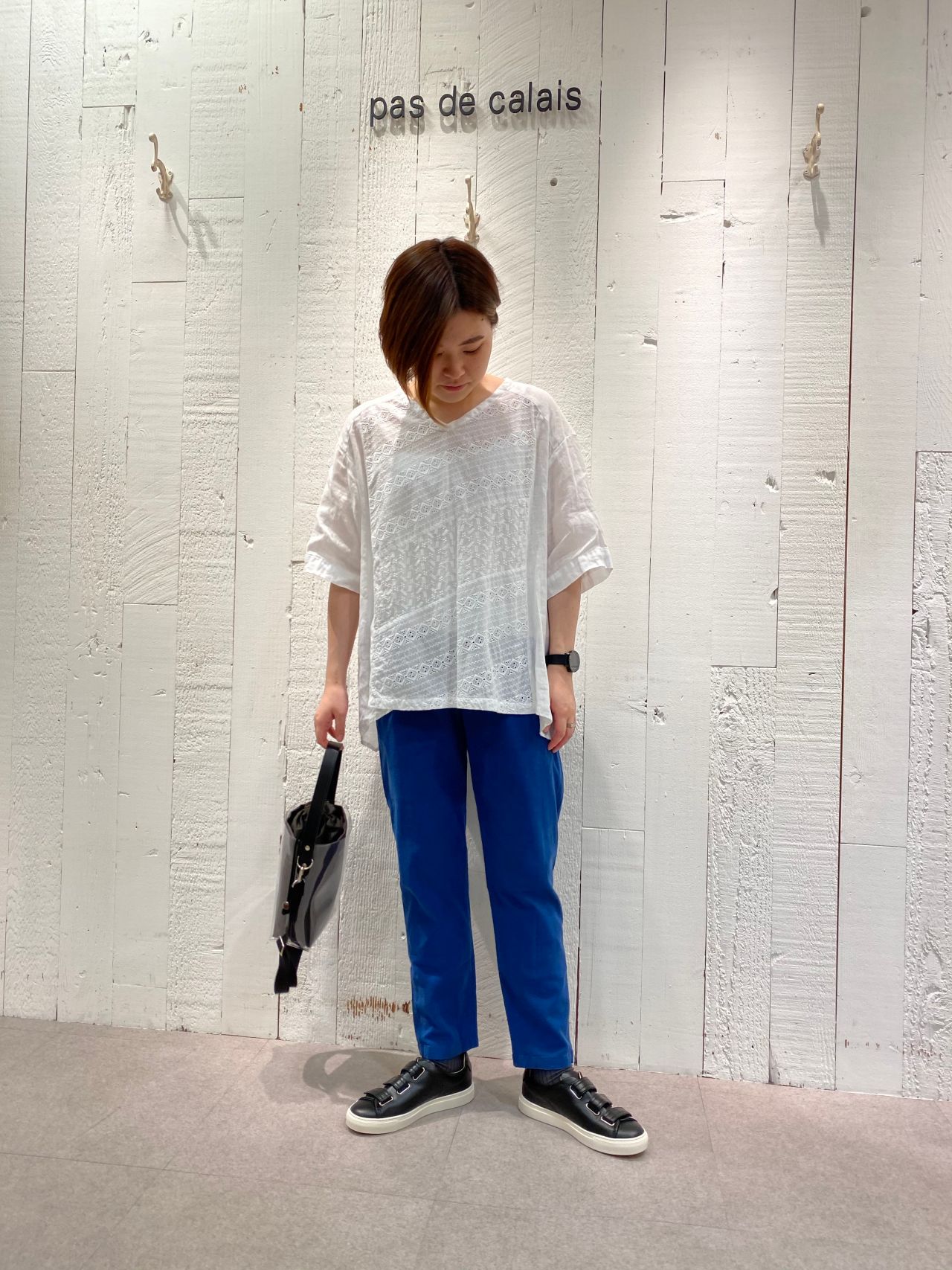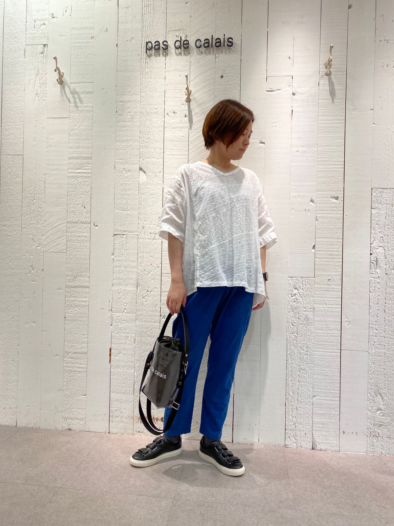 ブルーのパンツと合わせたスタイリングで、夏らしいさわやかさが◎。
