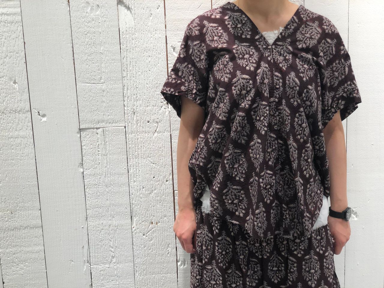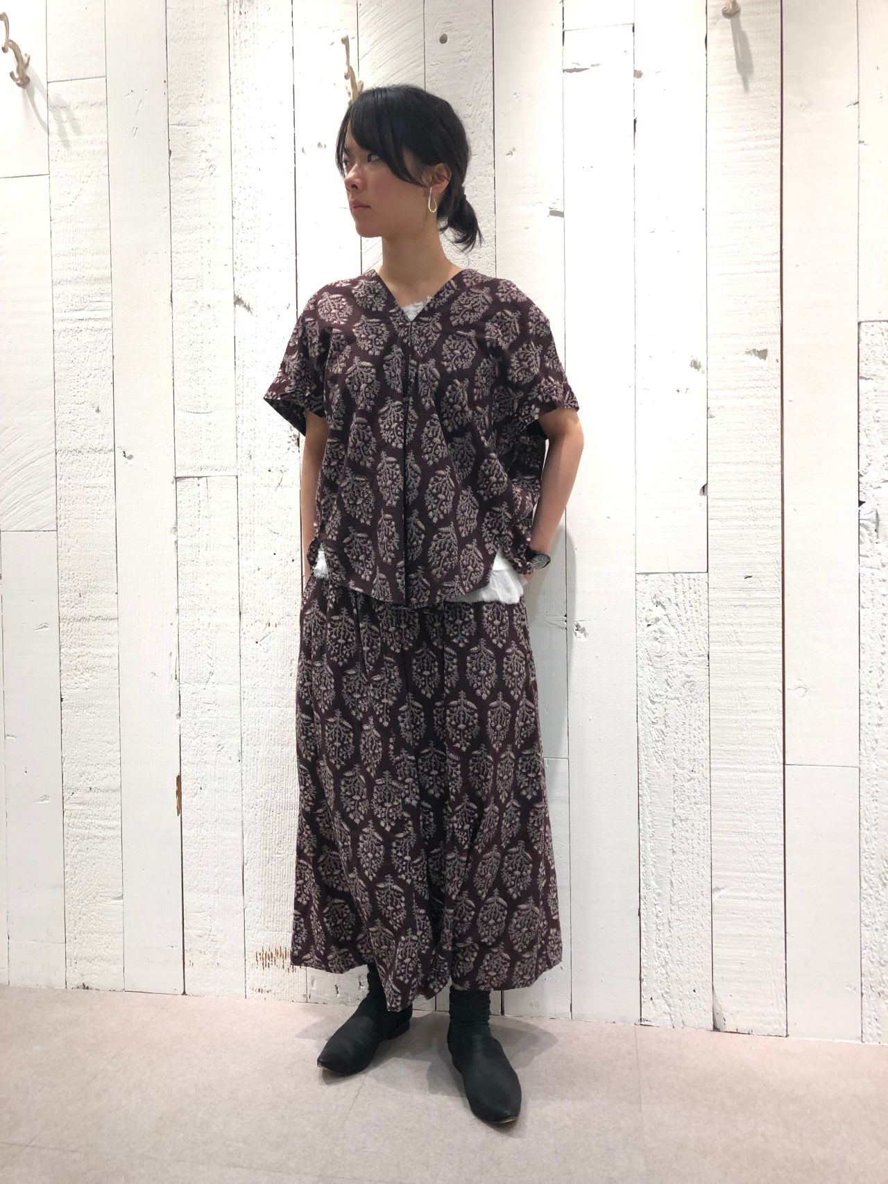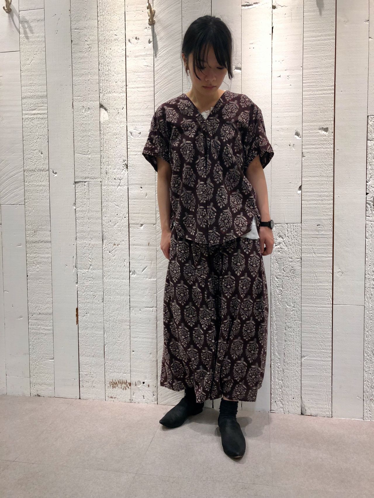 ブロックプリントを施したV衿のスッキパーブラウスと、同シリーズのバルーンパンツとカジュアルなセットアップです。
