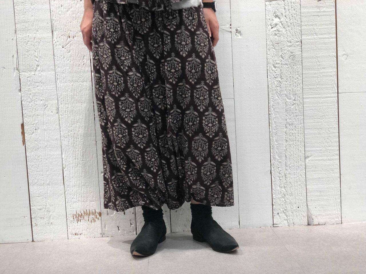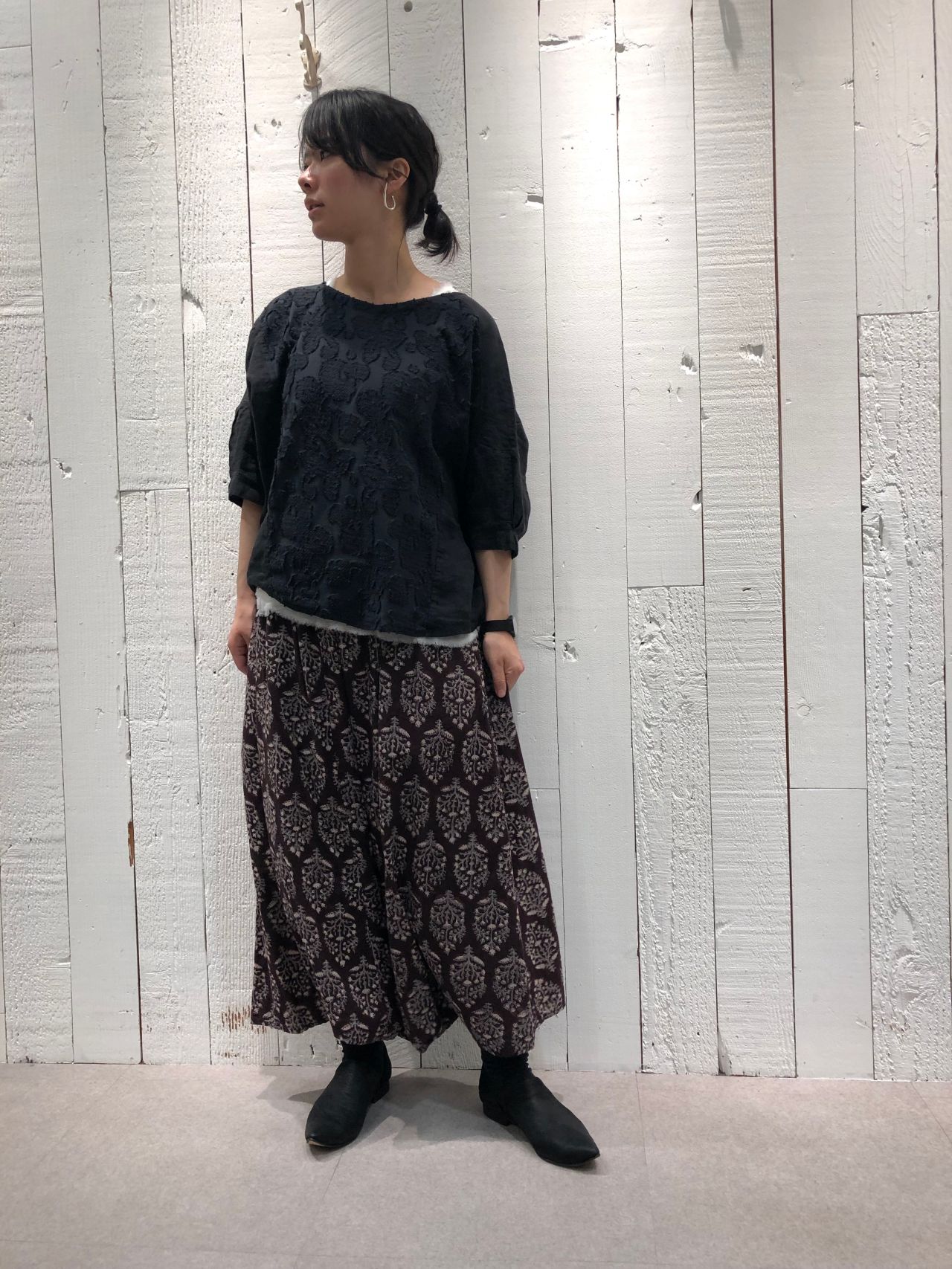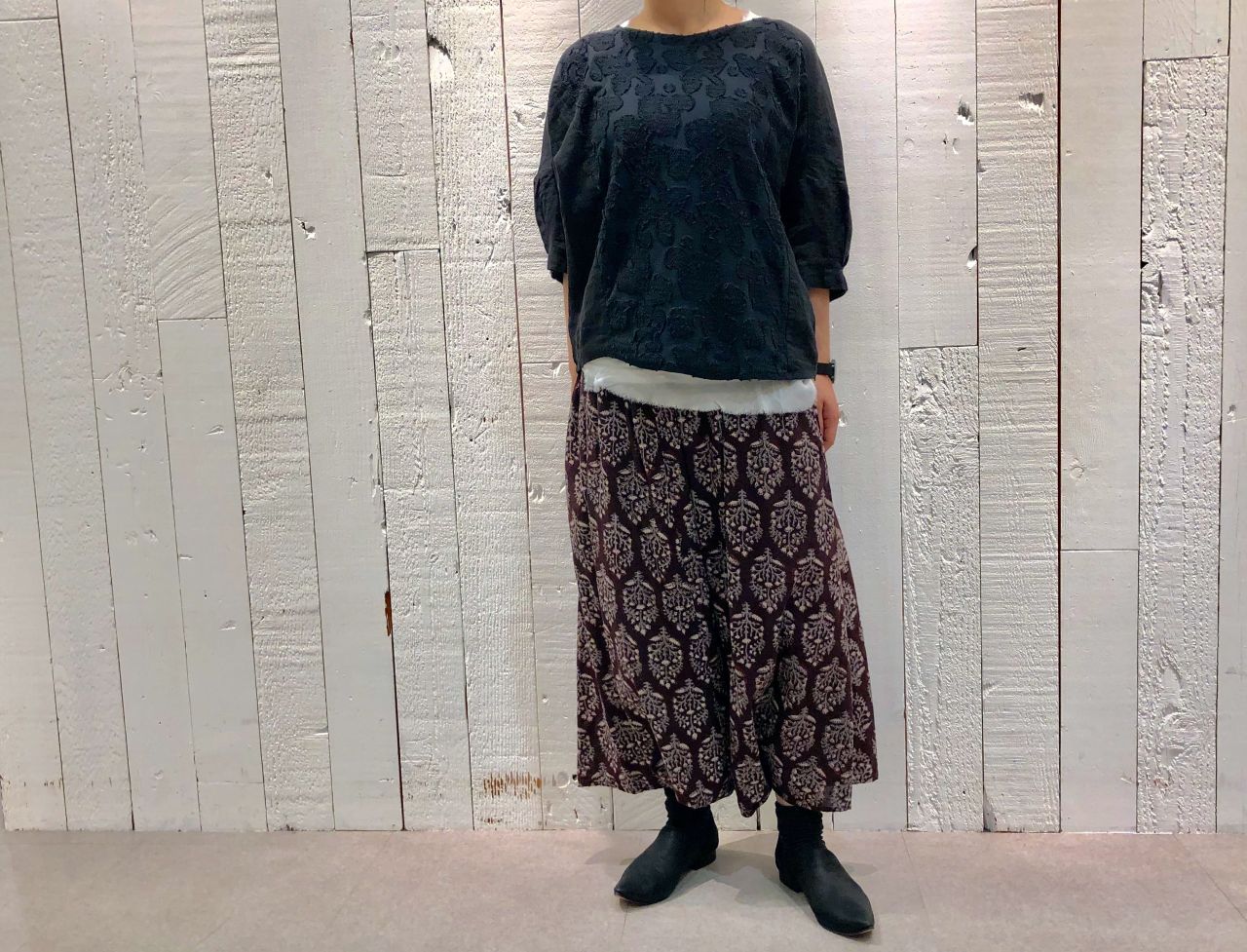 ブロックプリントを施したV衿のスッキパーブラウスと、同シリーズのバルーンパンツとカジュアルなセットアップです。