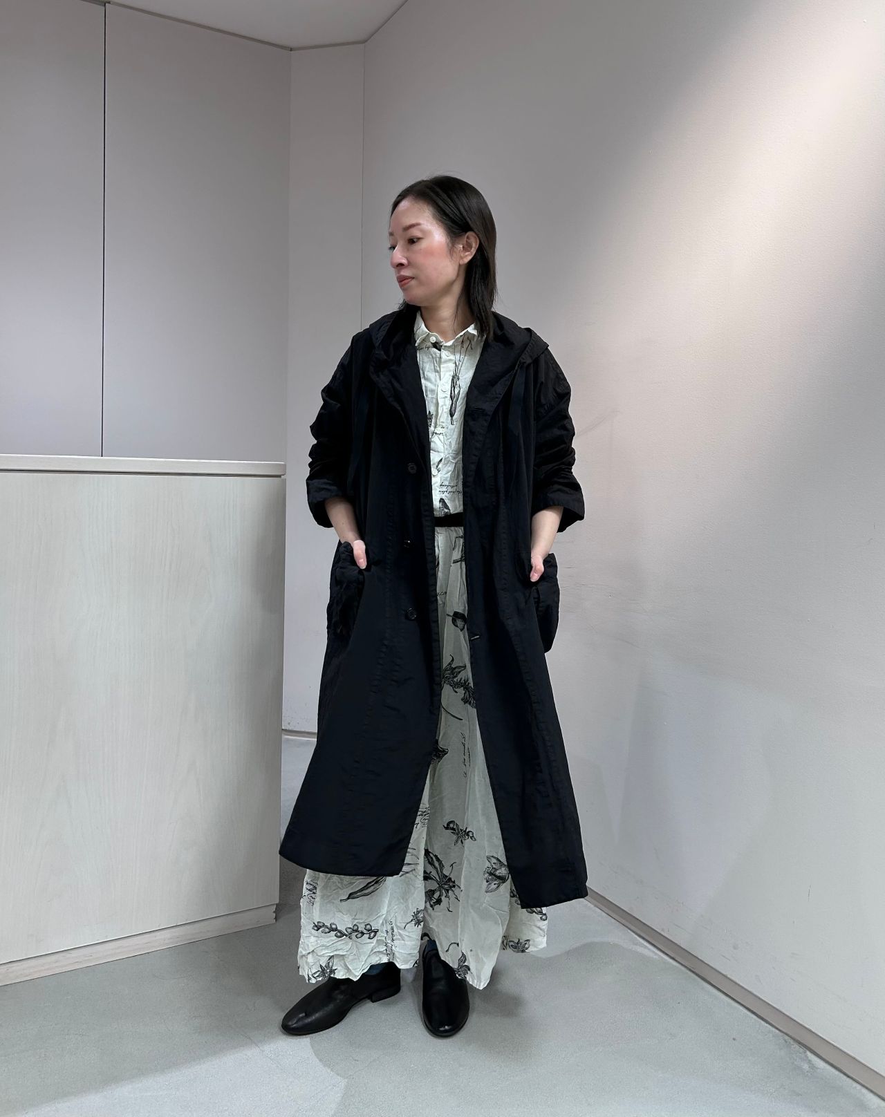 型違いでフード付きのロングコートもございます。