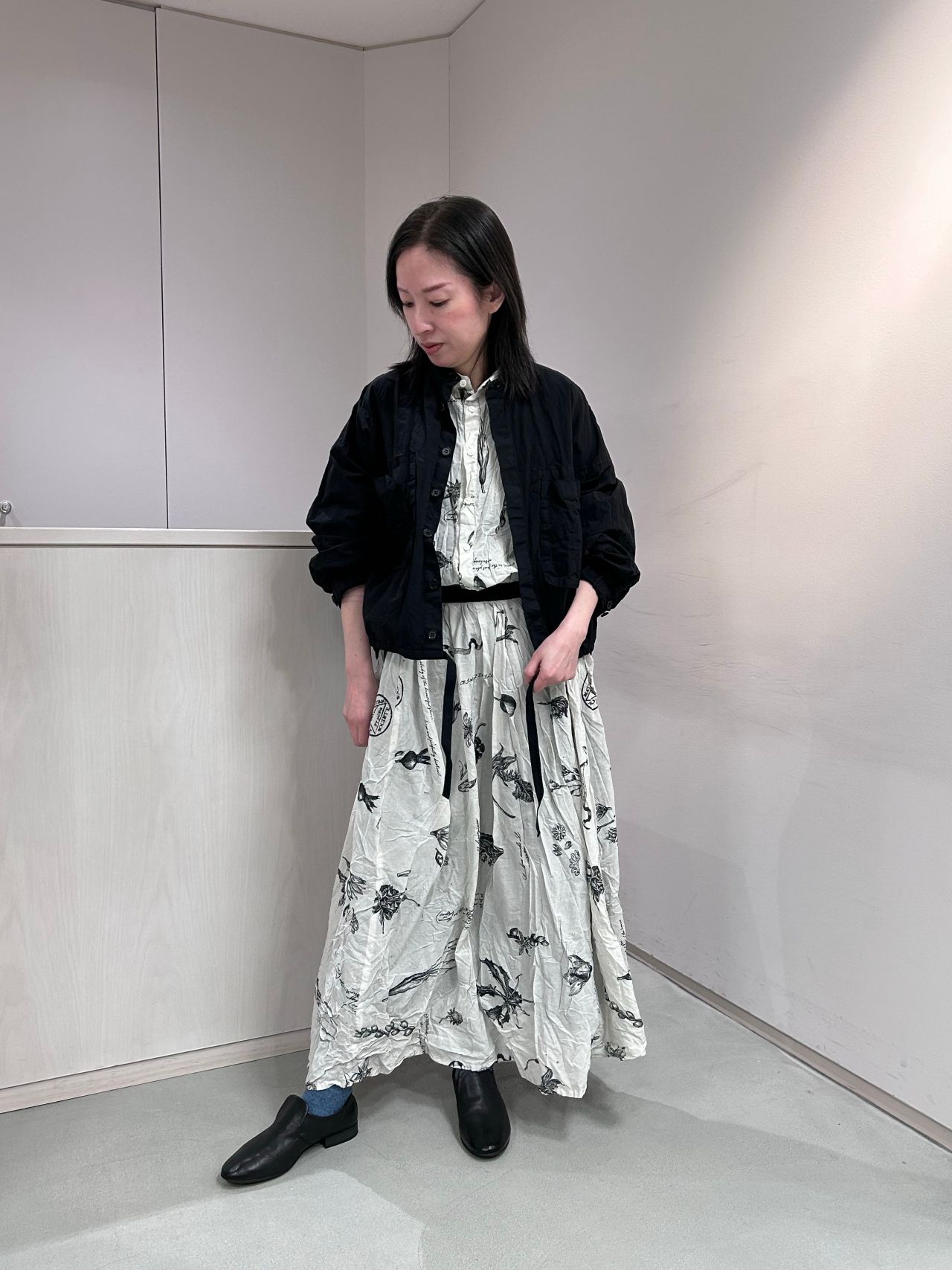 後ろが長めのAラインシルエット。裾のテープは絞ることでふんわりと、丸みのあるシルエットにも変化します。