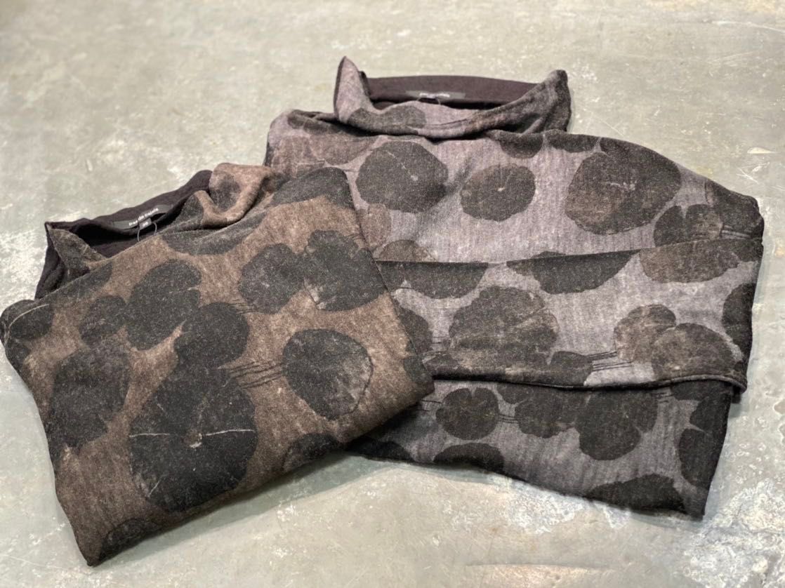 中に合わせたプルオーバーは、職人が一つ一つ手作業で型友禅のプリントをしているため、全く同じものができない一点もの。