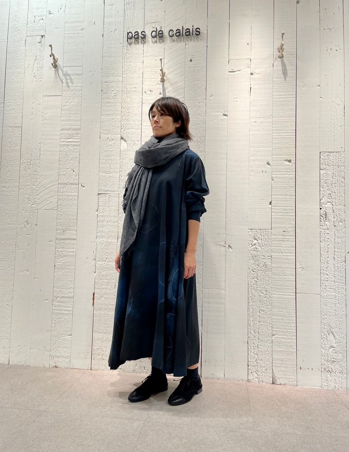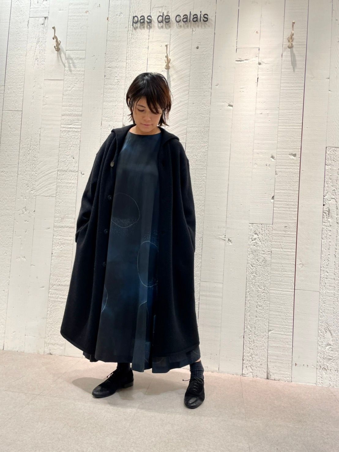 ワンピースとも相性の良いフード付きのA ラインニットローブを合わせました。エアリーウール100%でロング丈でもとても軽く、肩の凝らない着心地です。毛並みの揃った梳毛は美しく滑らかなコシが大人カジュアルでオススメ。