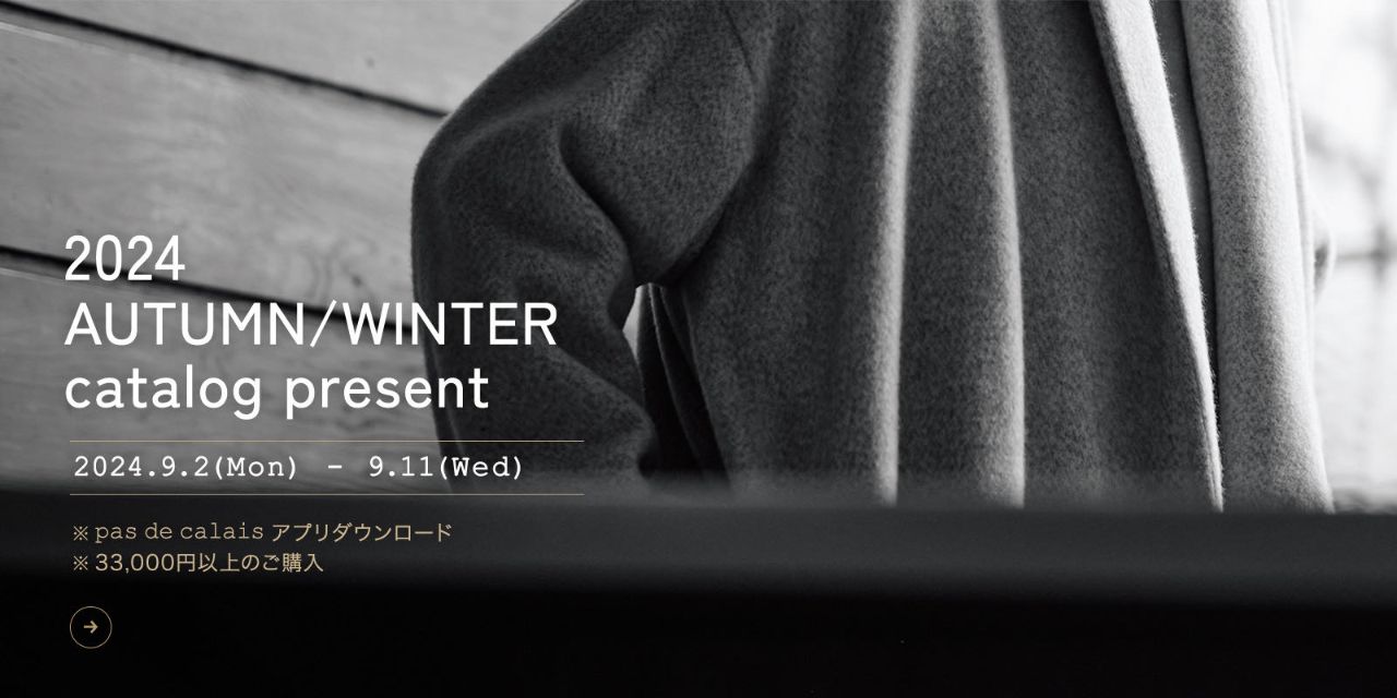 9月2日(月)〜11日(水)の期間中、¥33,000以上ご購入、公式アプリダウンロードで、「pas de calais AUTUMN / WINTER 2024」カタログをプレゼントします。(無くなり次第、終了となります。)