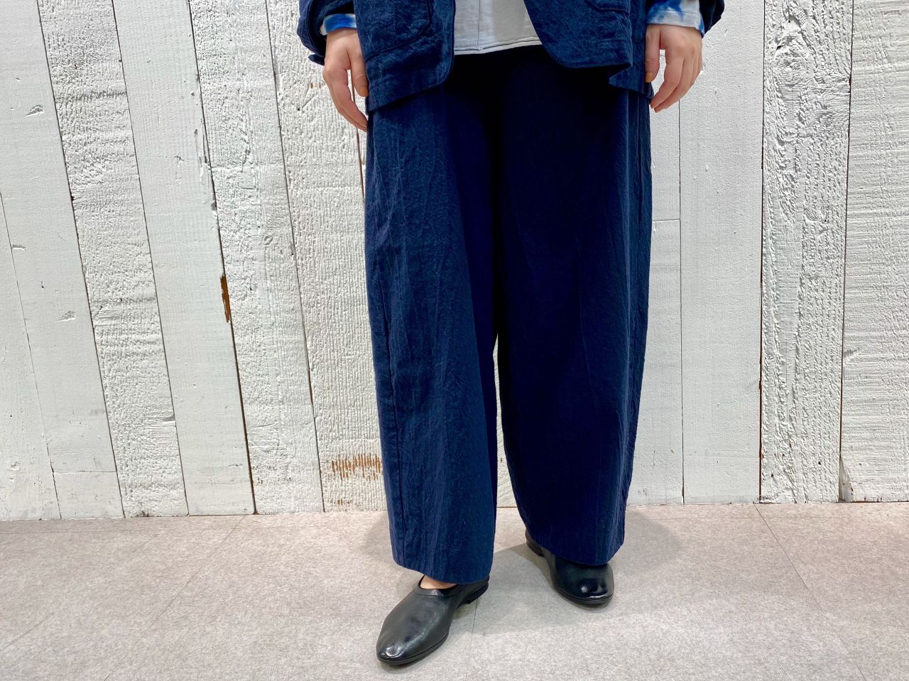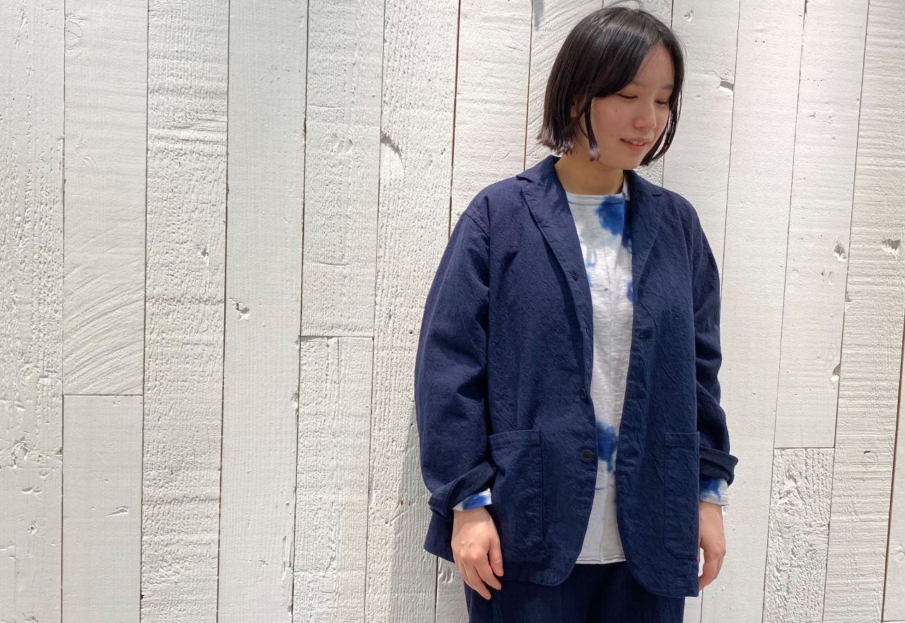 リネン生地の中でも最上級のクオリティといわれるフレンチリネンを使用した、先染めの綿麻ツイル素材で生地をざっくりと織り、仕上げの加工でギュッと縮ませて適度なシワ感を出しています。