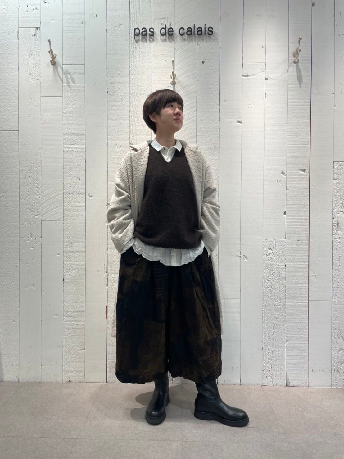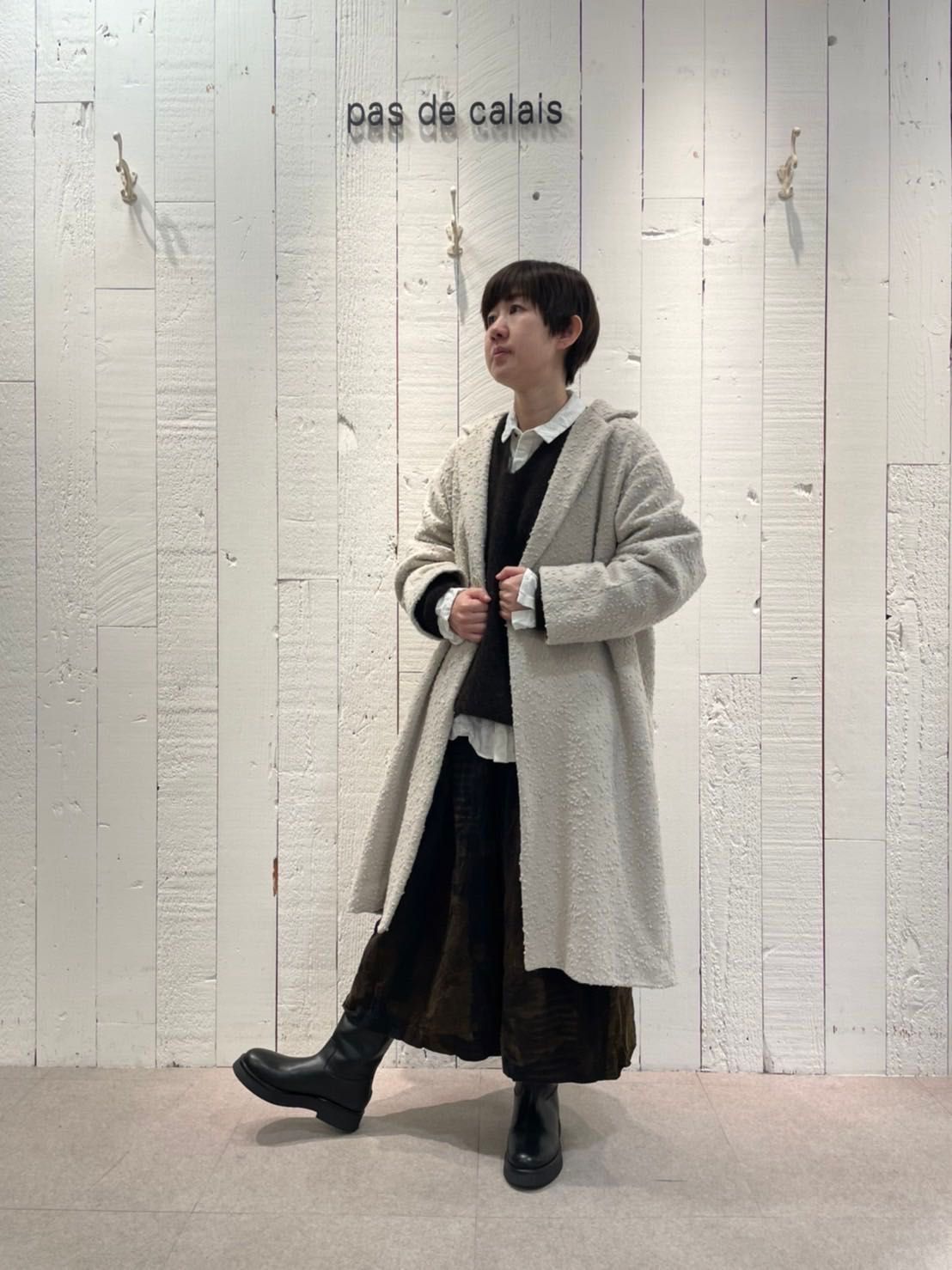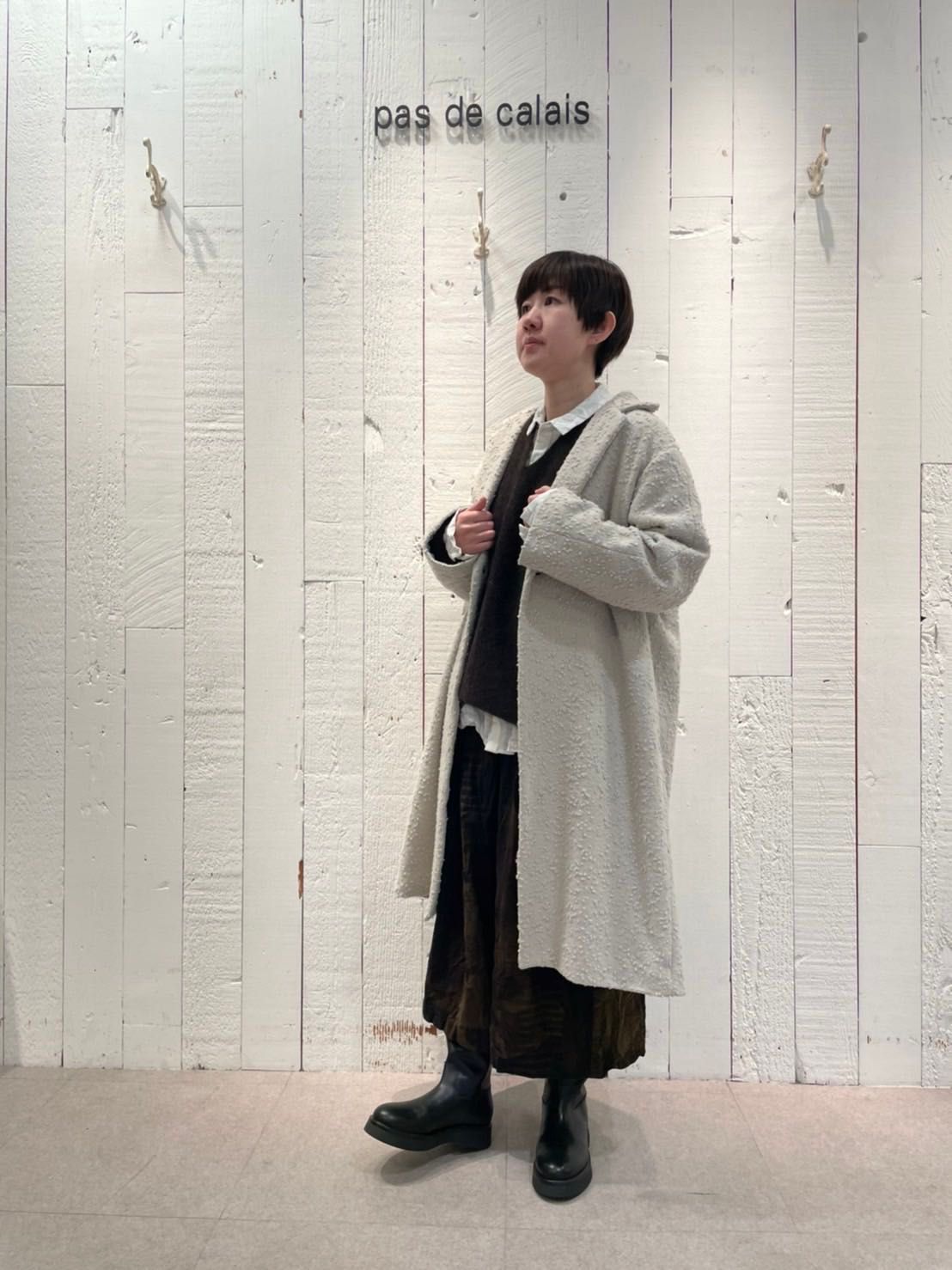 明るいアイボリーのコートのインには、シックな色合いのベビーアルパカのニットとBlack Harmoneyパンツのコーディネート。
