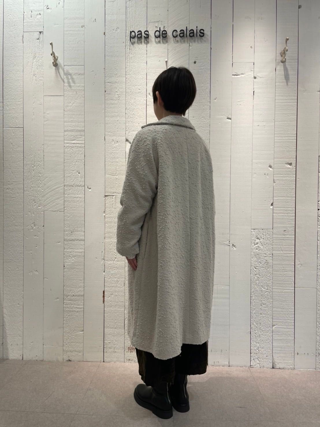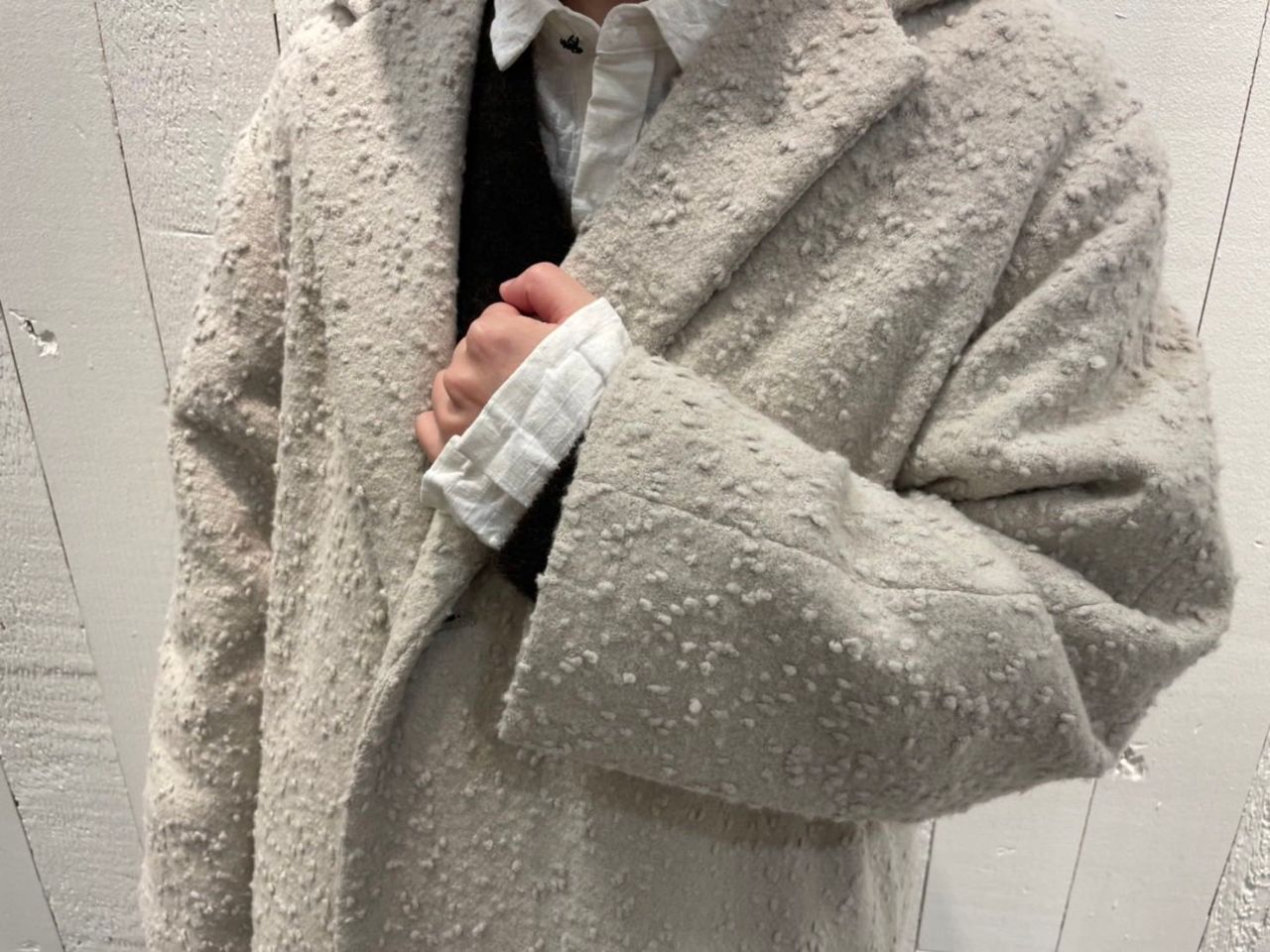 ランダムにノット(小さな玉)を作ったノットヤーンを使い、表情のある綿ウール素材のコート。