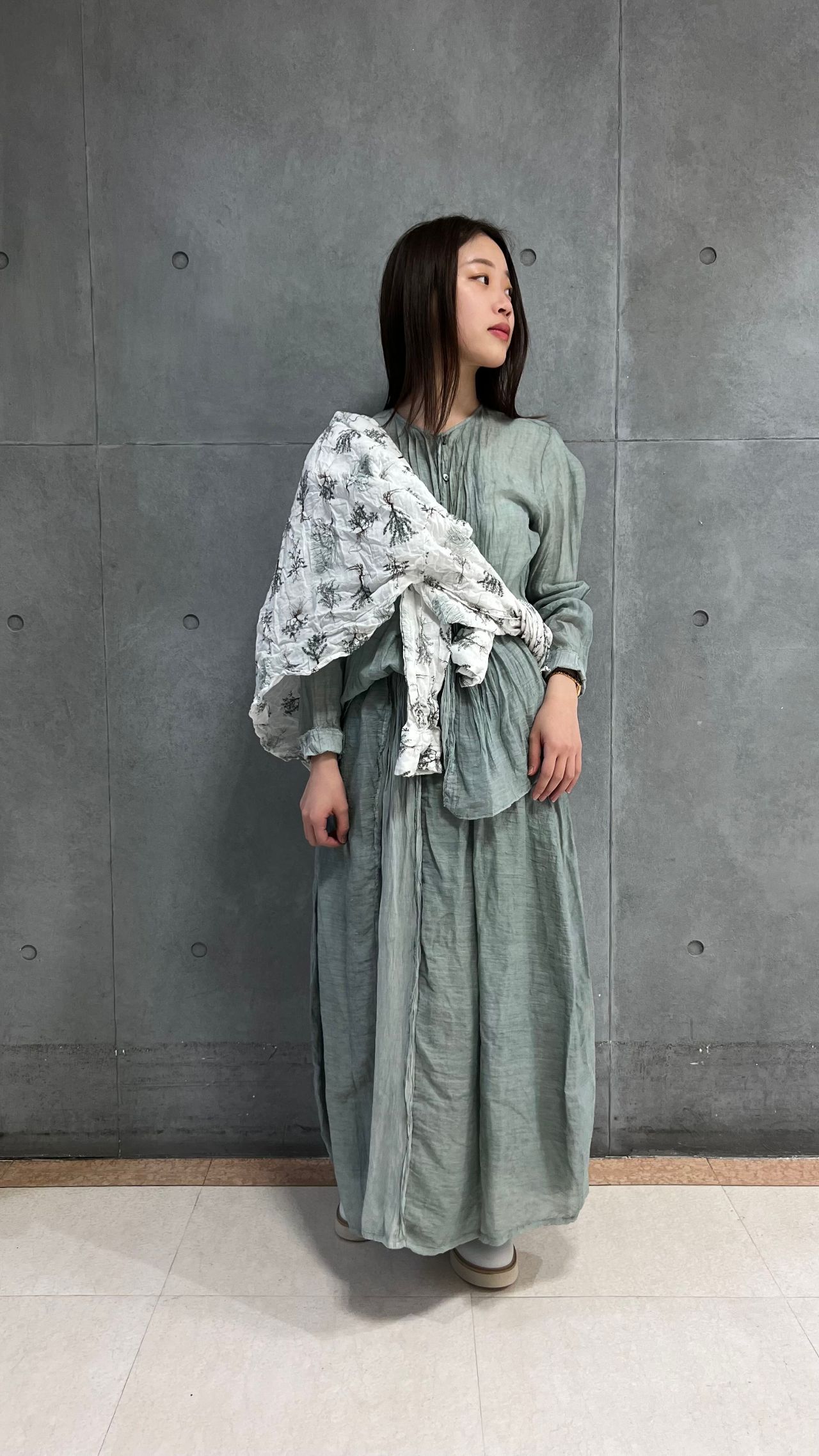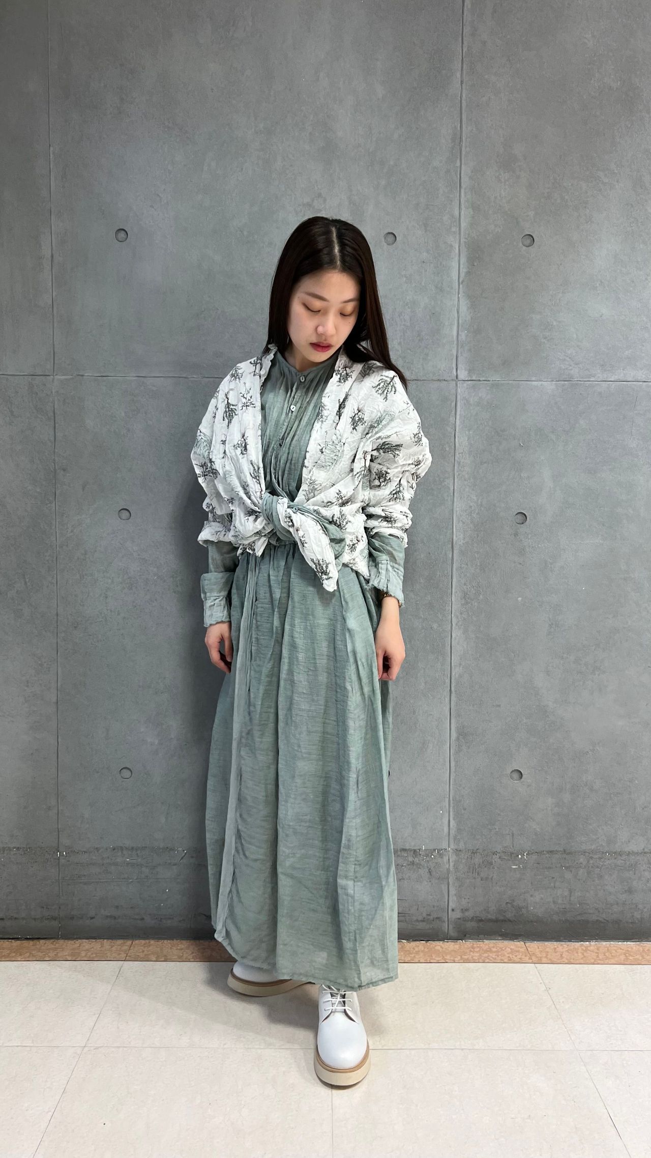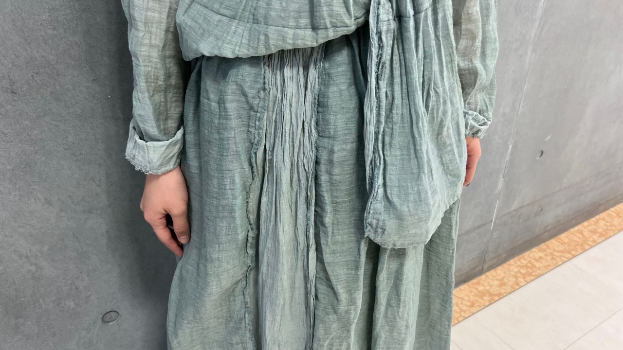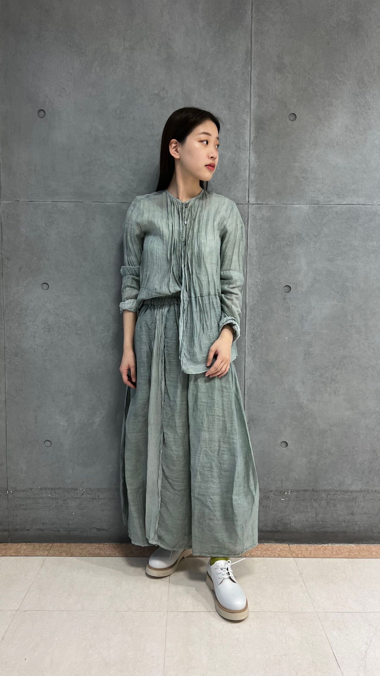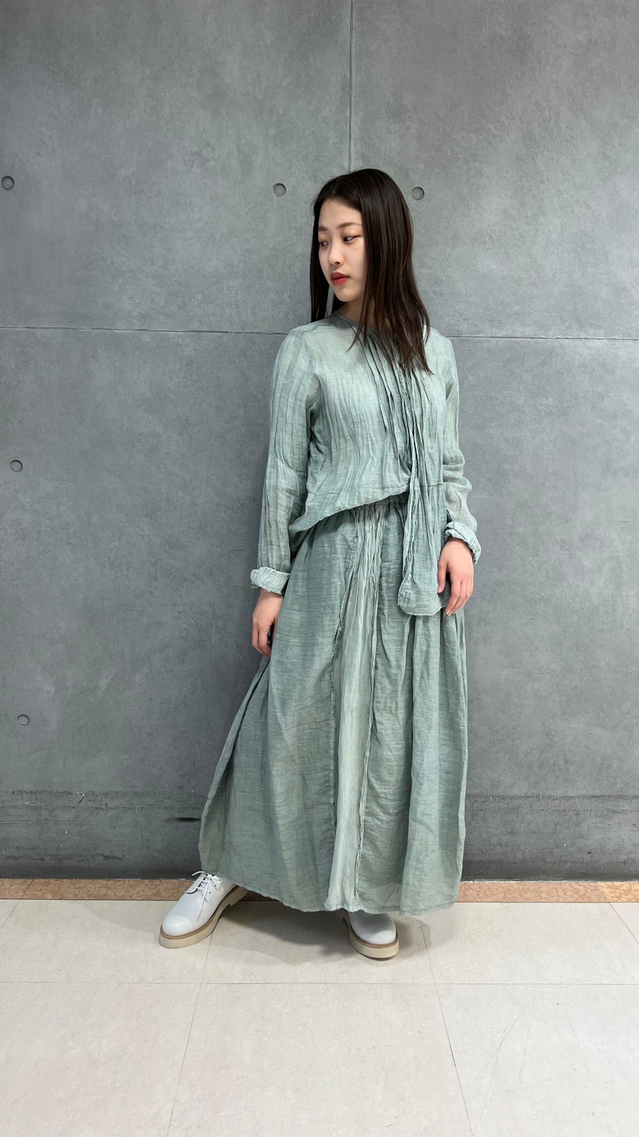ナイロンと極細のラミーを交織で織ることで透明感と程よい透け感のあるセットアップ。