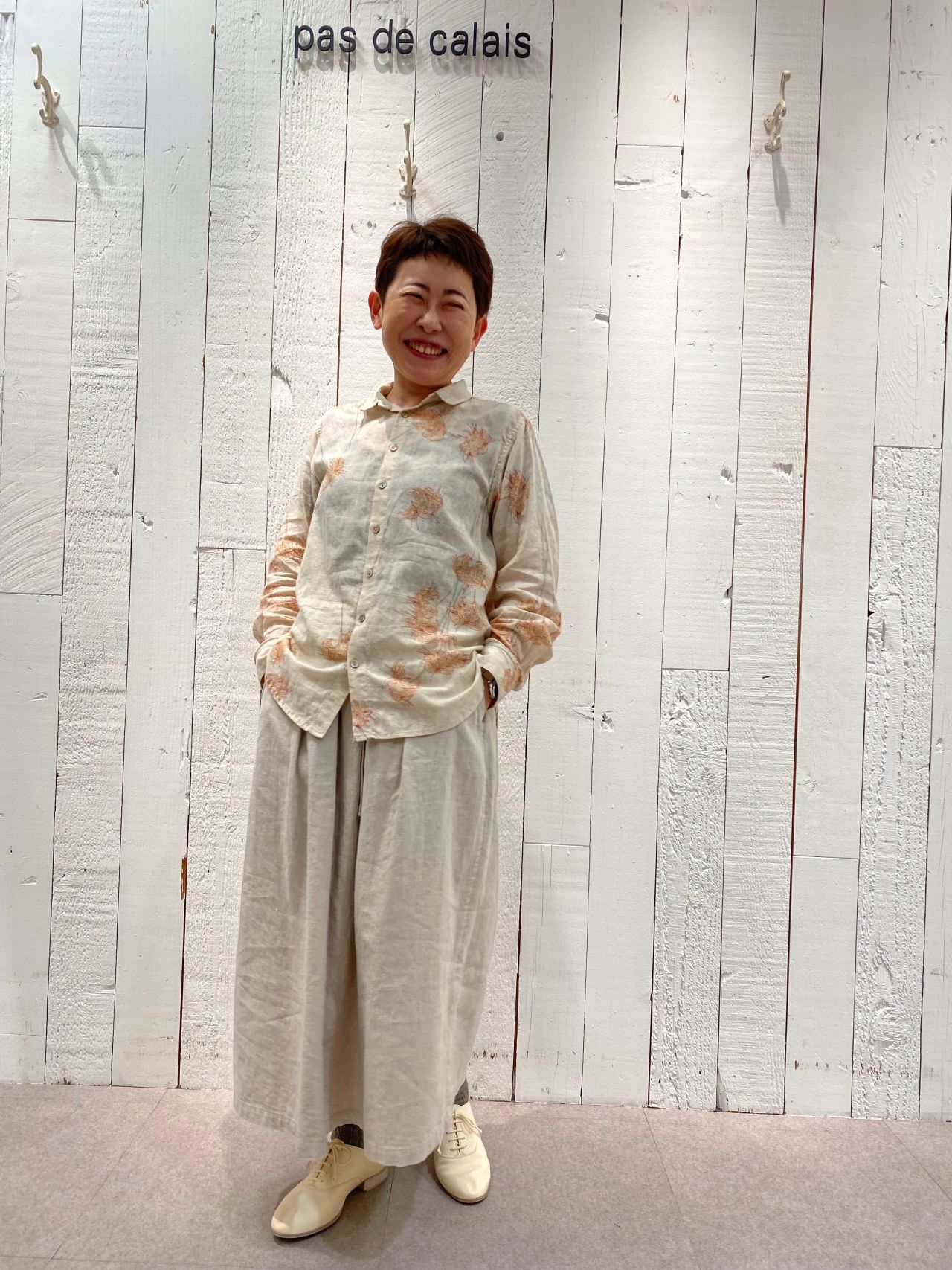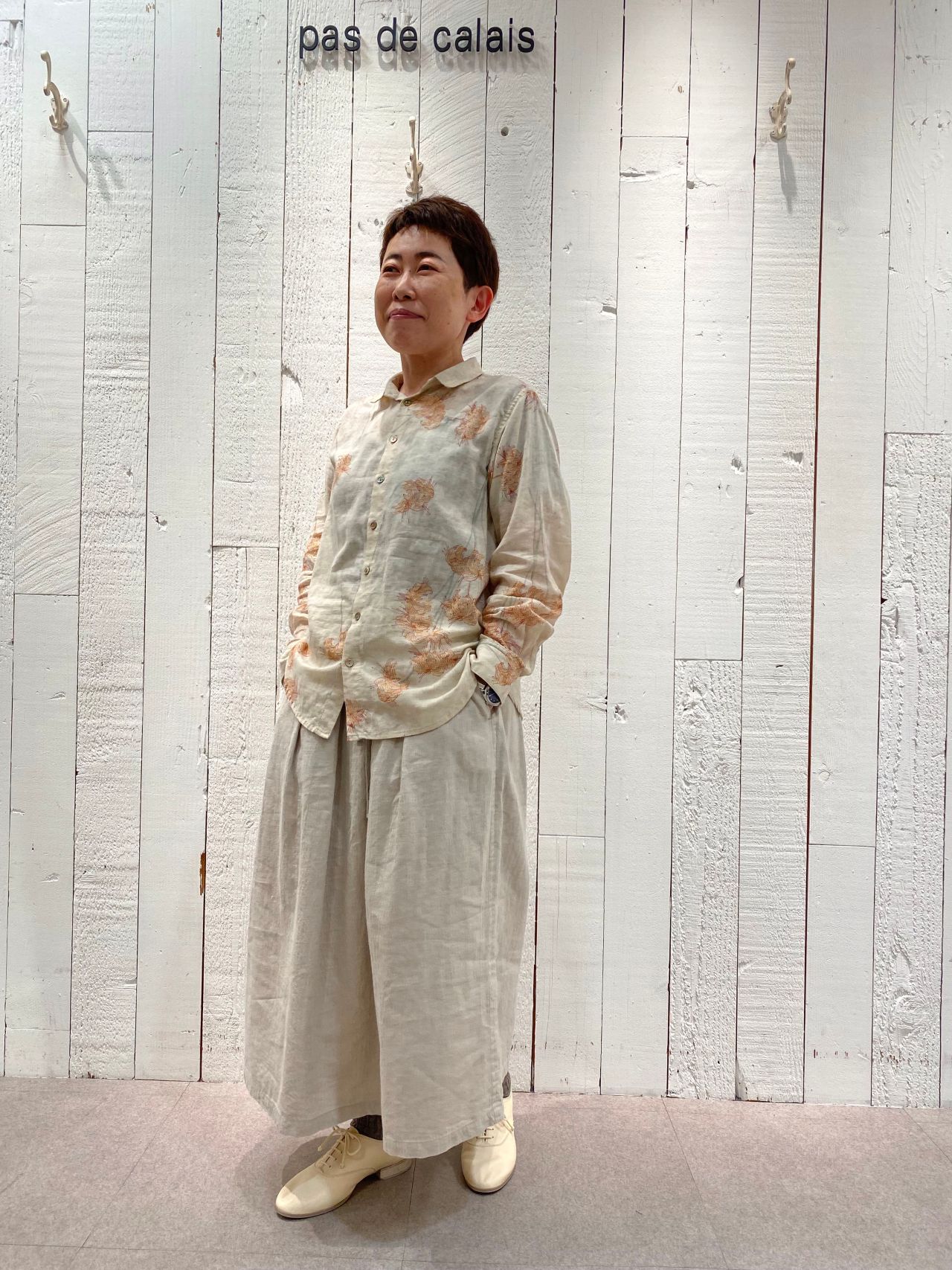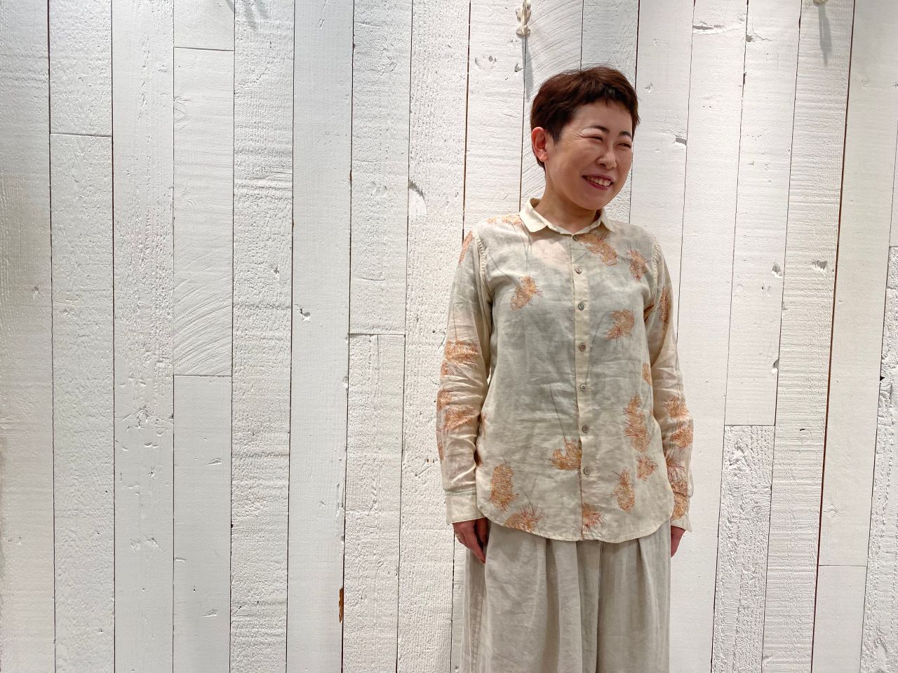 シンプルな襟付きブラウスに、儚げな線画の花柄をプリントしたブラウス。