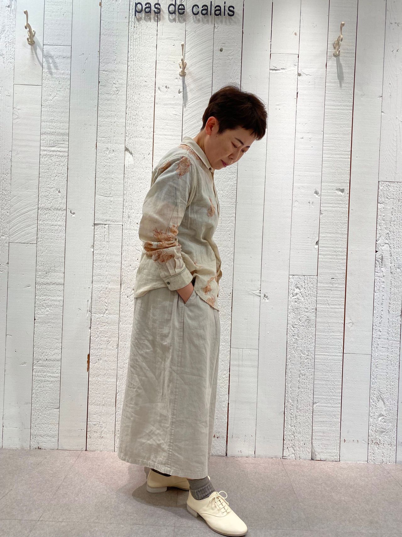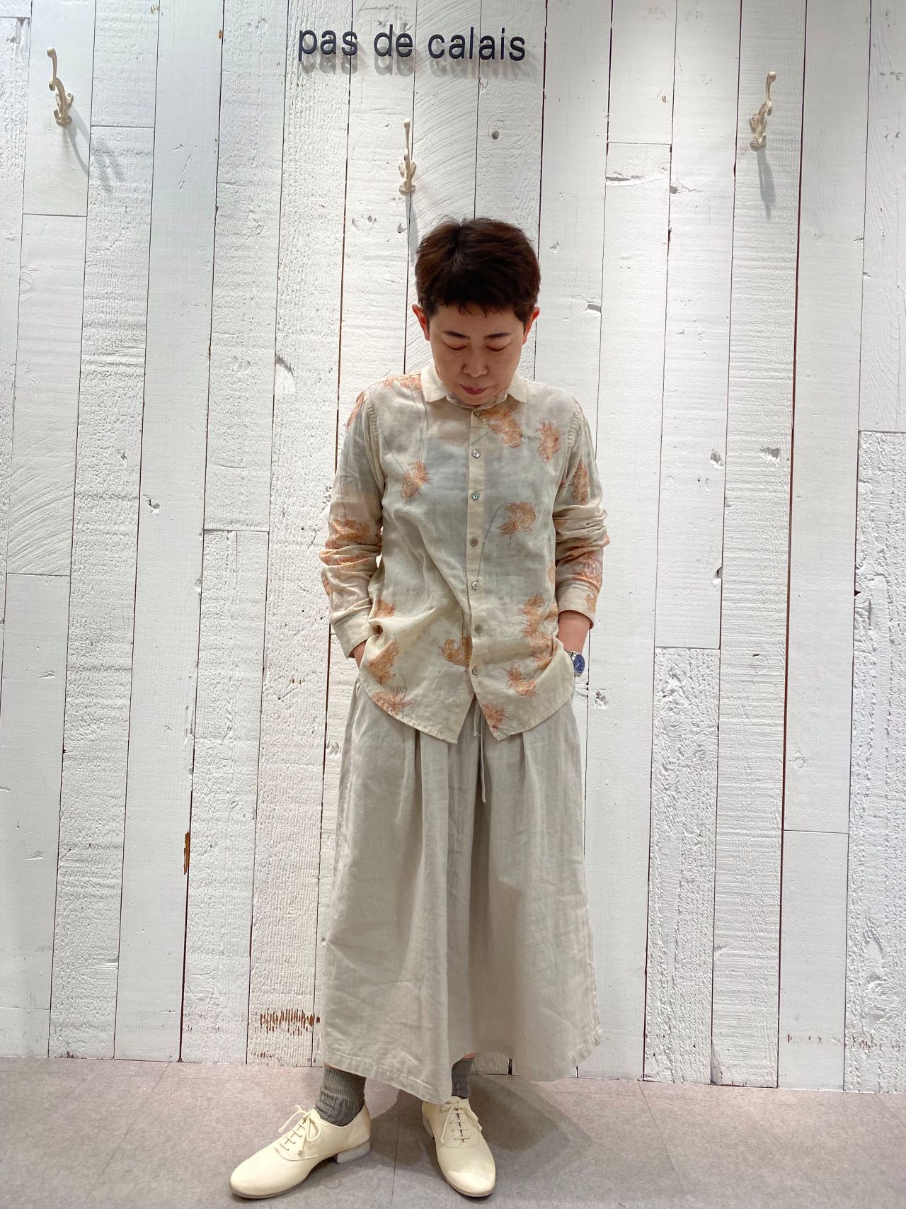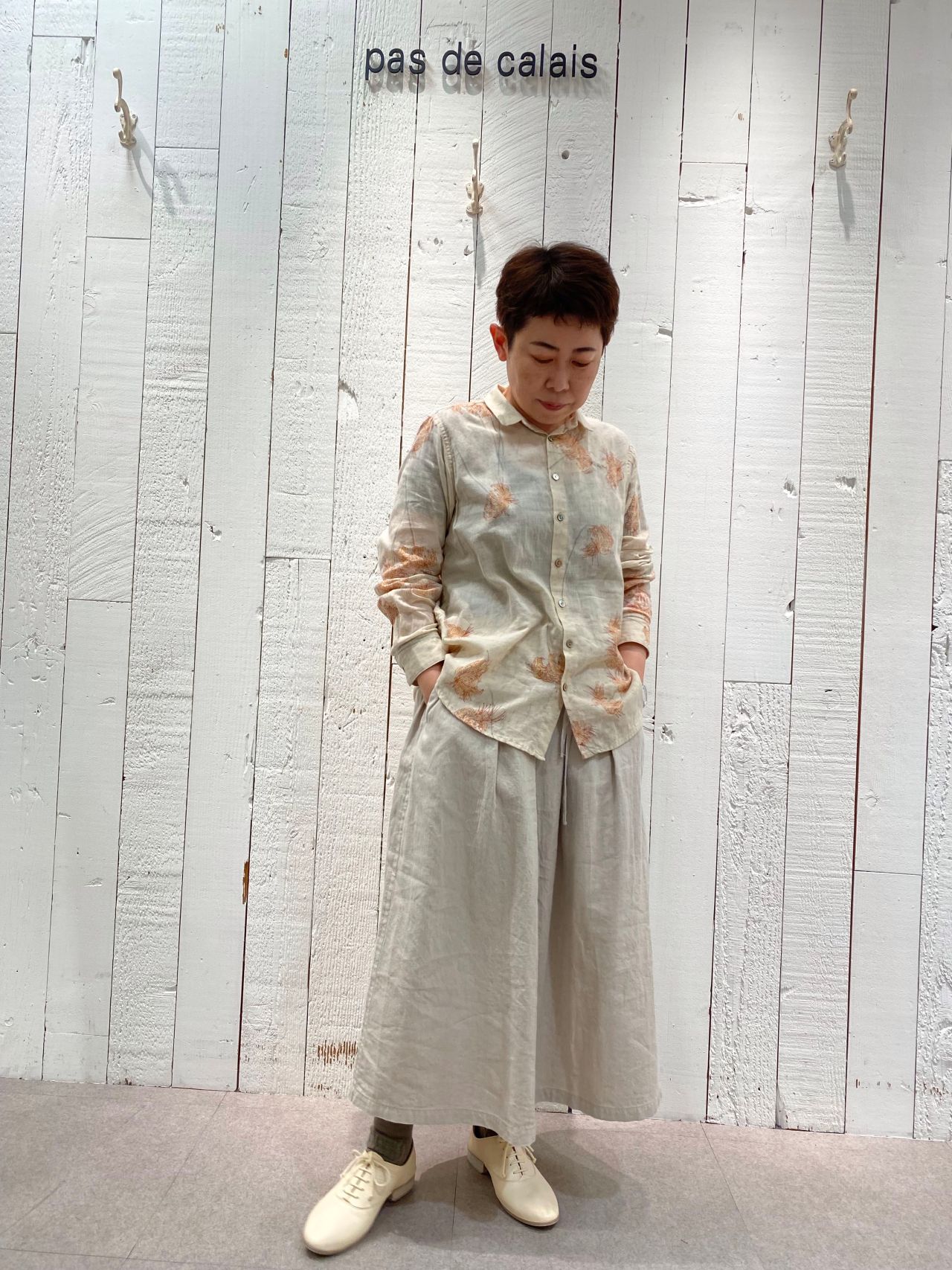 シンプルな襟付きブラウスに、儚げな線画の花柄をプリントしたブラウス。