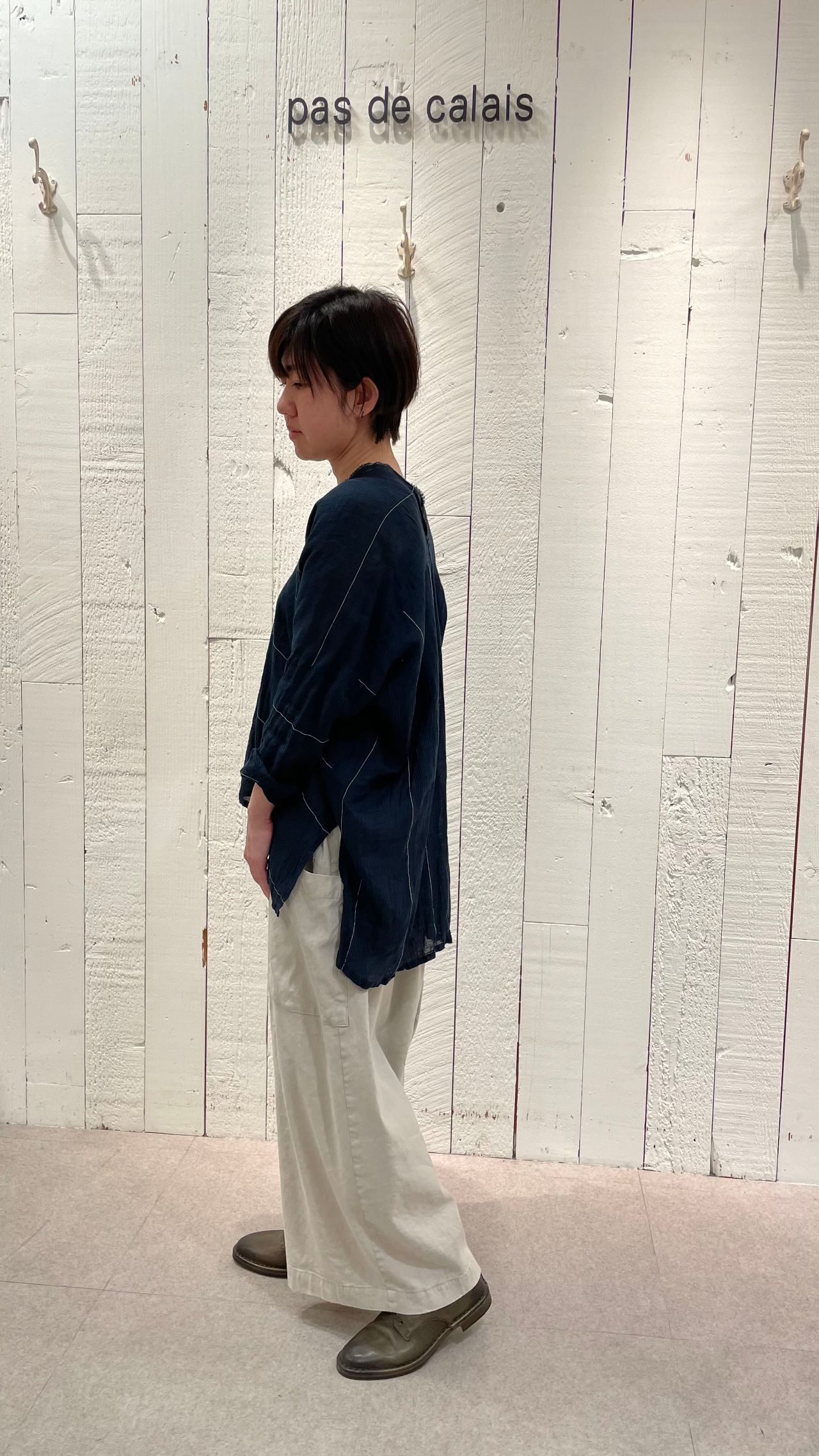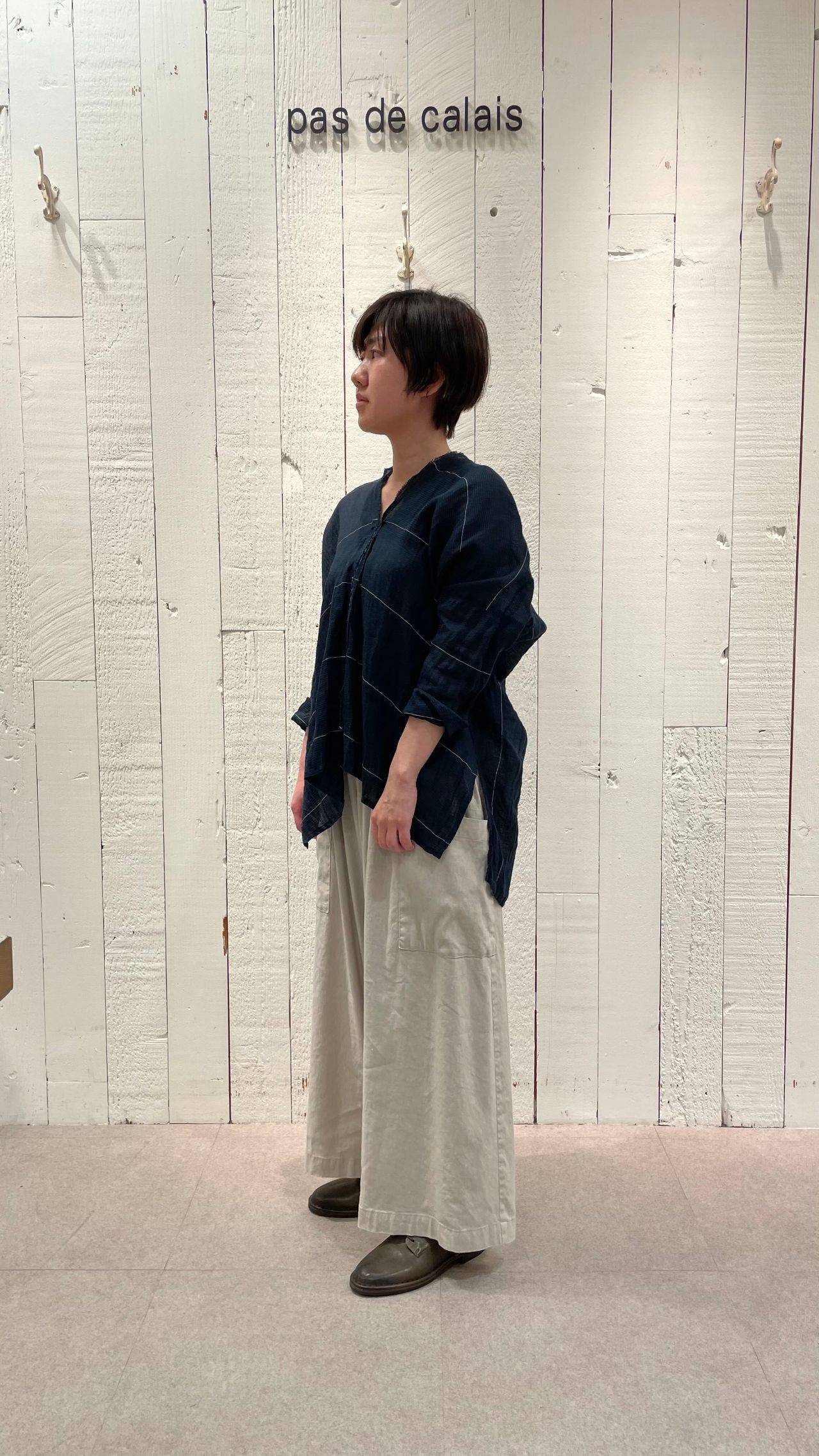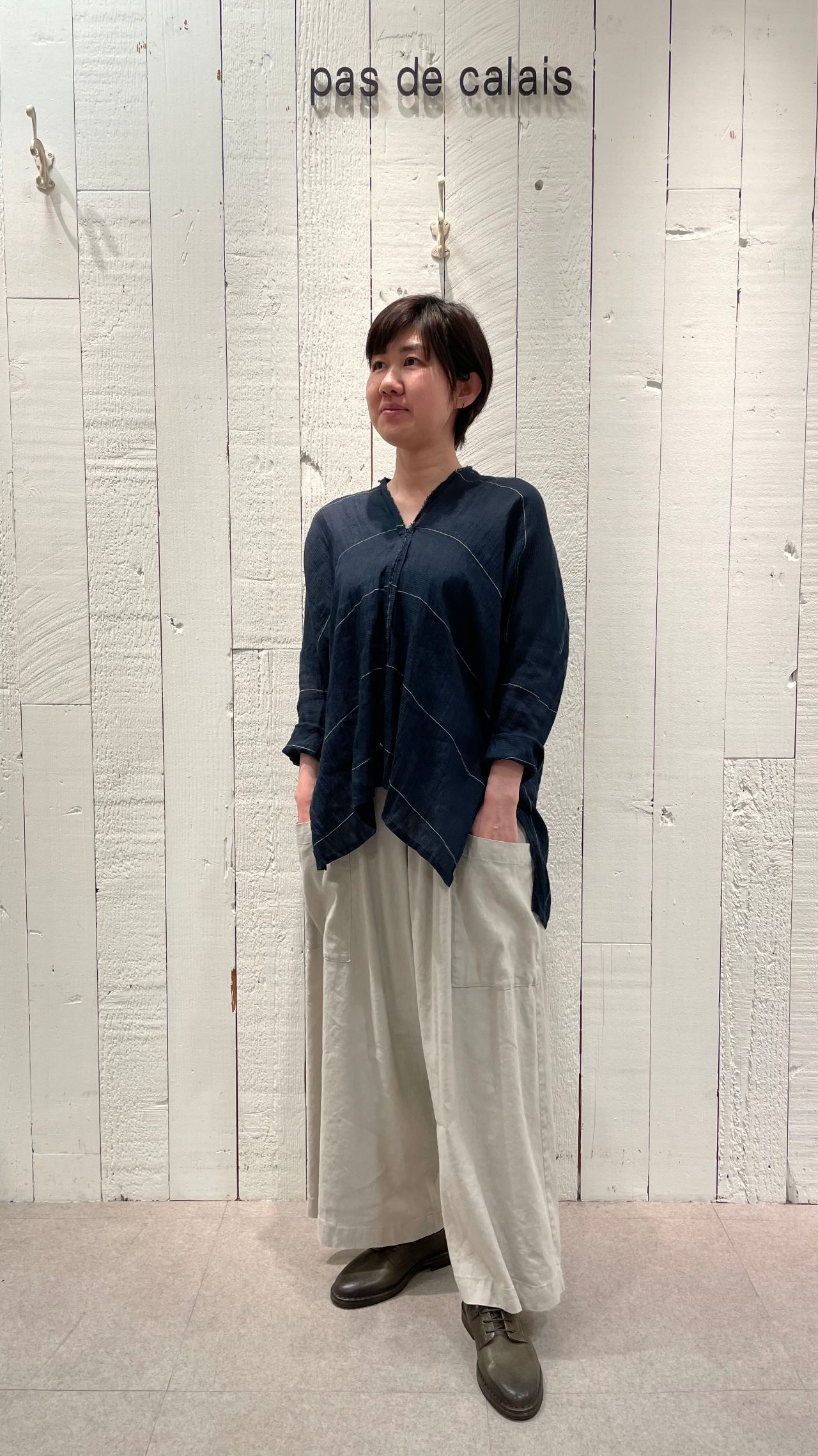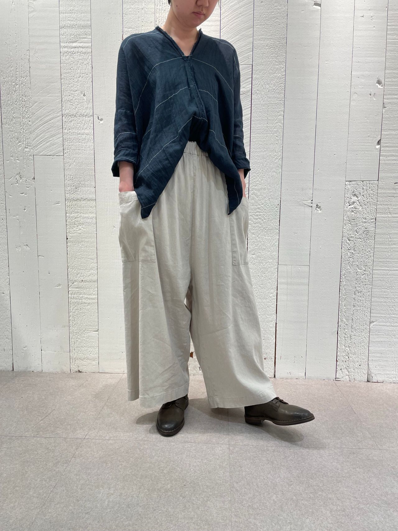 合わせたのは、ナチュラル感のある麻レーヨン素材のパンツ。