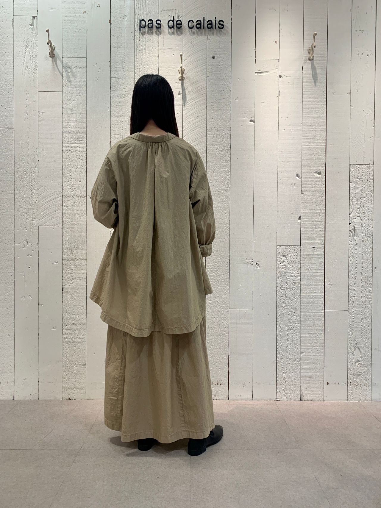 首元の後ろにギャザーが入っている為、裾に向かってフワッとしつつもテーラードカラーでスタイリッシュな印象になっています。