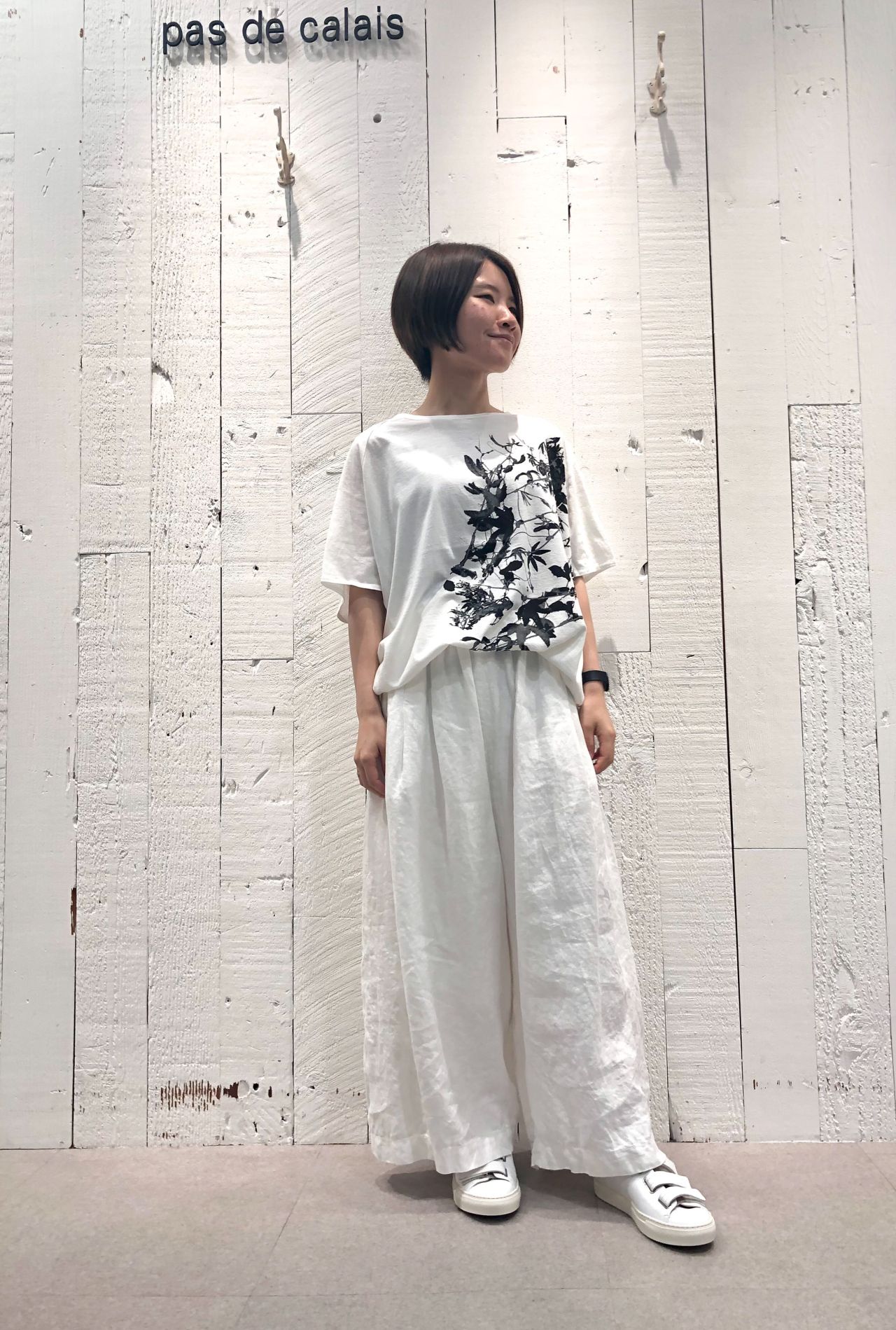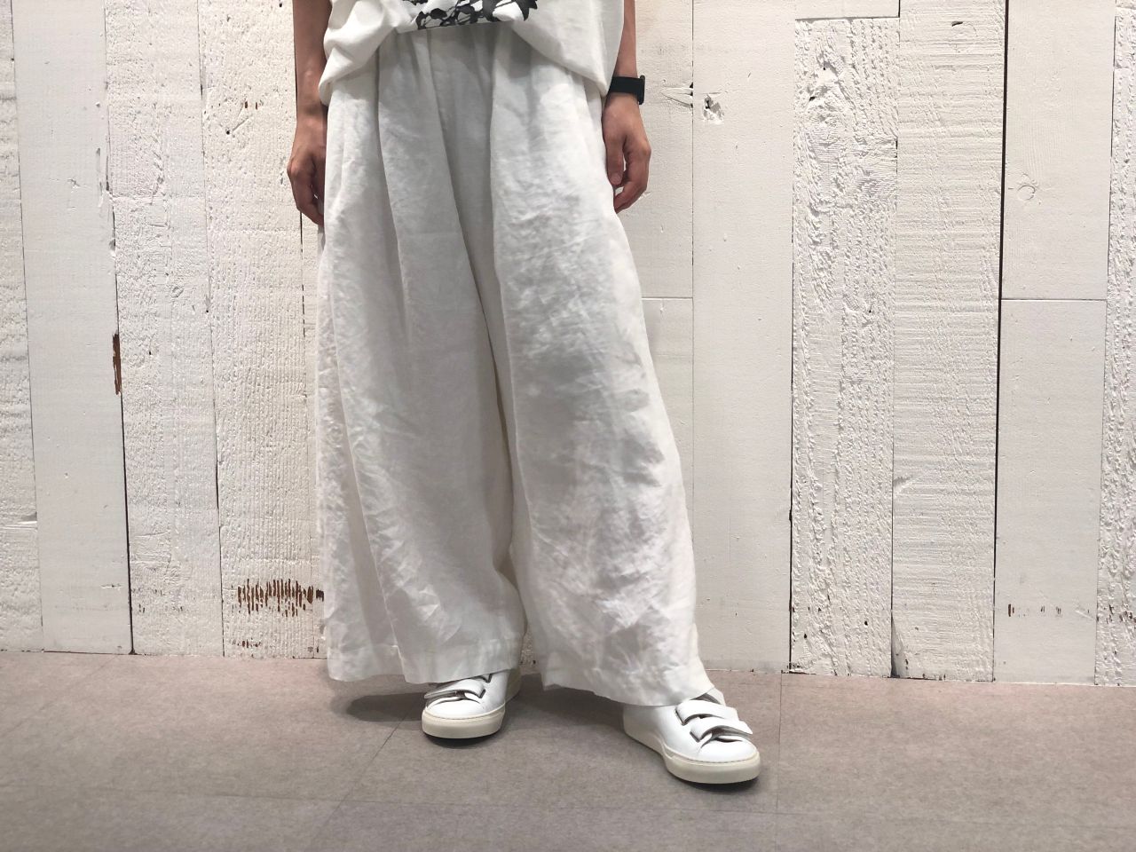 前回のブログでも登場したリネンギャバパンツに、水墨画のようなプリントが目を惹くカットソーのスタイリング。
