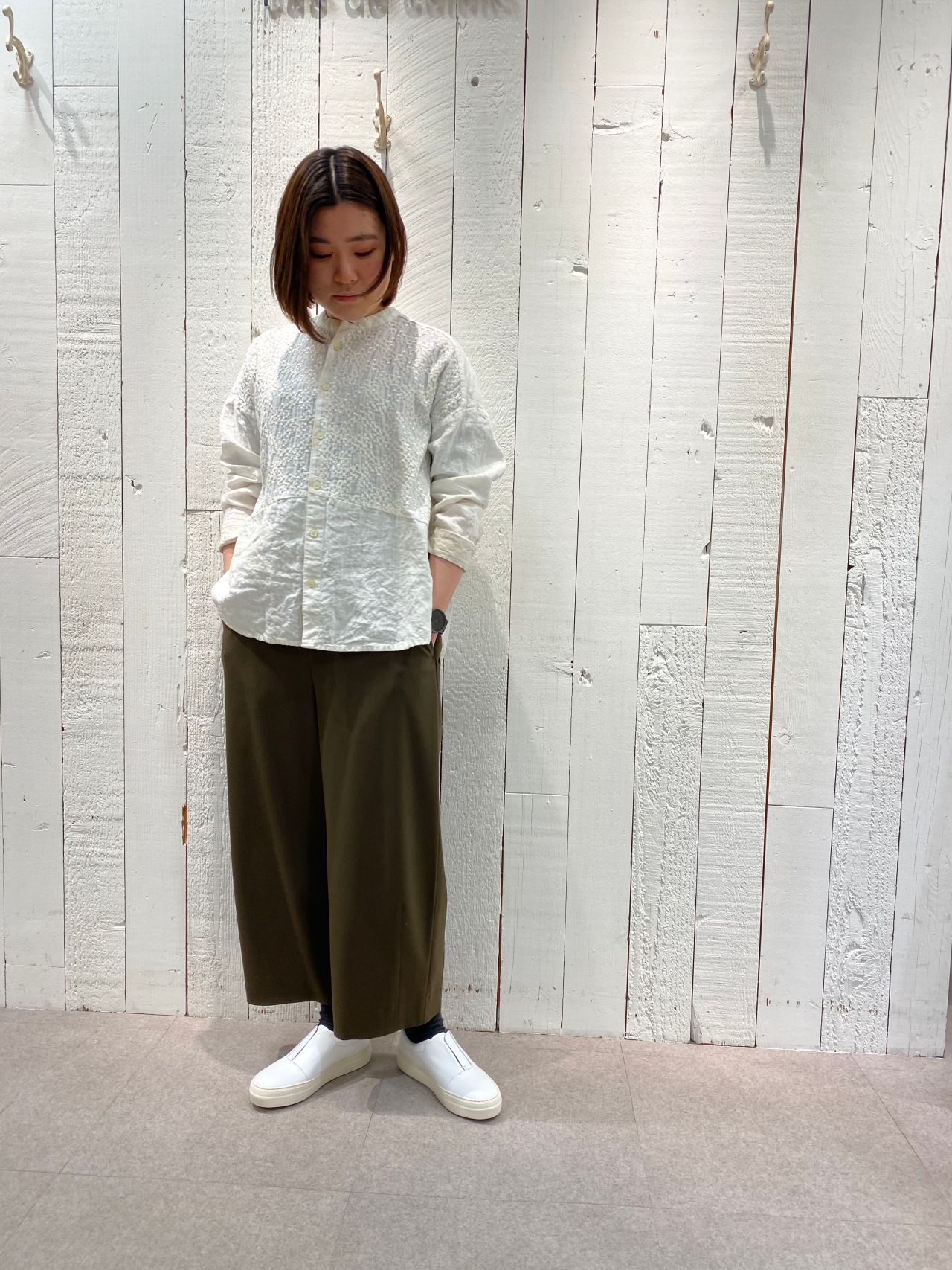 ノーカラーなので、ゆるっとなり過ぎない適度なきっちり感が◎。