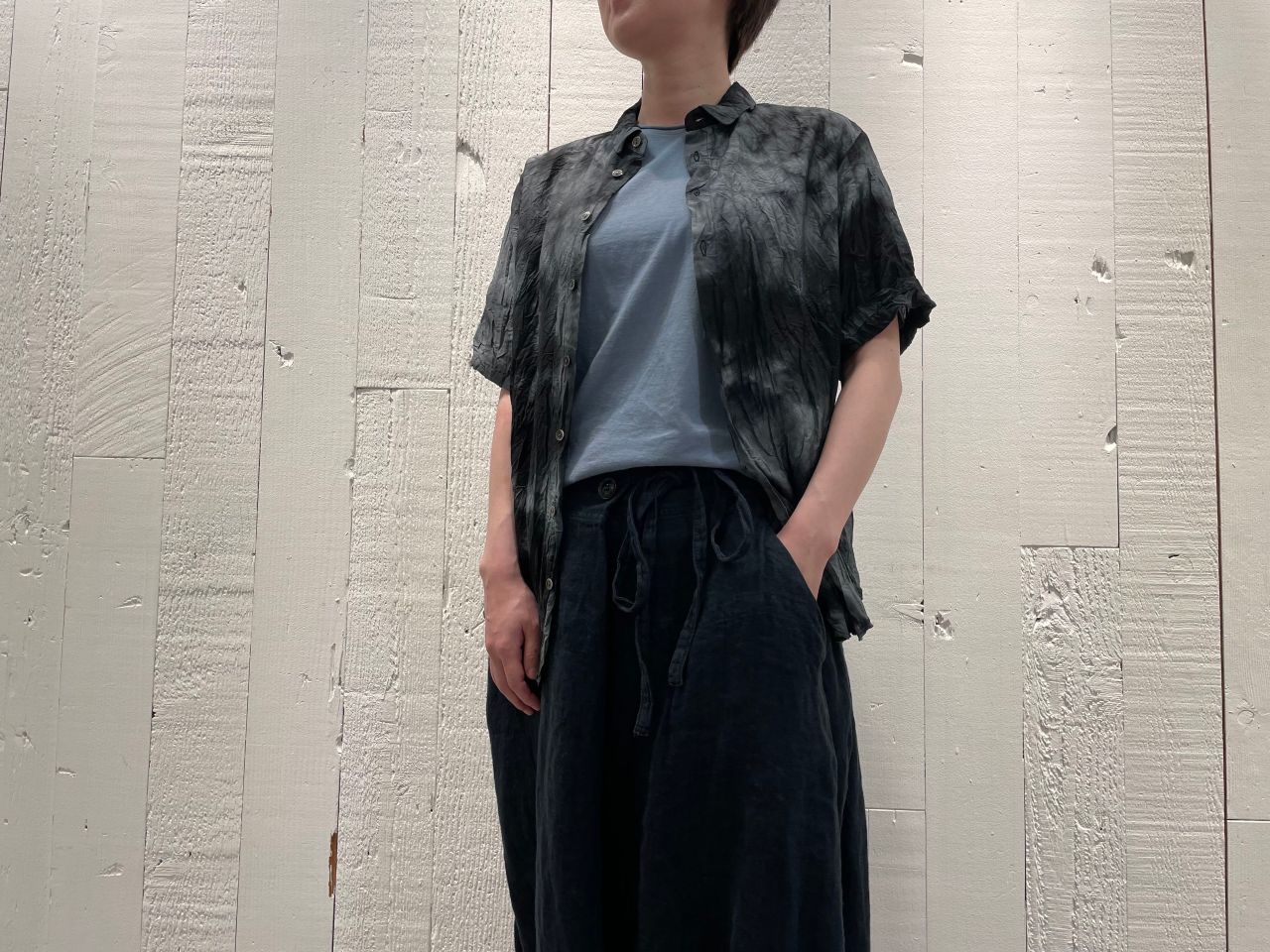 1枚1枚手作業で捻りながら染めることで、部分的に染料が入らず、独特のムラができあがったブラウス。
