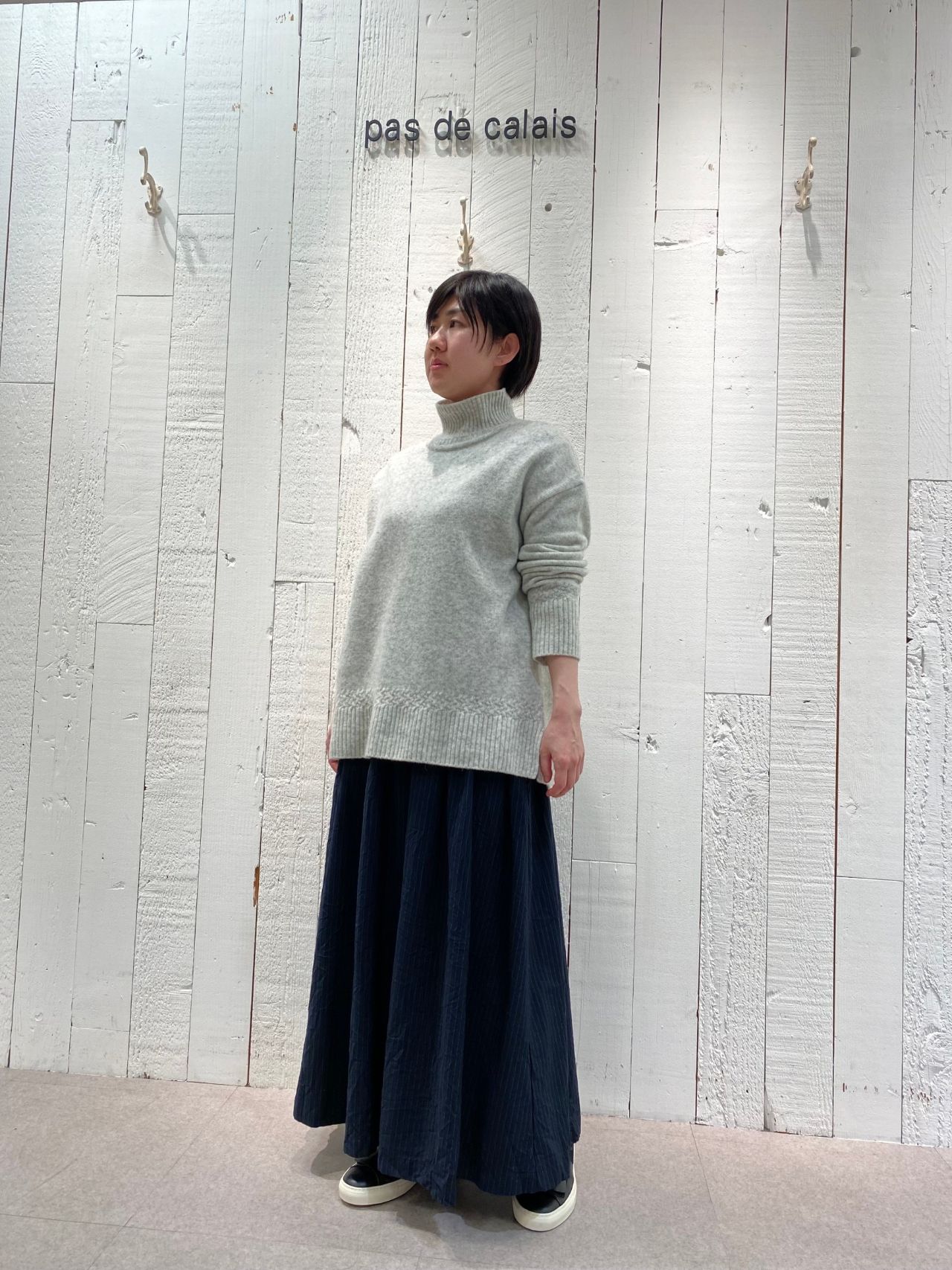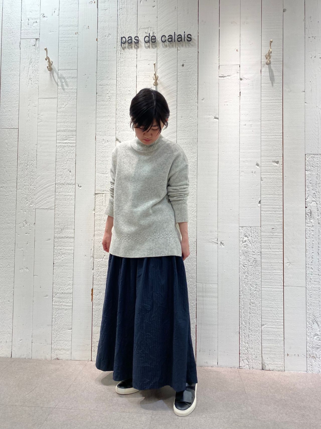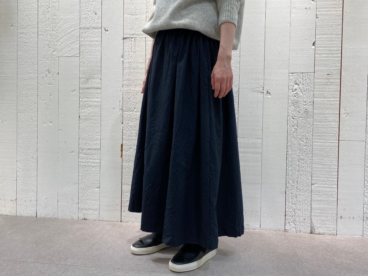 滑らかでキレイめな印象のポリエステルレーヨンのギャザースカートを合わせて動きやすくコーディネート。シワ加工を入れているのでパドカレらしい風合いに。