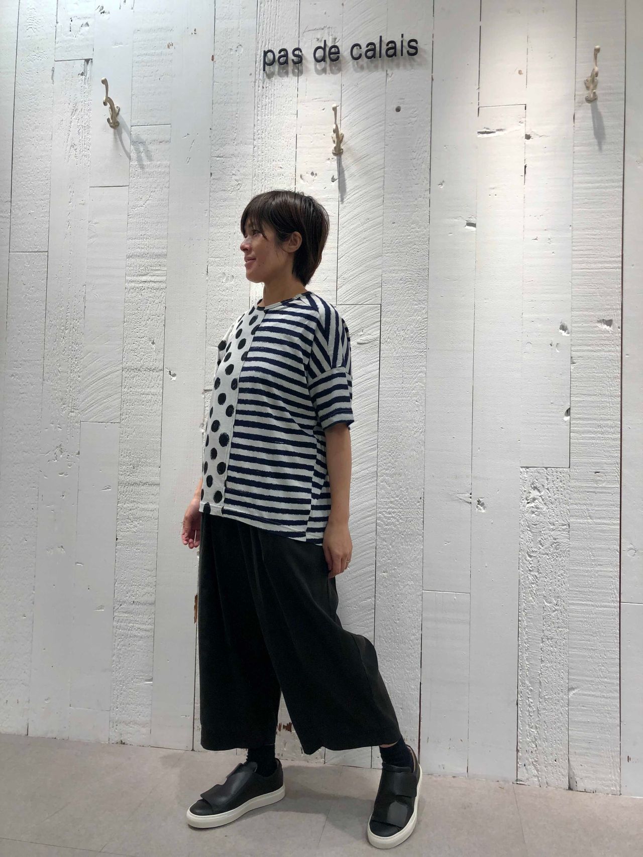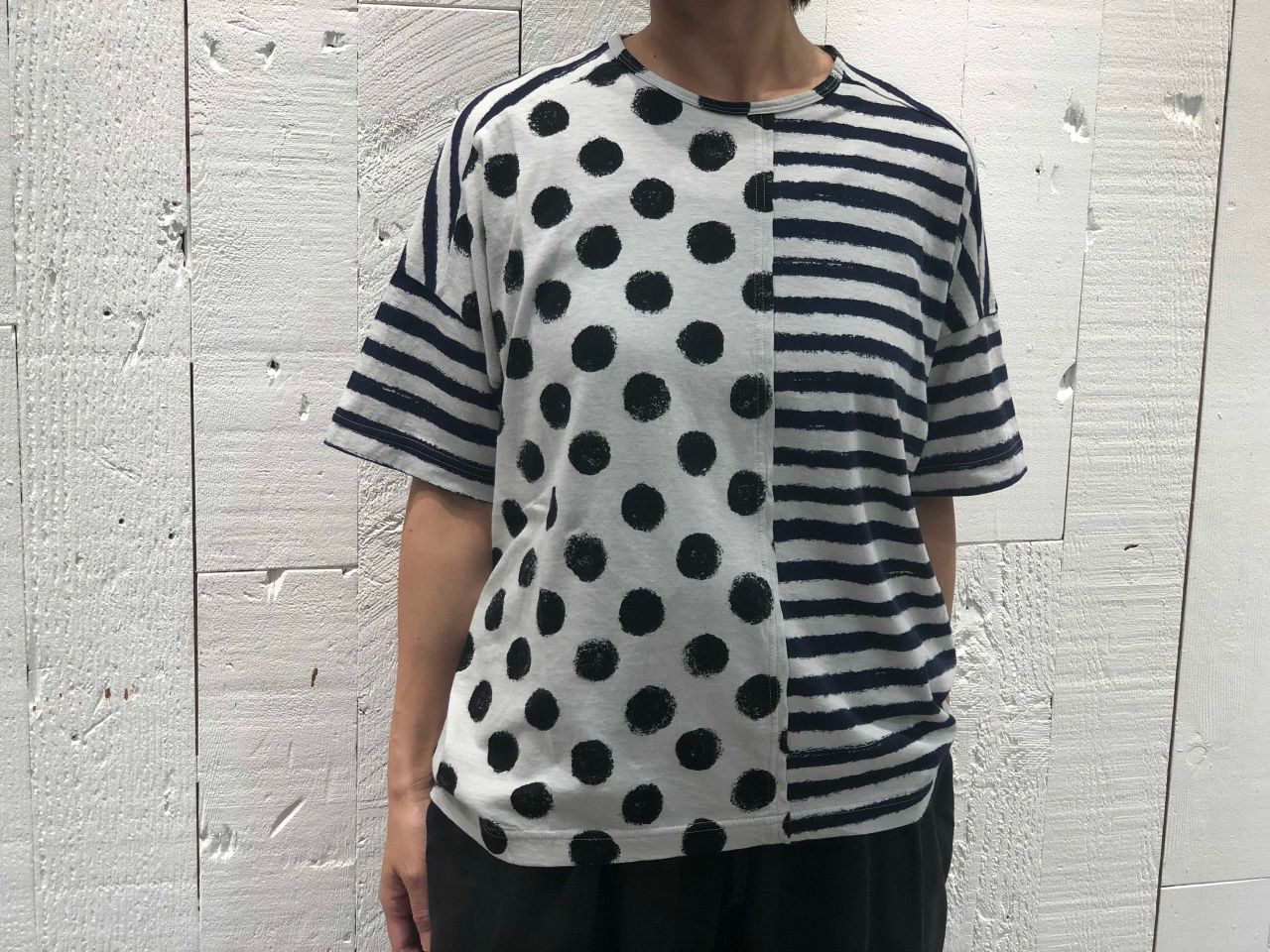綿素材を甘めに編んだ、心地良い肌触りのドット&ボーダーカットソー。