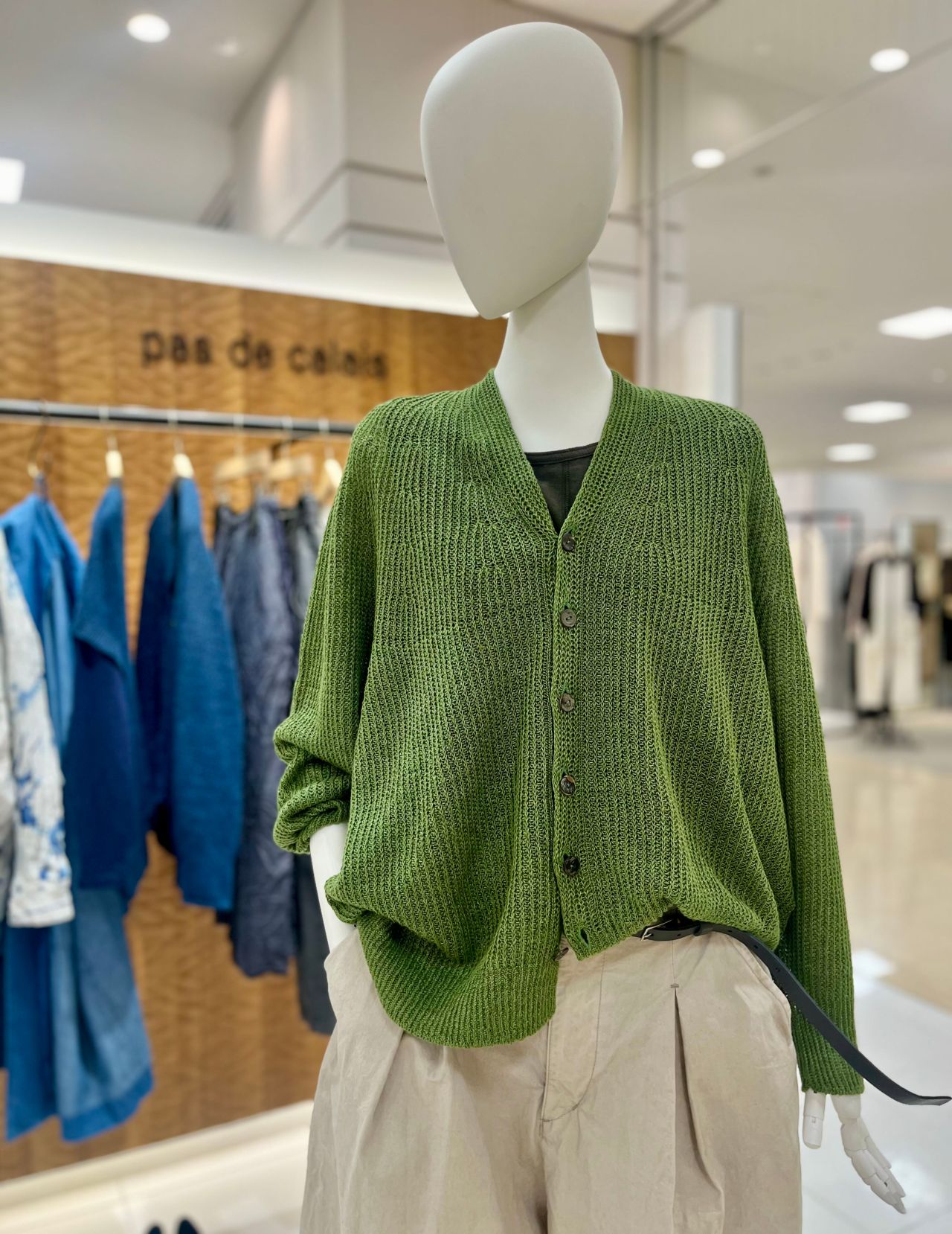 浅めのV開き、立体感のある編地で、さらりと羽織るだけで印象的な雰囲気です。
