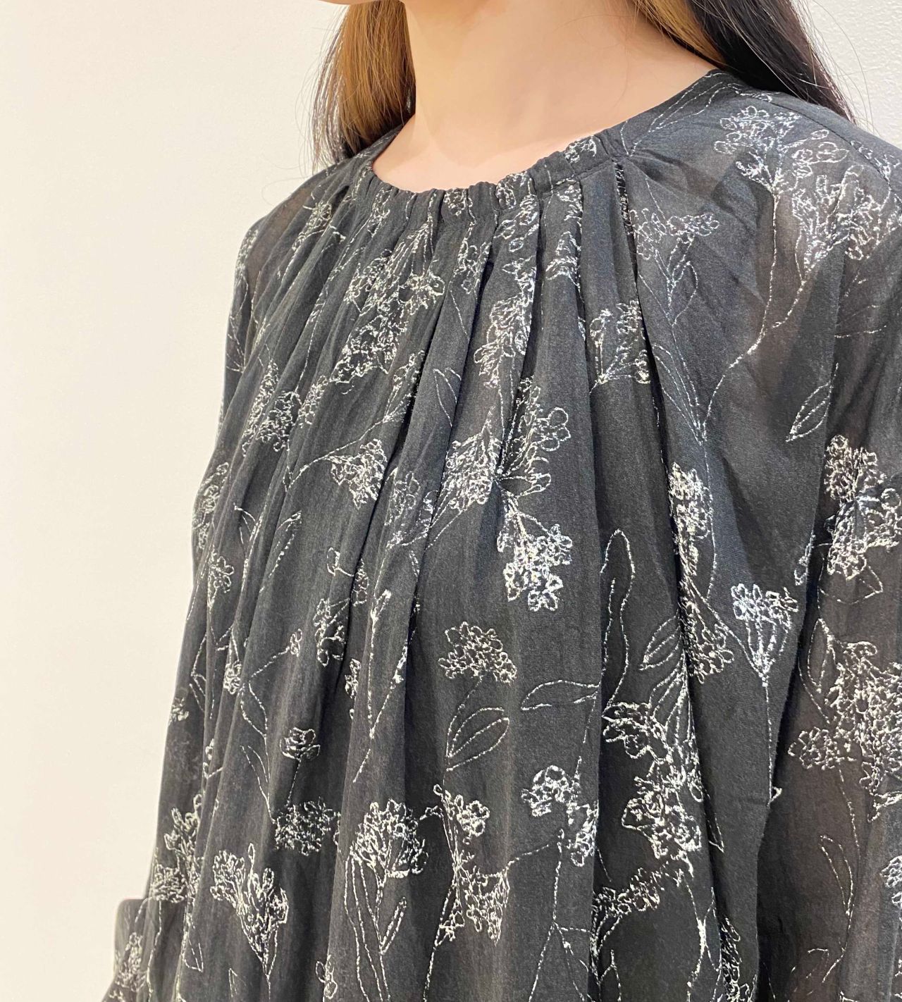 ネックラインにタックギャザーをあしらった女性らしいデザインです。