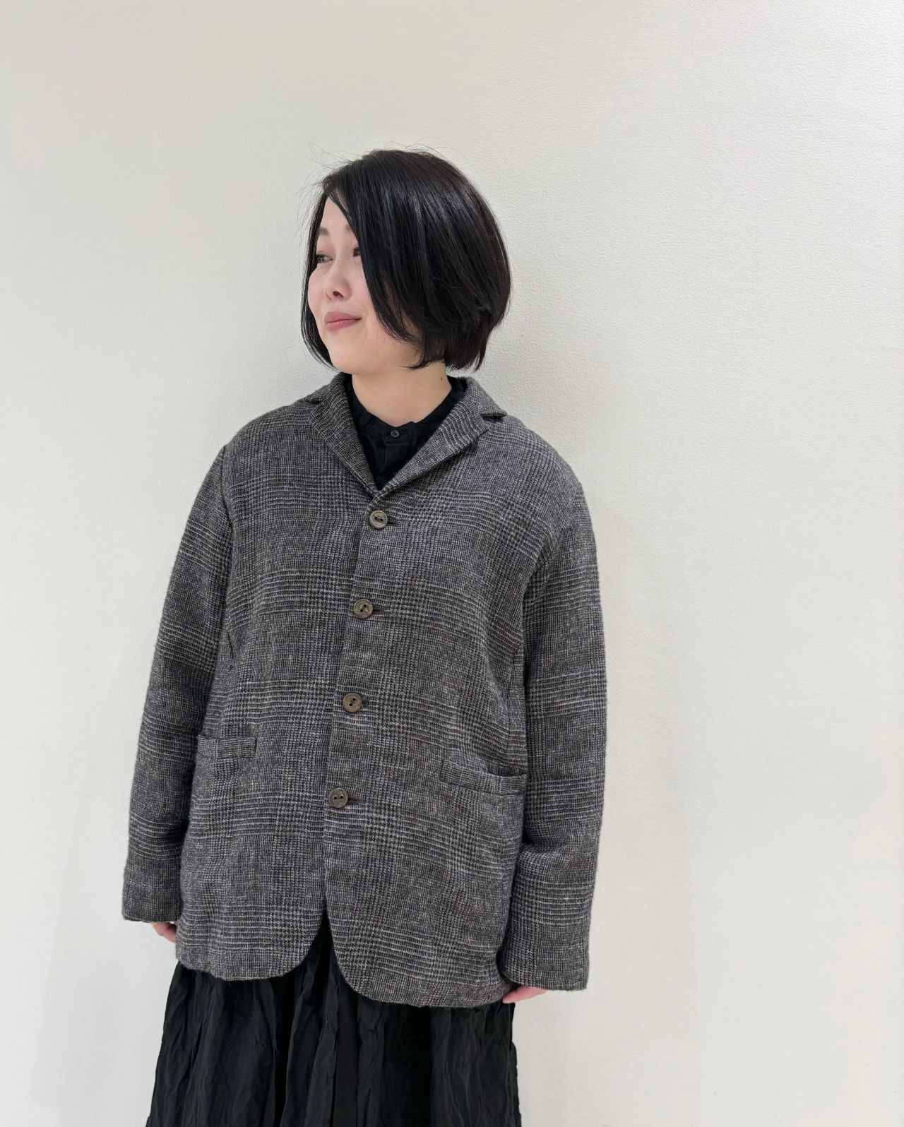 4つ釦のクラシックなボクシーシルエットのジャケット。