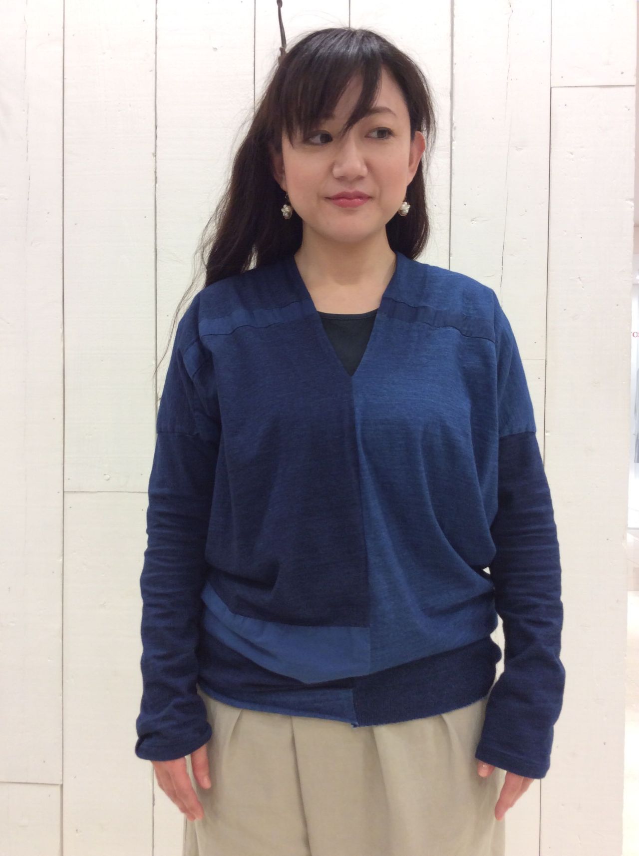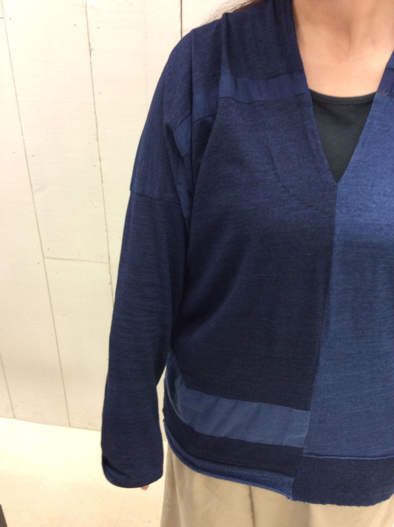 様々なインディゴ生地をパッチワークしたプルオーバー。
