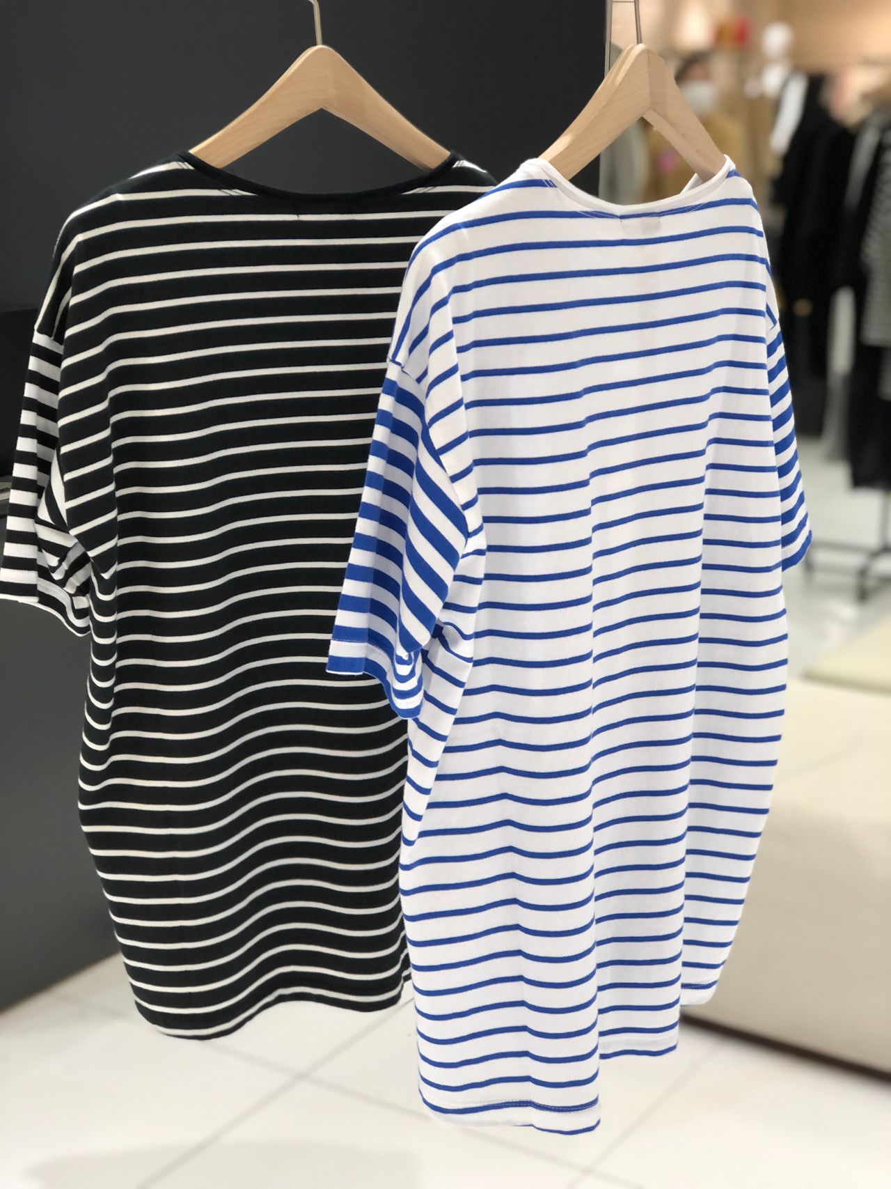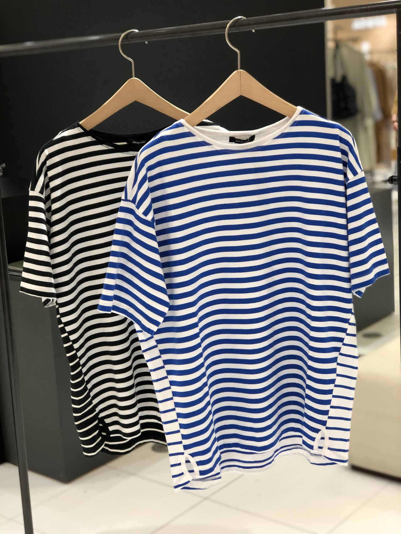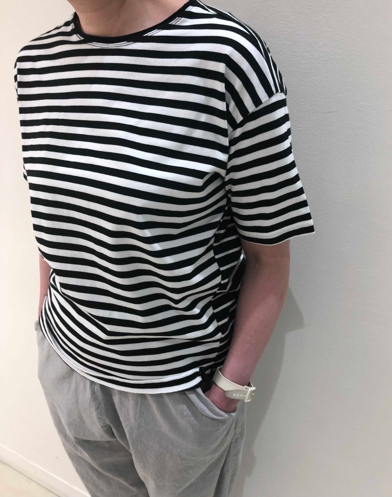 コンパクトなサイズ感のTシャツでボーダーのピッチ巾違いをコンビし衿とスリットにも小技を効かせた1枚です。
