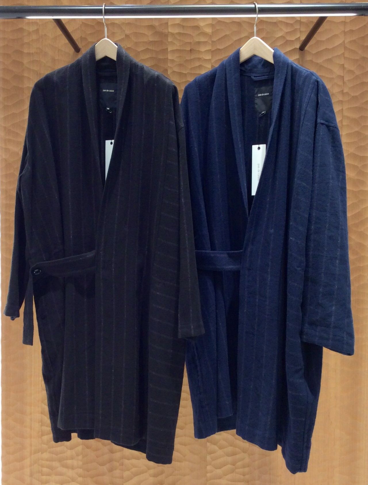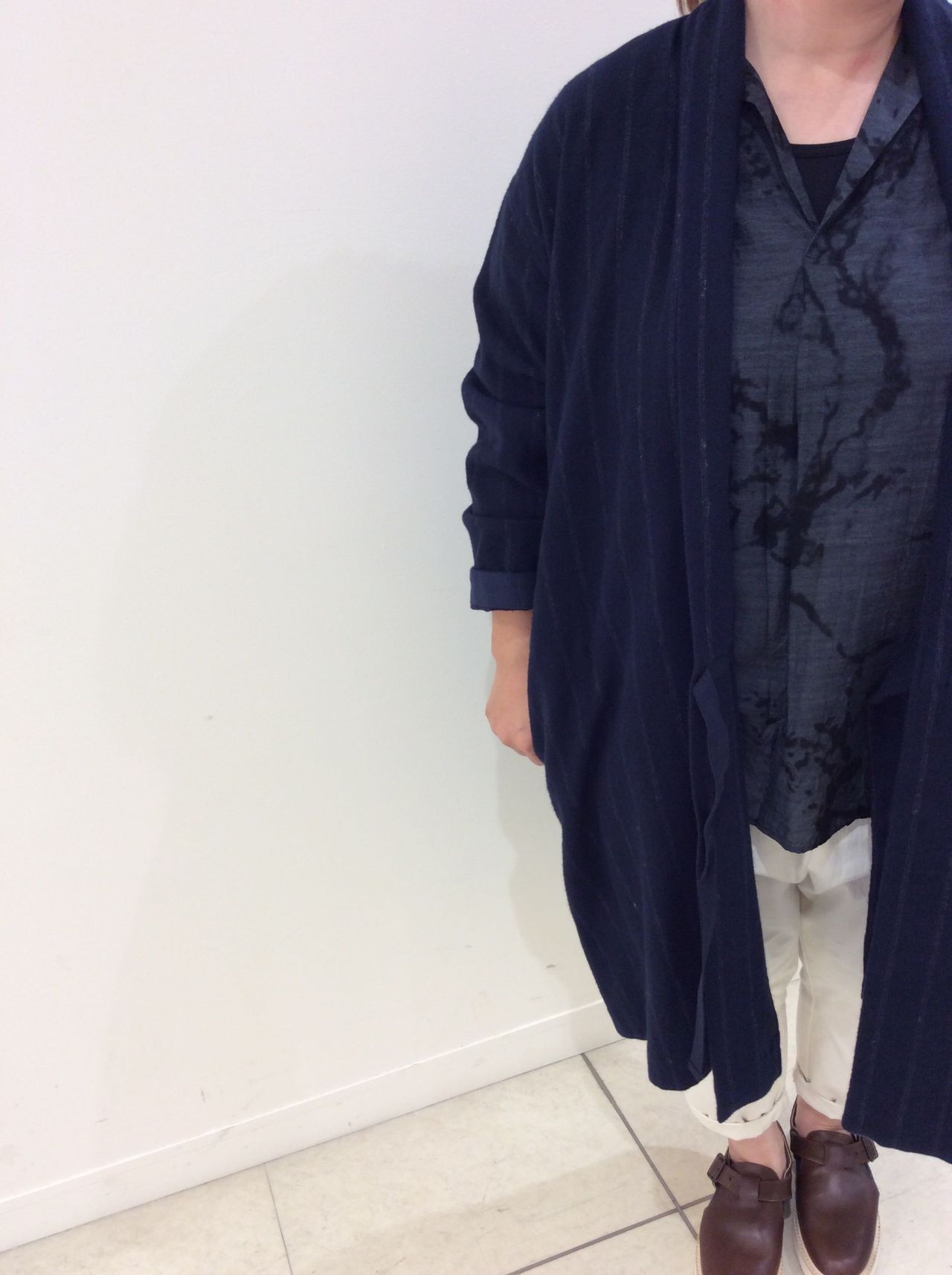 ネルストライプのコートは、リネンコットン素材で柔らかく今時期から来て頂けます。