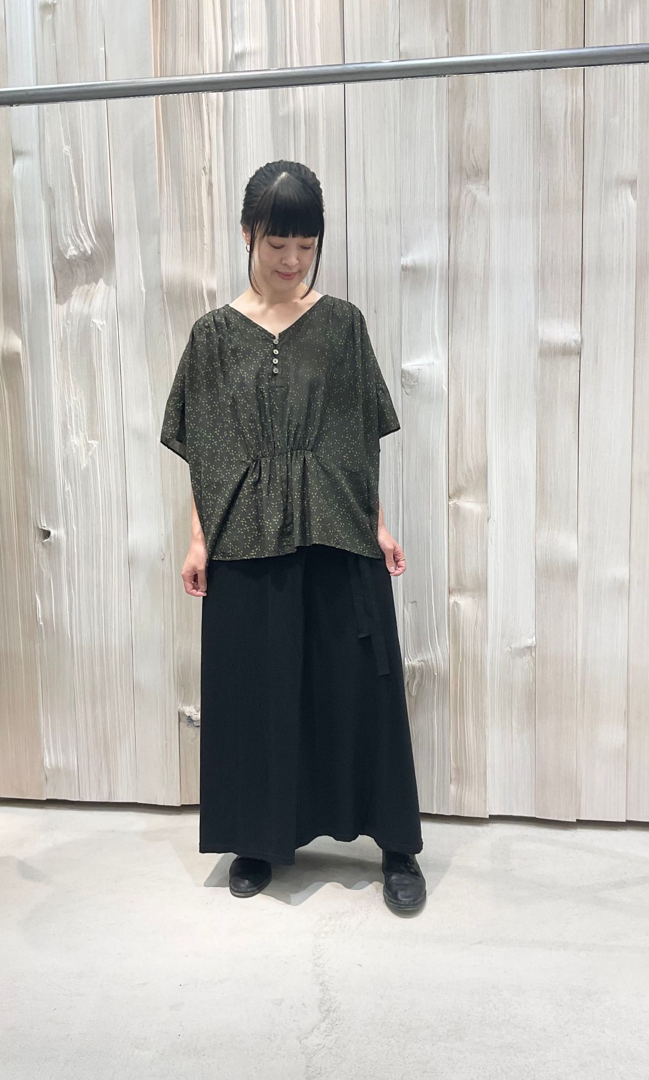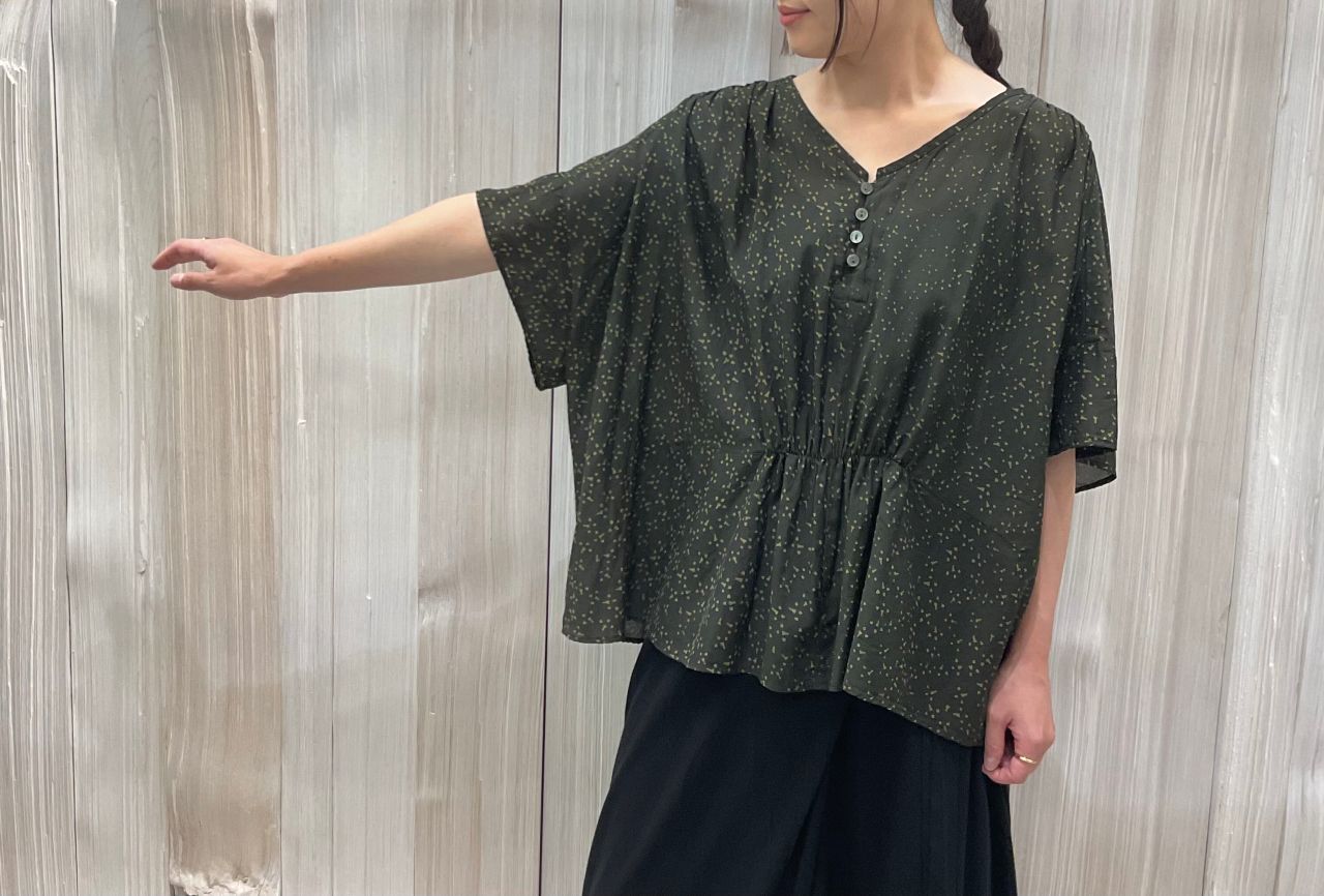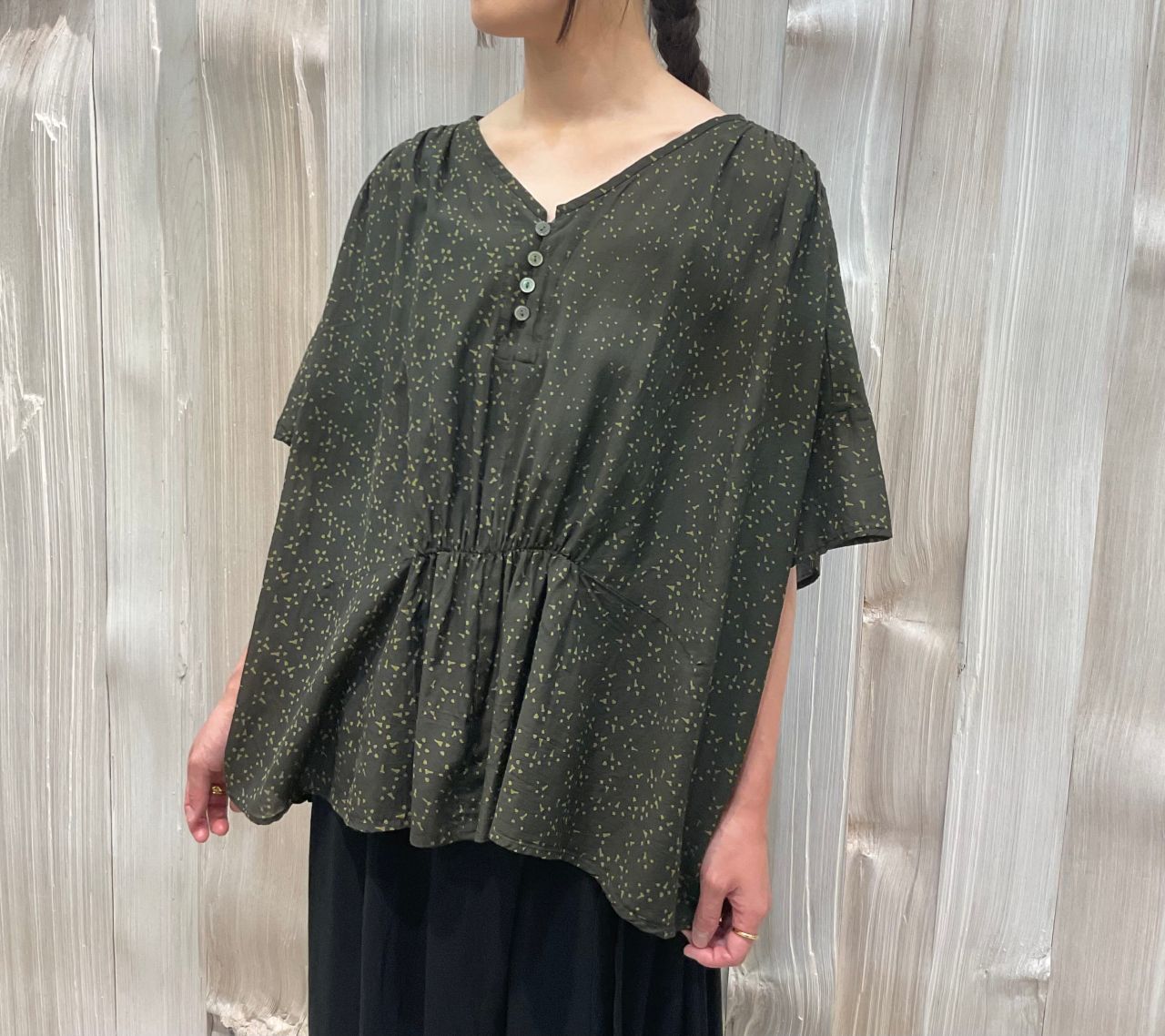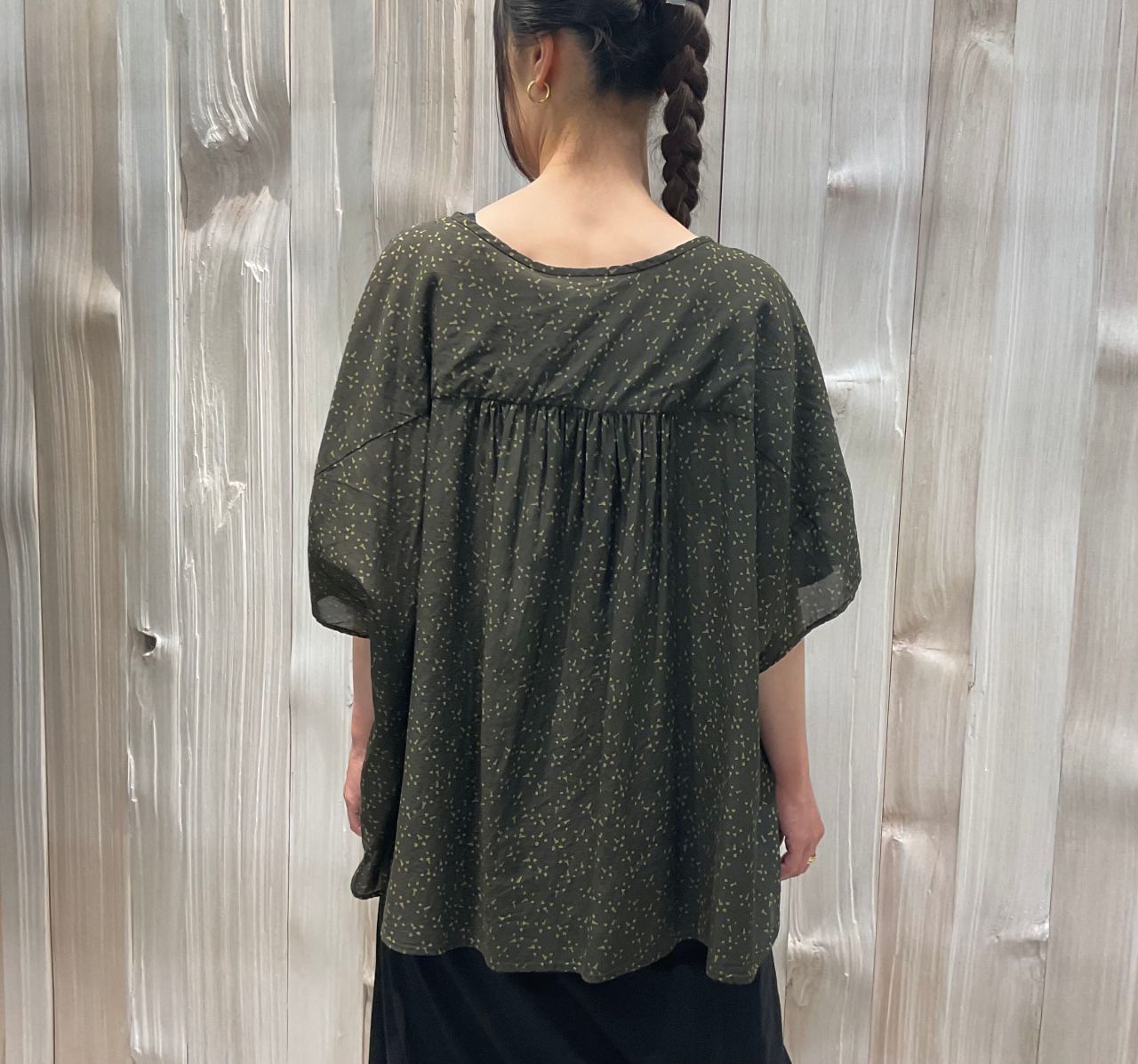 さらりと肌離れの良い素材で、快適さとエレガンスを両立したブラウス。フロントヨーク下に入るギャザーとウエストのシャーリングディティールが女性らしいデザイン。