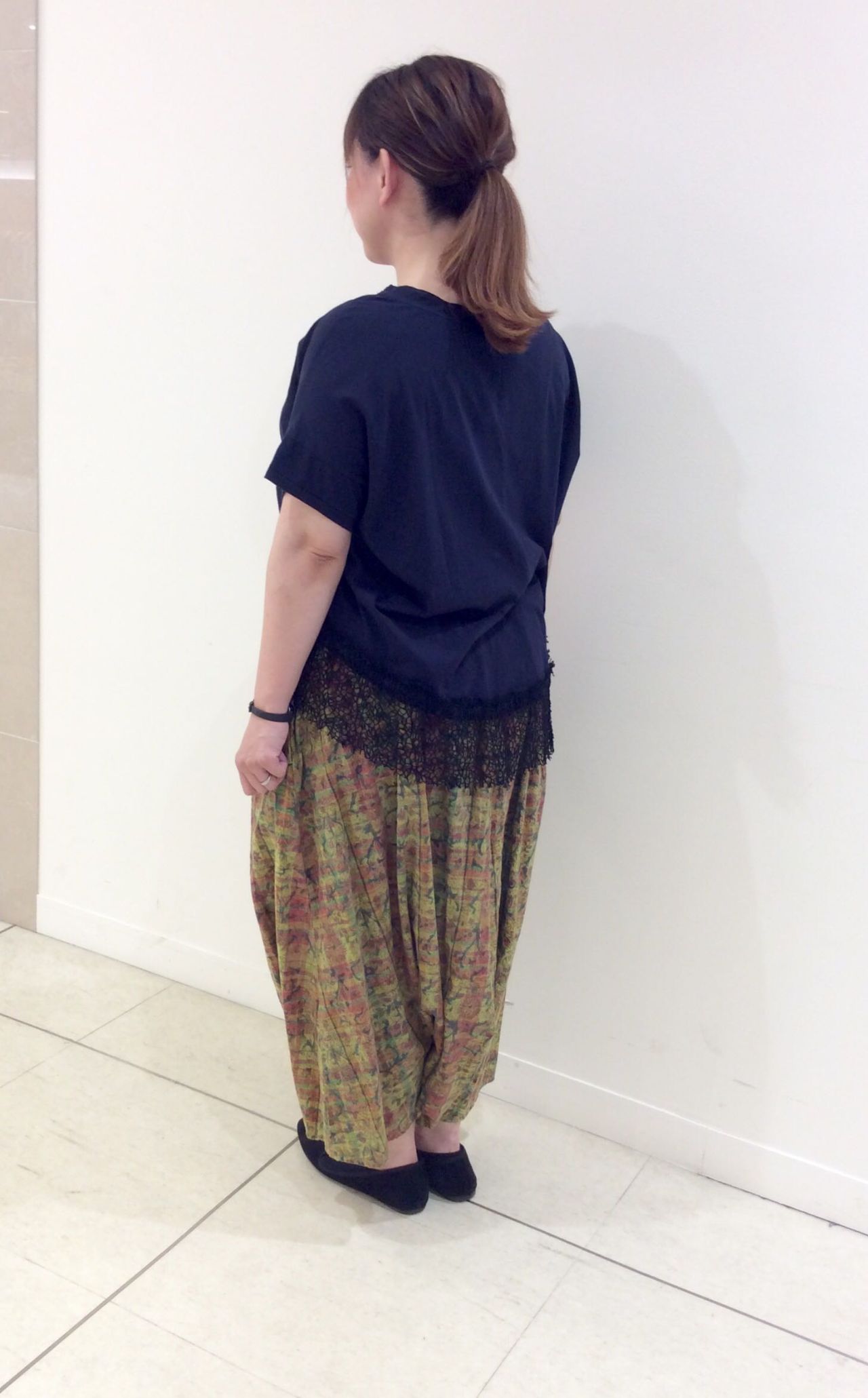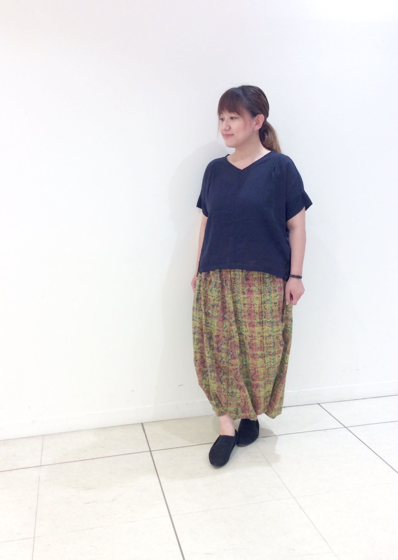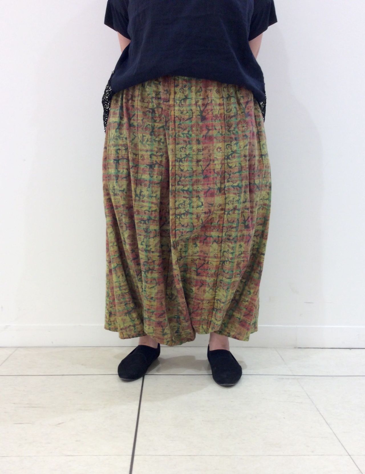 ブロックプリントのパンツは両端から足を出す作りになっていて、ふんわり感がオシャレです。