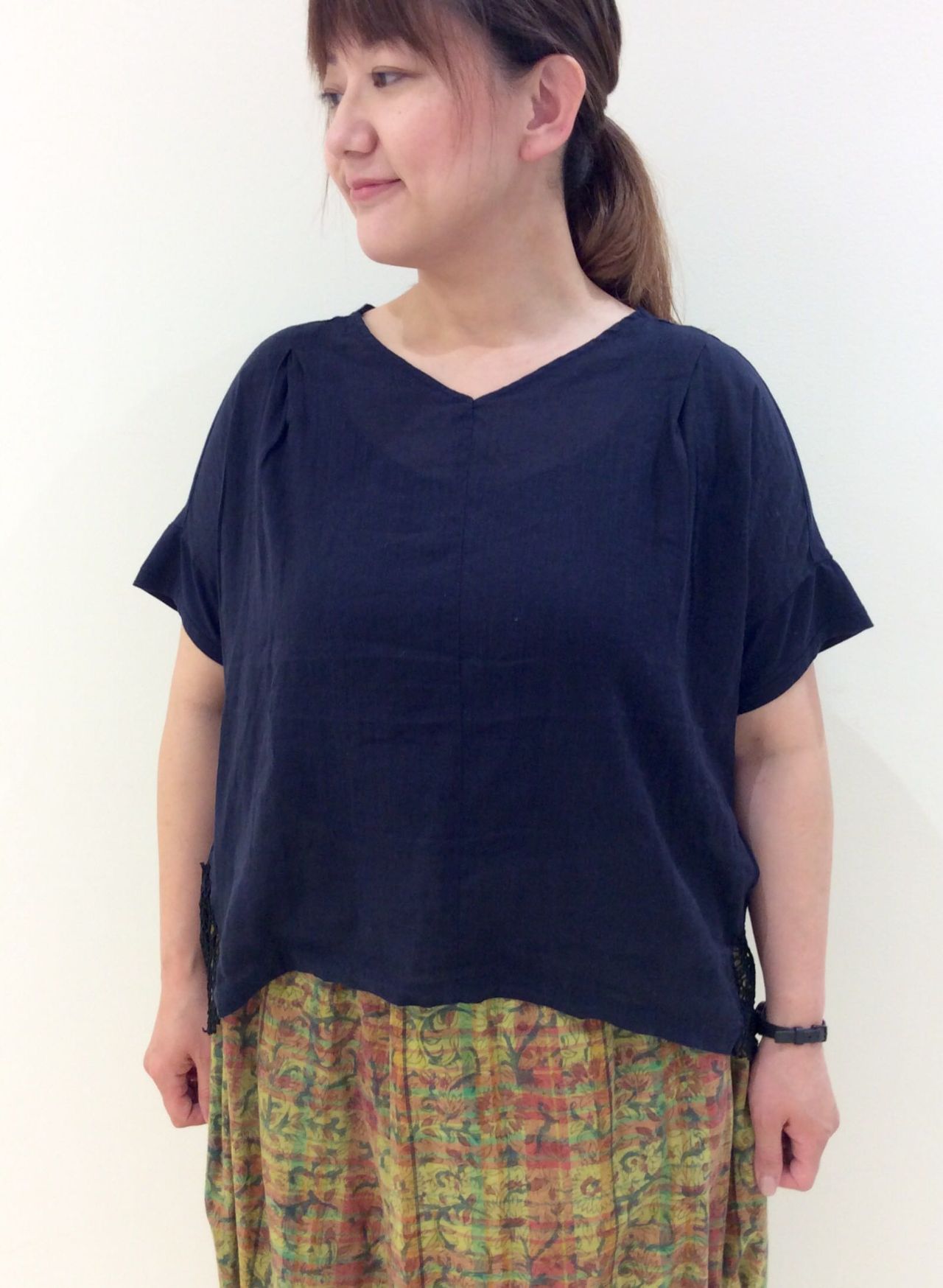 Vネックのブラウスは、前身頃がブラウス生地で後身頃がカットソーになっております。