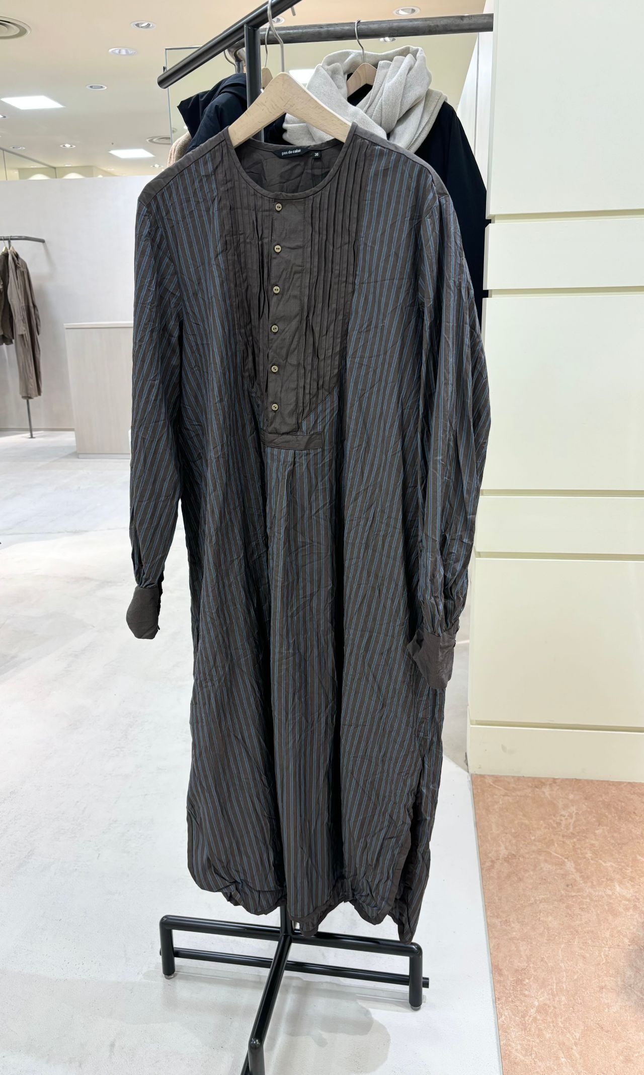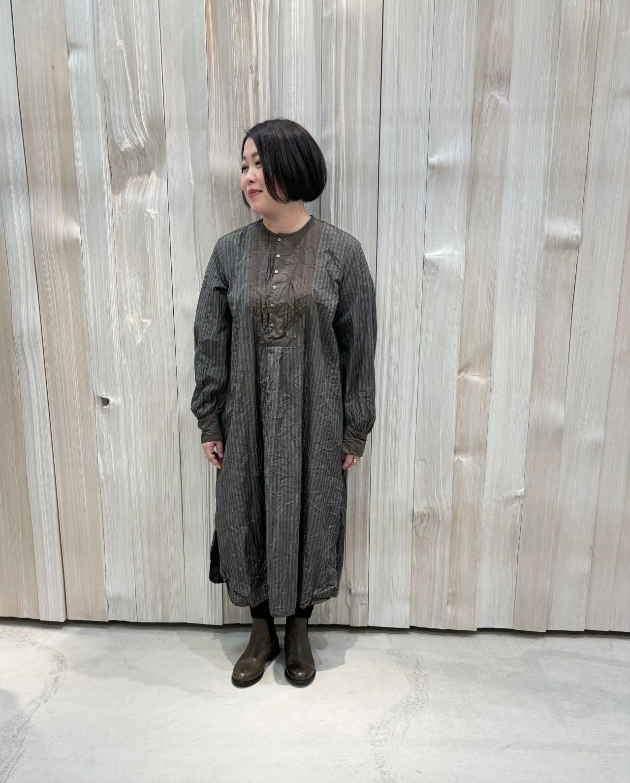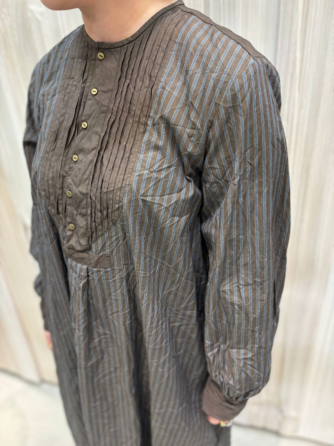 ゴールドの小ぶりのボタンとピンタックがクラシカルな印象。