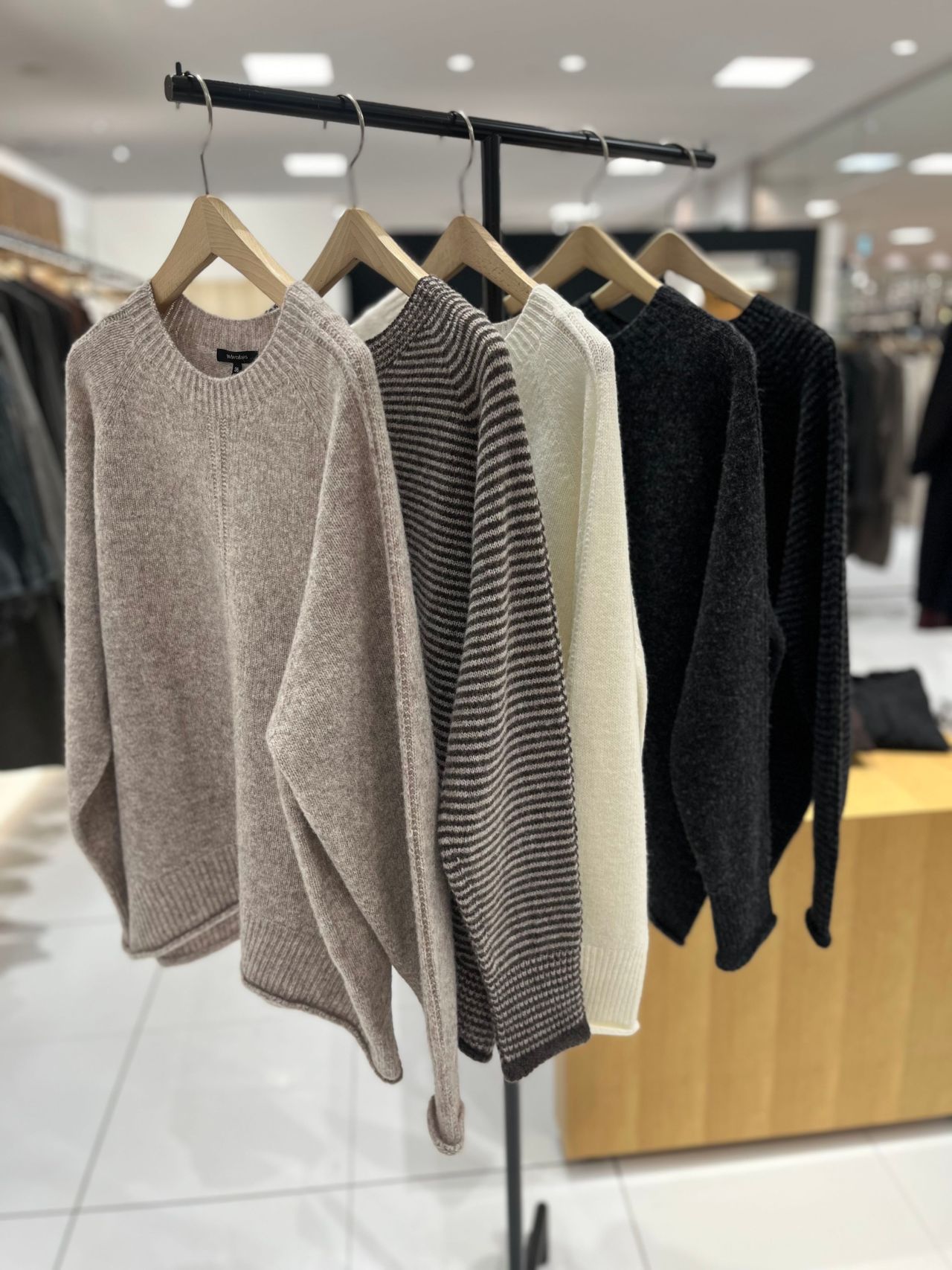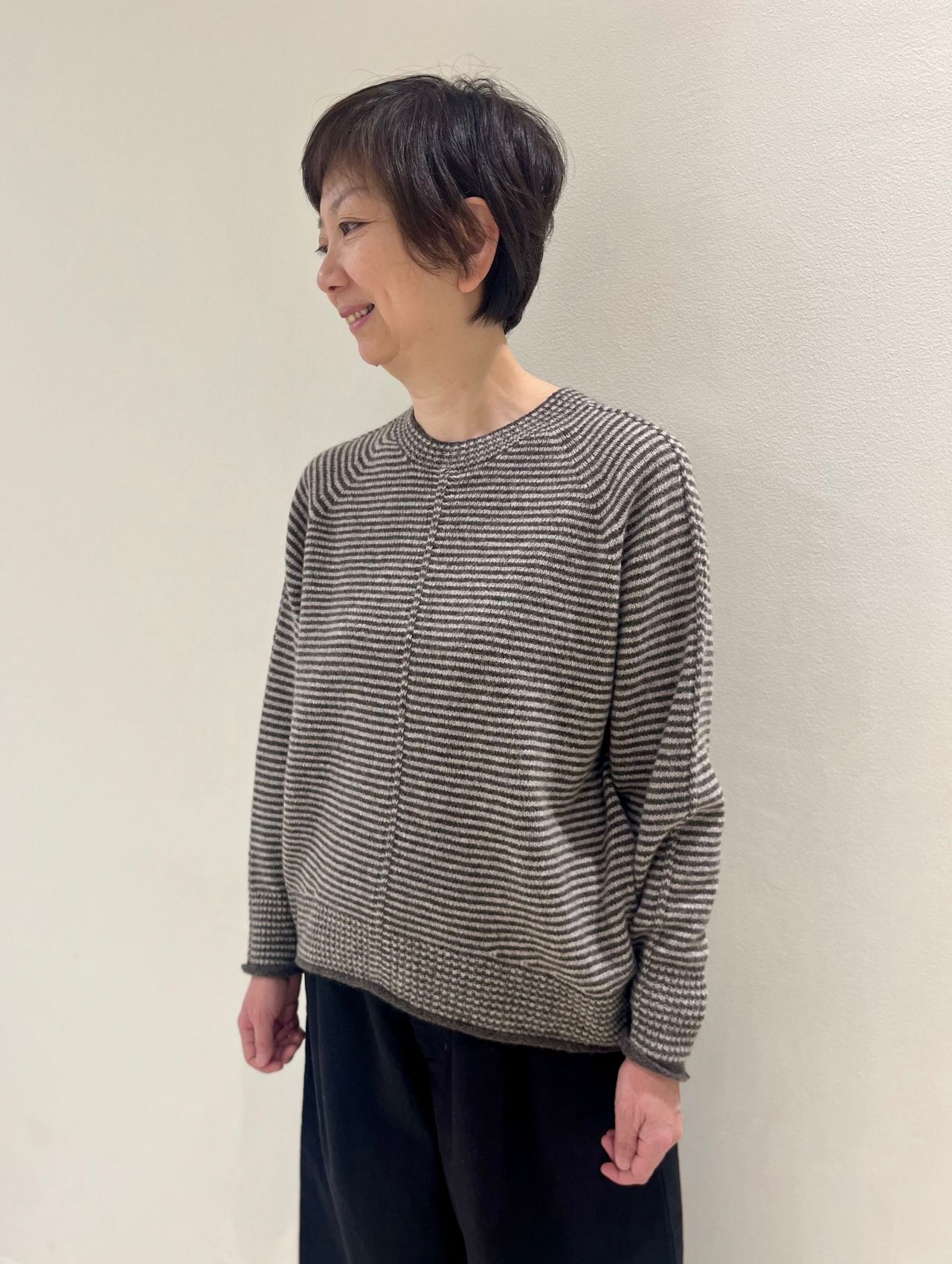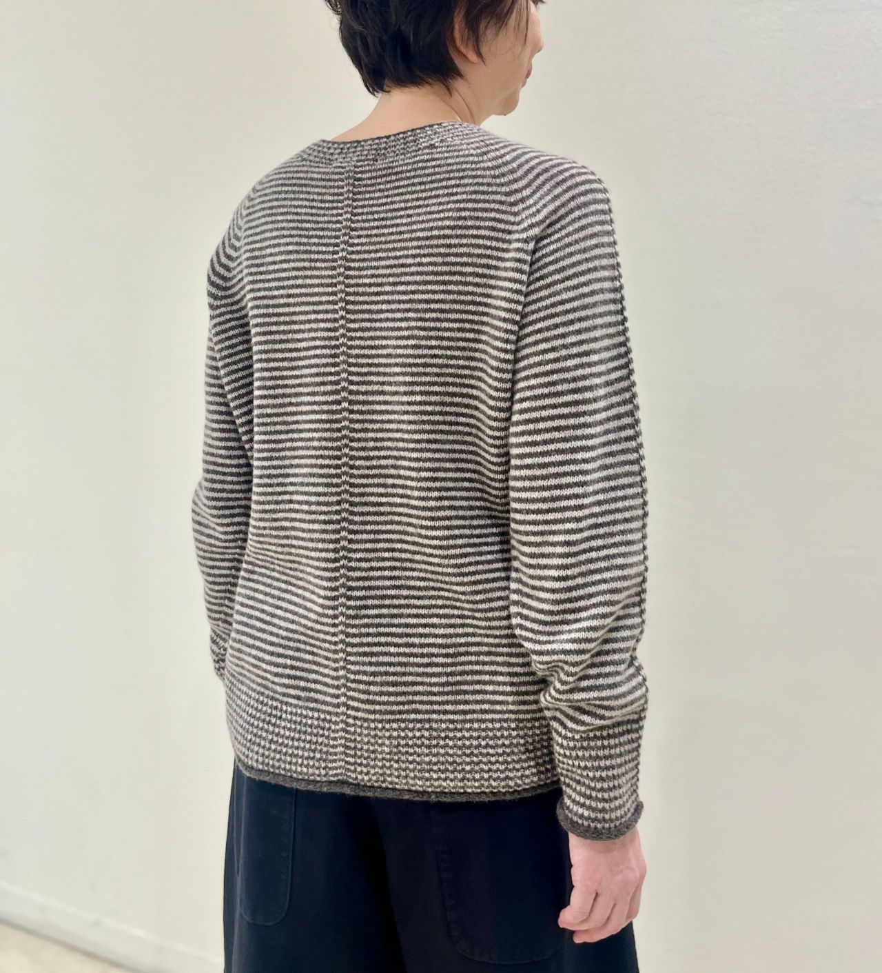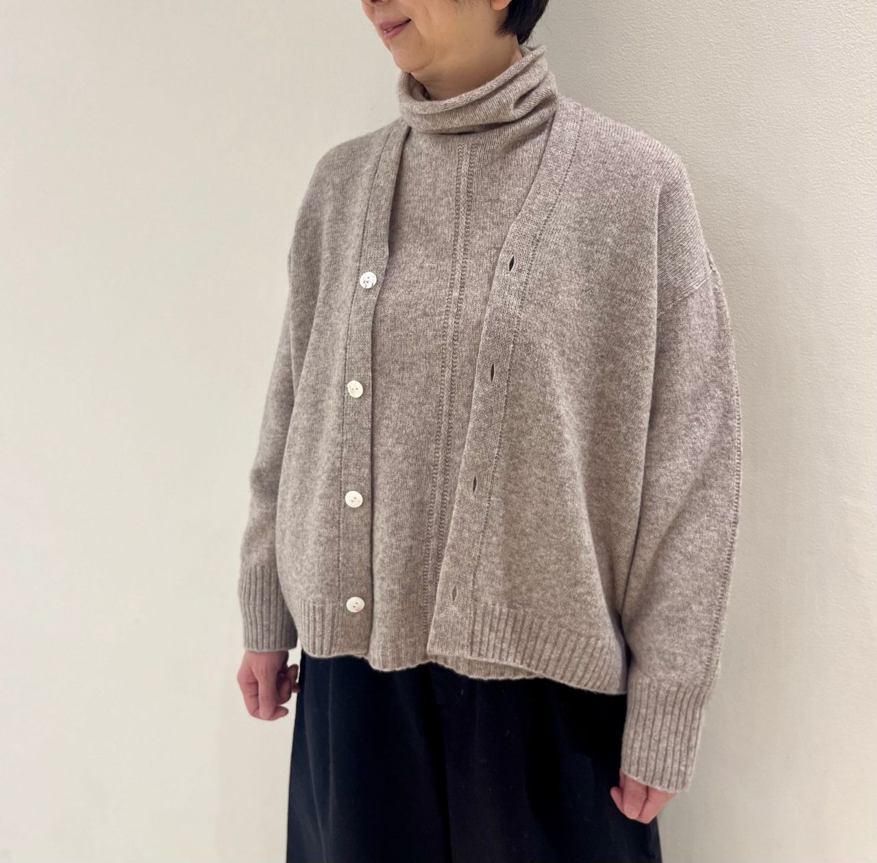 先にご紹介いたしましたクルーネック、オフネックと合わせてアンサンブルとしても素敵です。