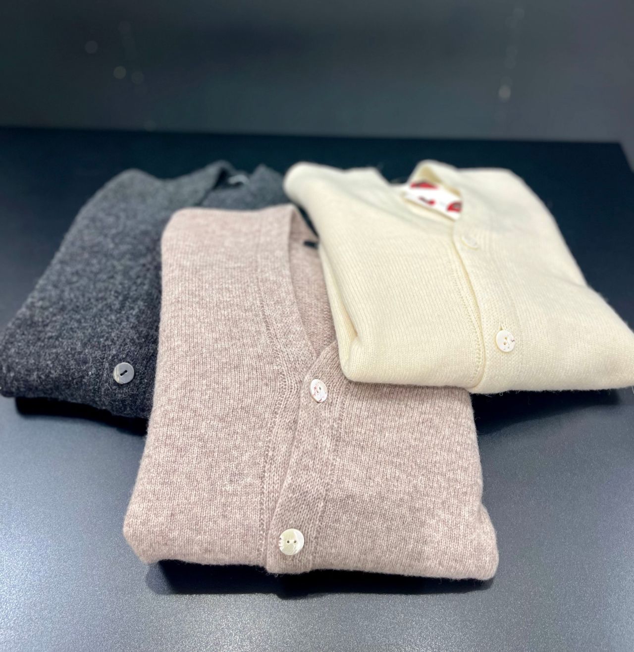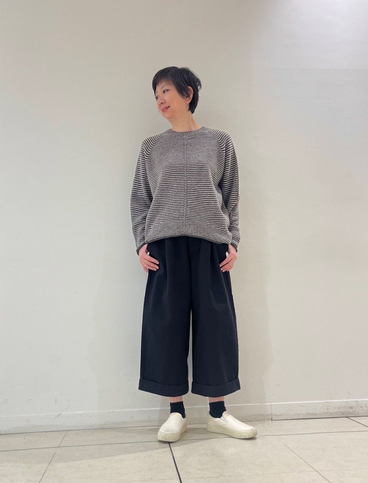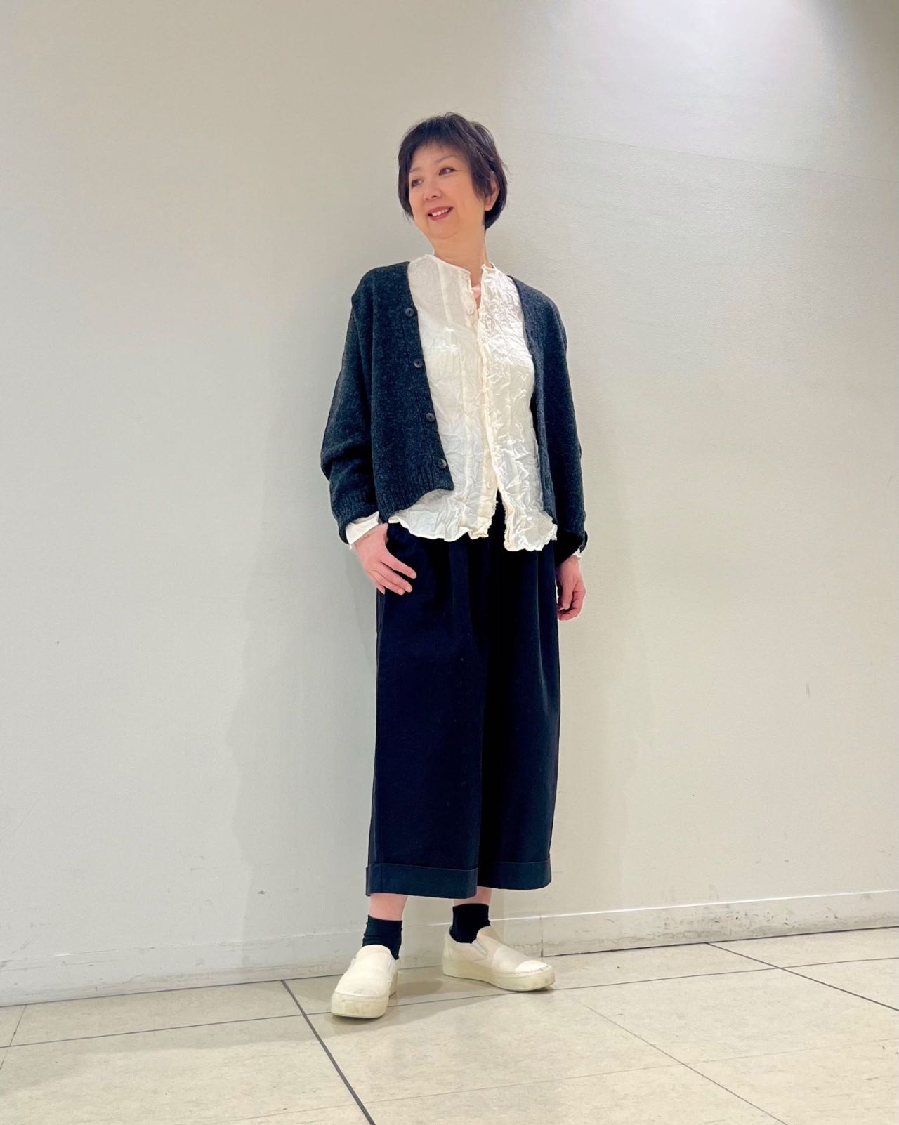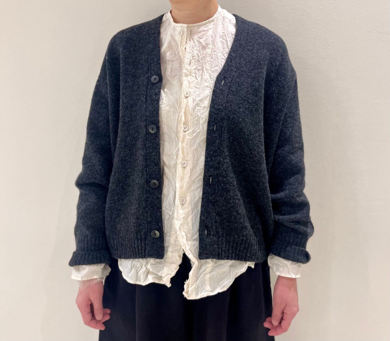 カーディガンはコンパクトに見えますが腕周りが程よくゆったりなのでモコモコしませんので安心です。