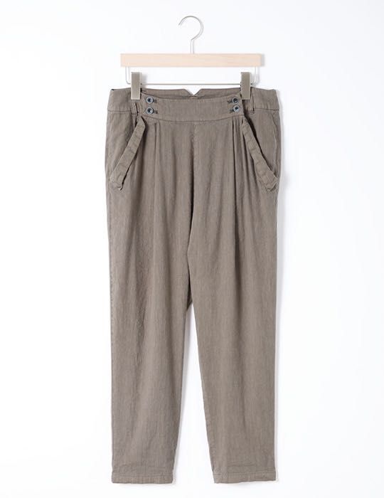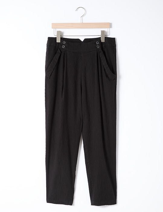 ポケットとウエストの釦が印象的な、細身の9分丈テーパードパンツ。