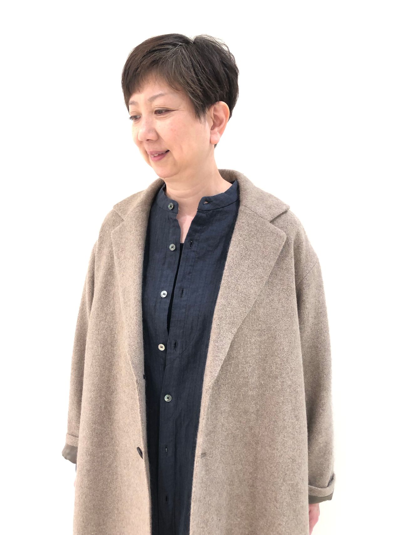 大きめの襟です、釦は水牛釦を使用しています。