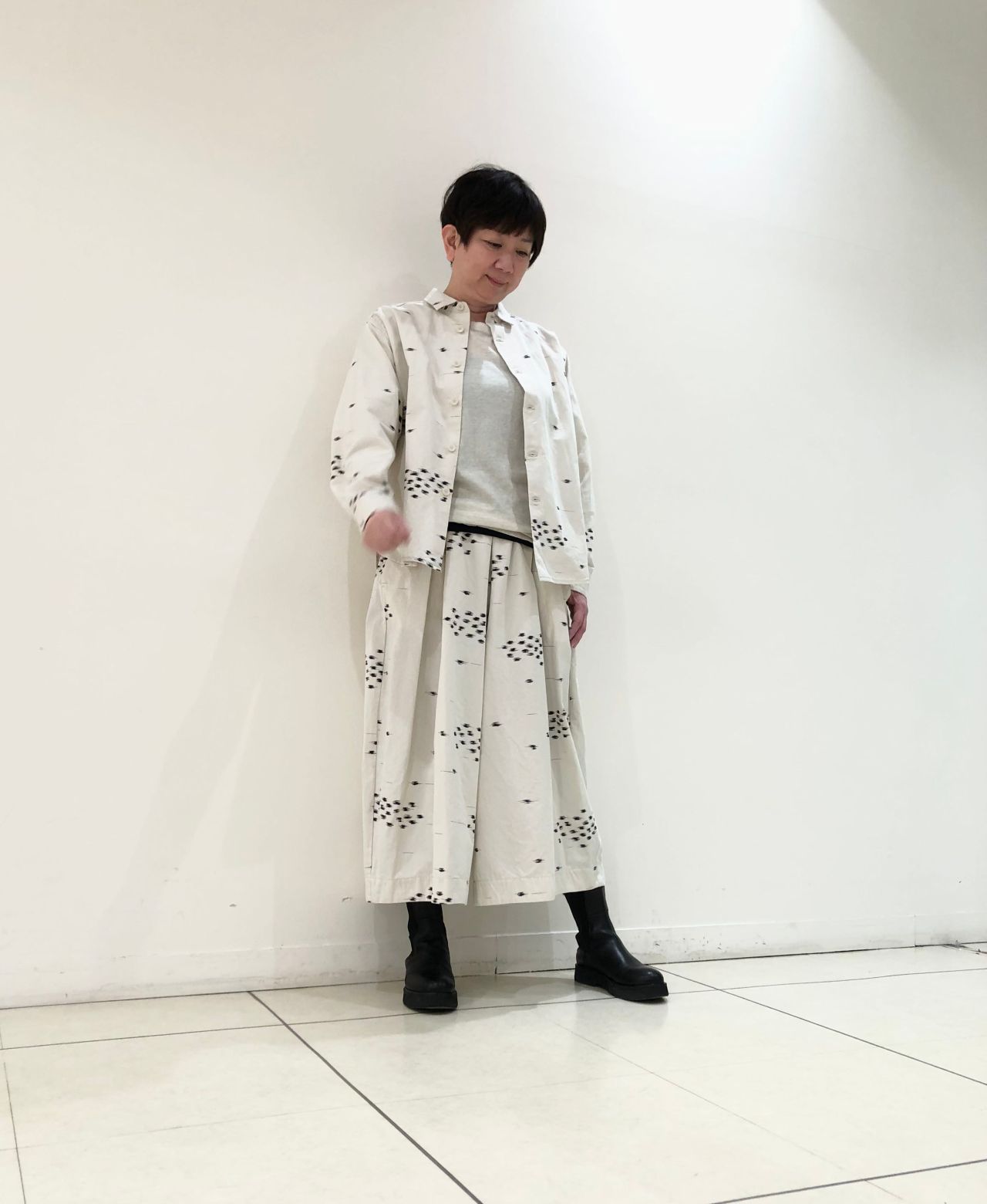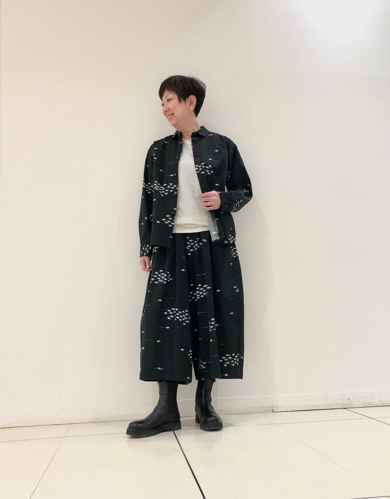 新作の「綿麻ツイルプリントパンツ」は、スカートライクなボリュームが特徴のガウチョパンツ。