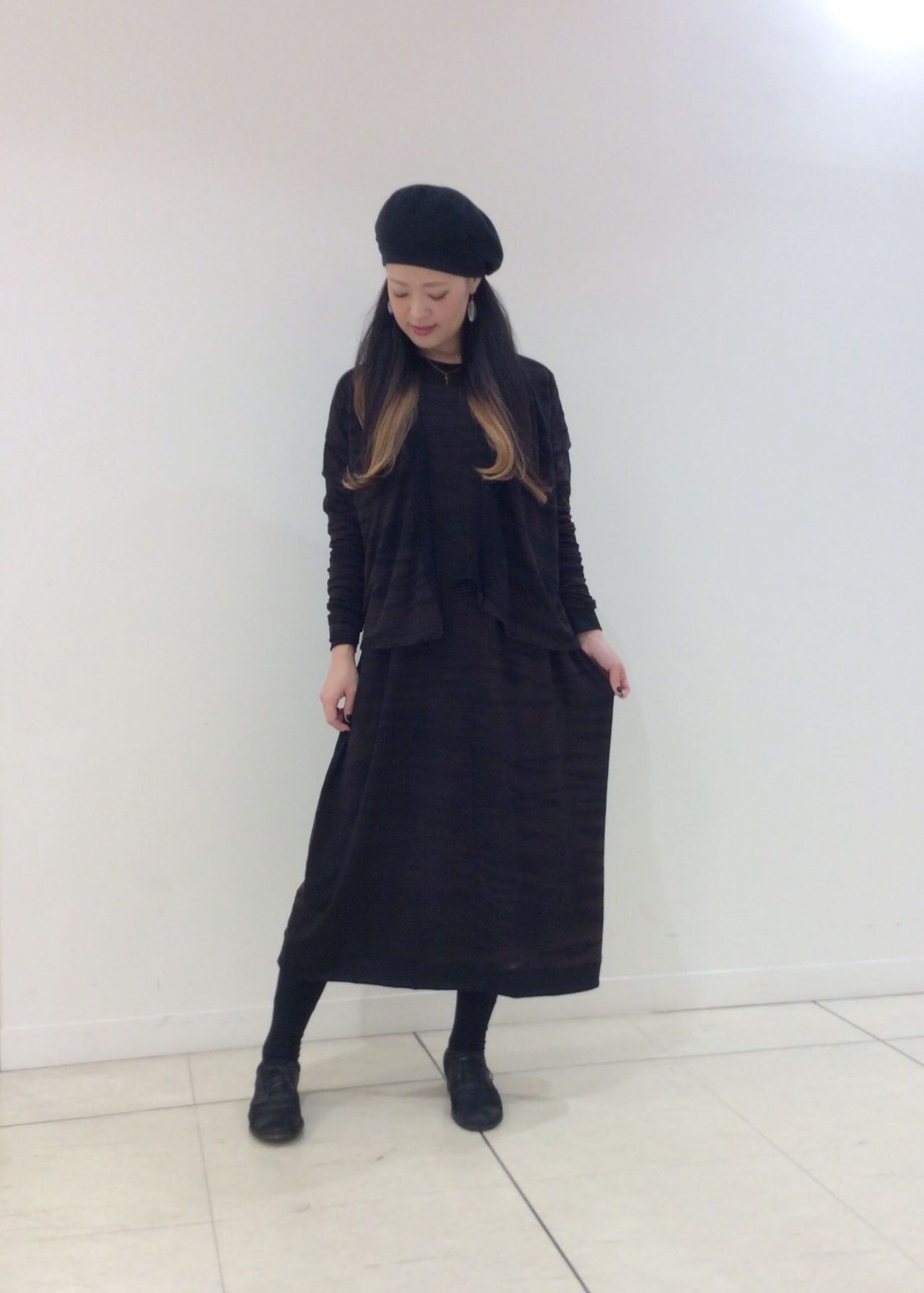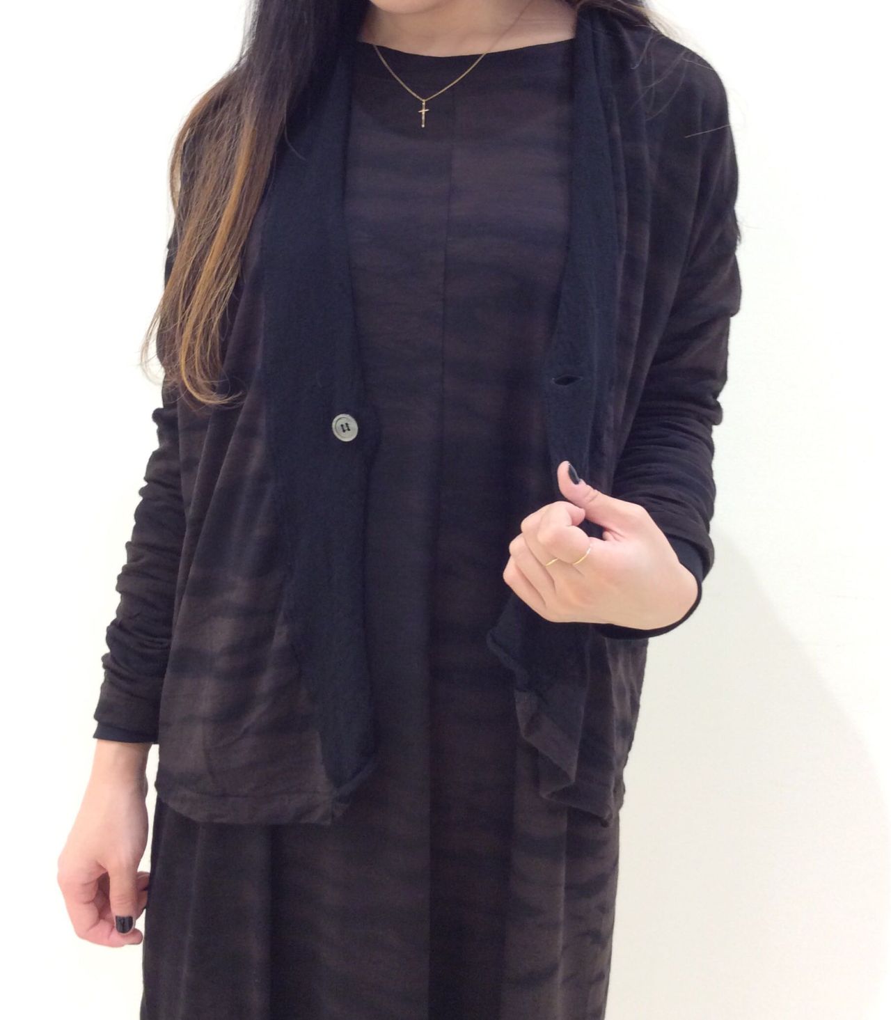 同シリーズのカーディガンを羽織ったアンサンブルコーディネートも素敵です。