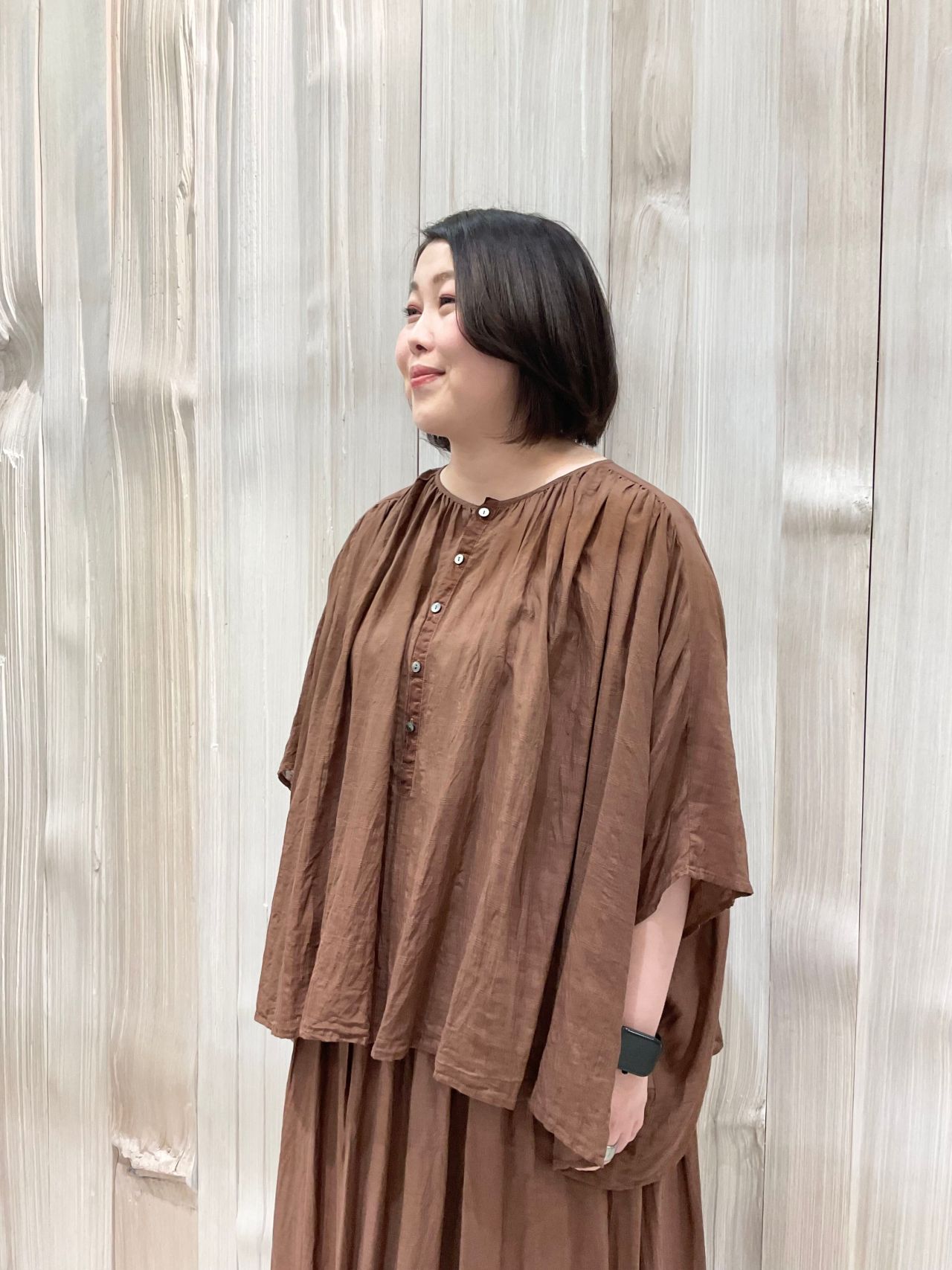 体に張り付かないリラックスシルエットで二の腕もカバー。