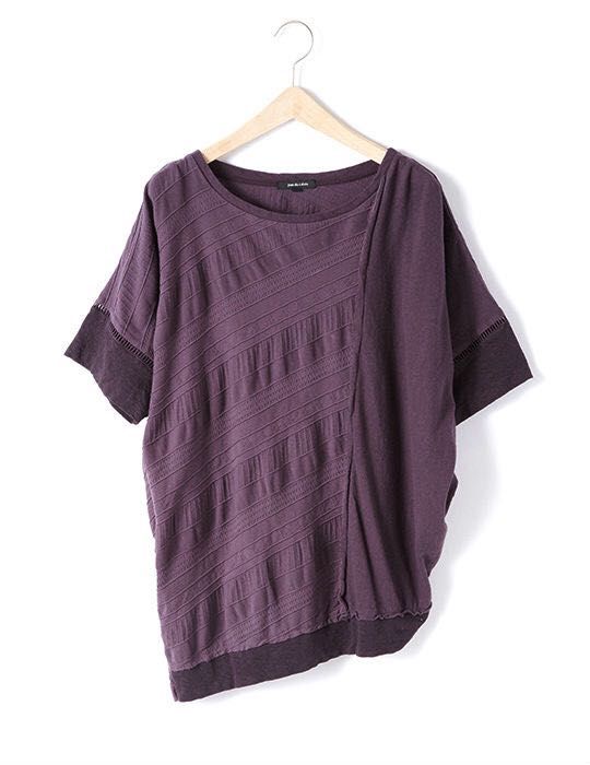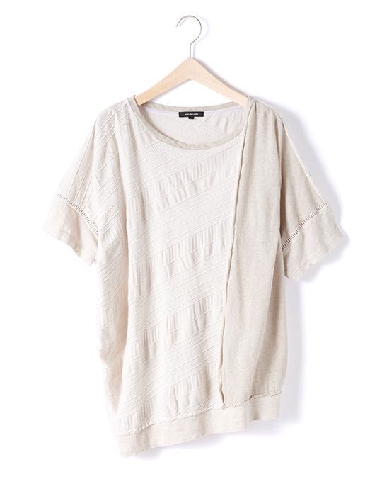 リネンカットソー、ジャガード、ラフィ天竺の素材を接ぎ合わせたデザインのカットソー。