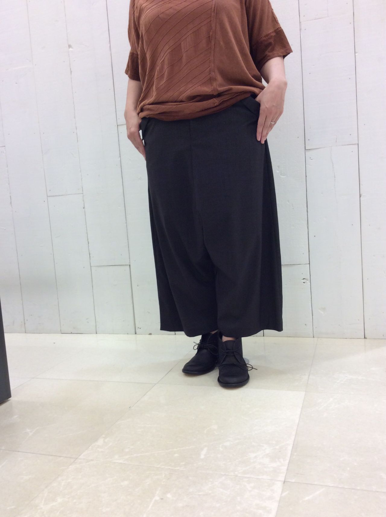 裾広めのサルエルパンツは、生地に落ち感や滑らかさがあり、股上の深いサルエルでありながら、カジュアルになり過ぎない印象です。