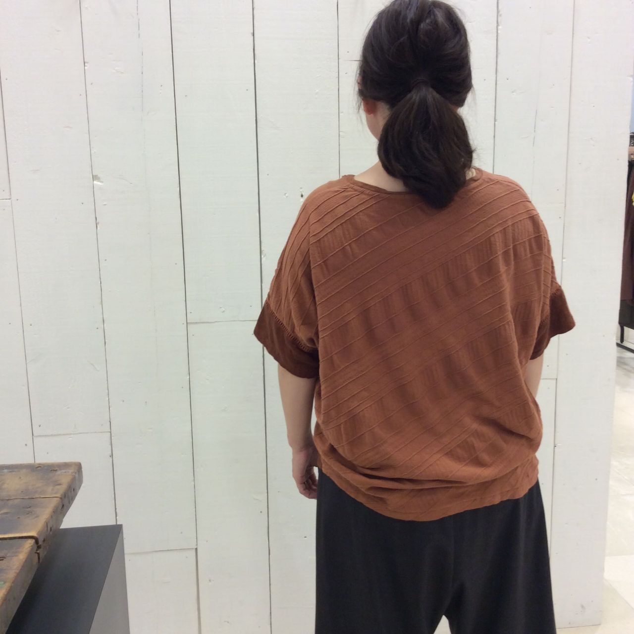 腰で止まる裾幅にしているのでパンツ、スカートにも合わせやすいシルエットです。