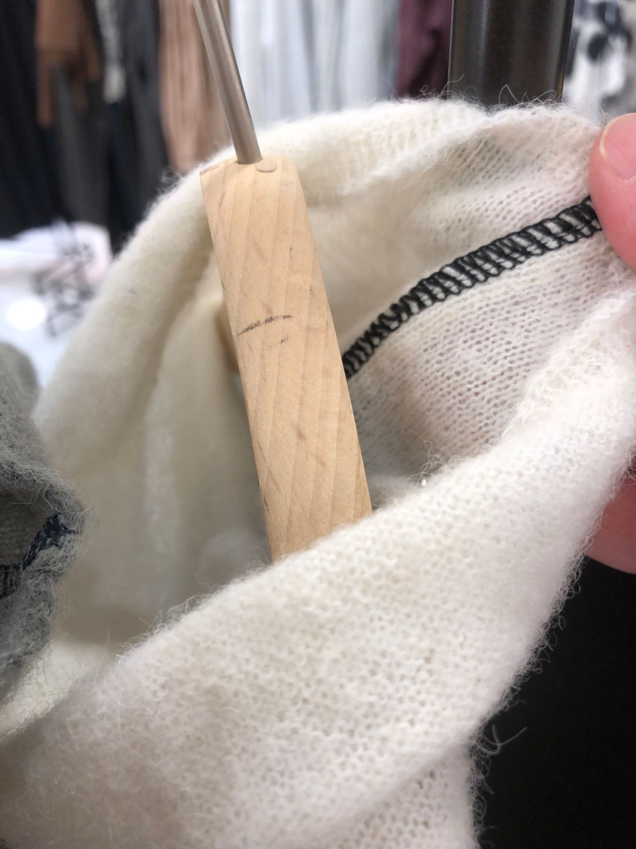 脇から袖下は、わざとロックステッチを表に出て配色にしています。