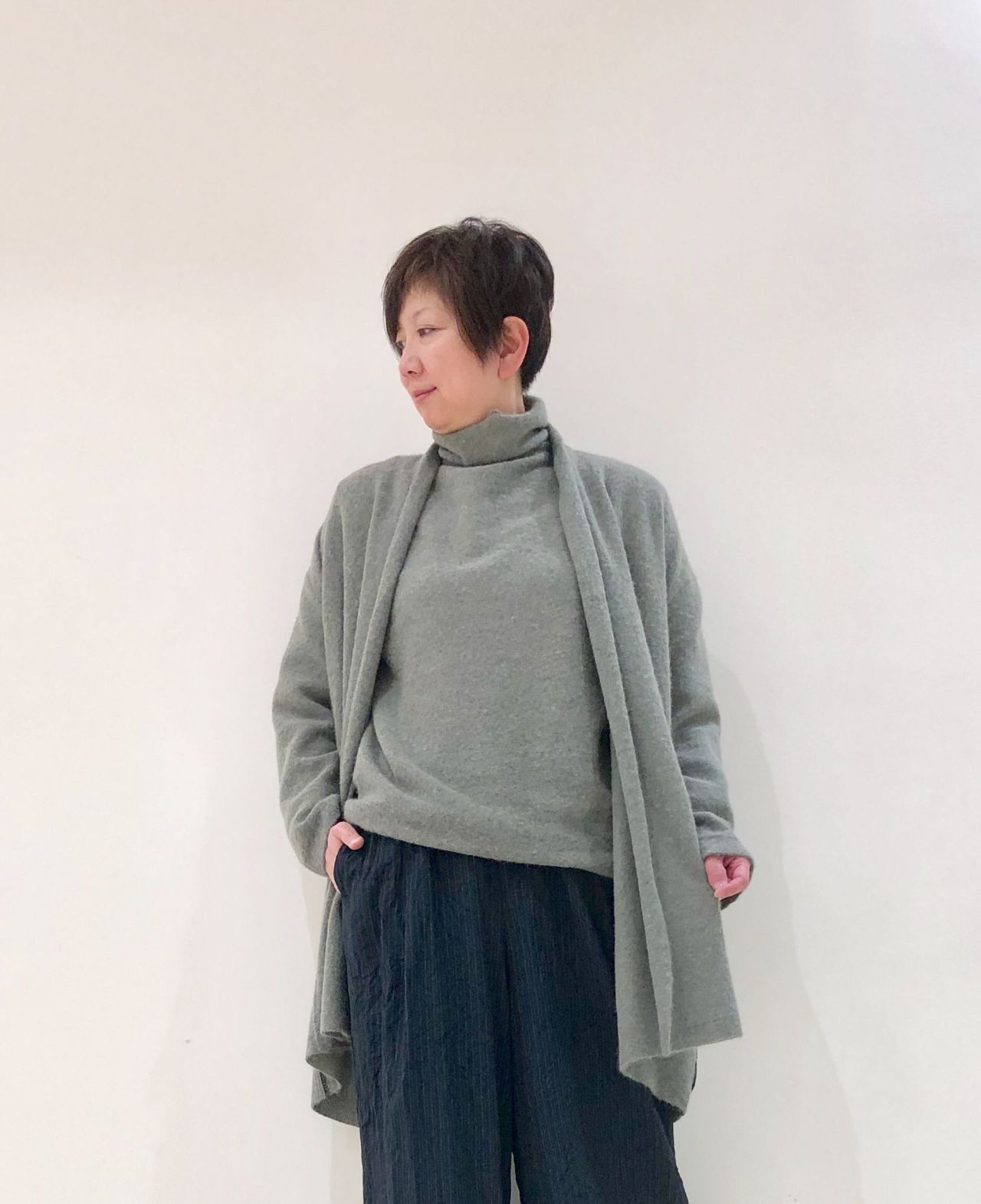 オフネックプルオーバーは甘く編んでいるのでインナーとの組み合わせを楽しめます。