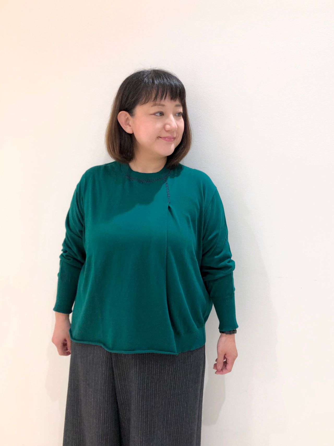 片方だけにタックが入っており、体に張り付かないデザインで、ボディラインが綺麗に見えます。